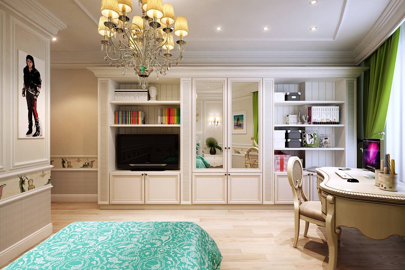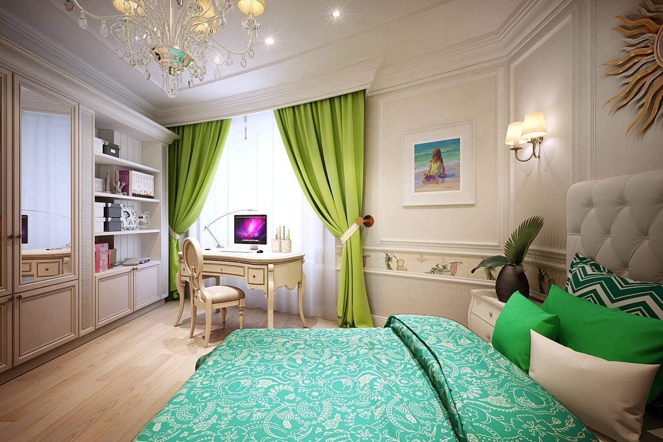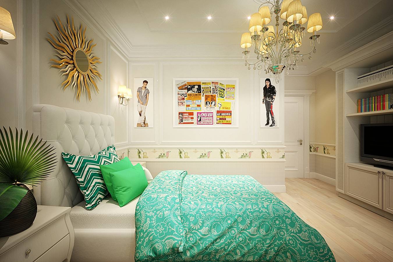 В первой комнате для отделки использованы бежевые и зеленые тона: от травяного до изумрудного. Зеленый цвет выбран неслучайно, он действует умиротворяющее на ребенка-энерджайзера. Детская не должна быть слишком серьезной, в ее оформлении должны найти отражение вкусы и пристрастия ее владельца. Например, яркие постеры кумиров молодежи.