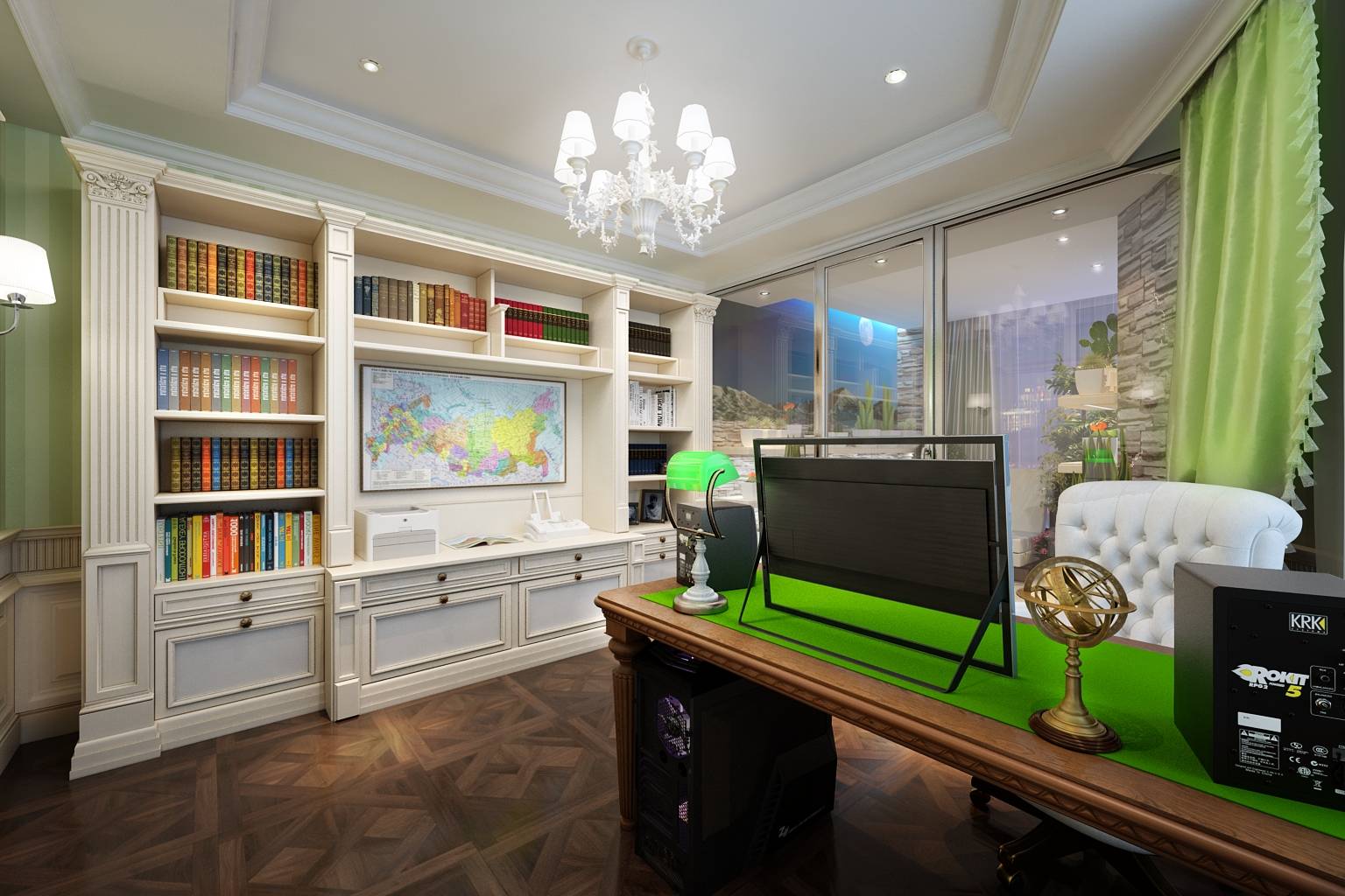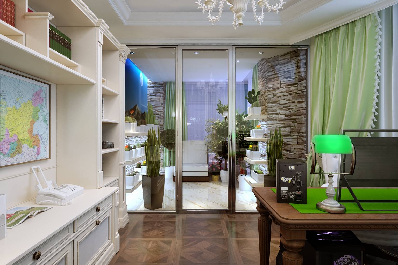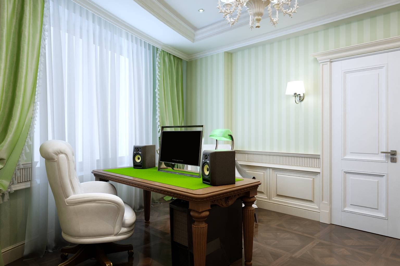 Кабинет оформлен в классическом стиле и цвете – зеленое сукно стола, лампа и портьеры с бахромой. Но при этом он вовсе не скучен и имеет своим продолжением великолепный зимний сад.