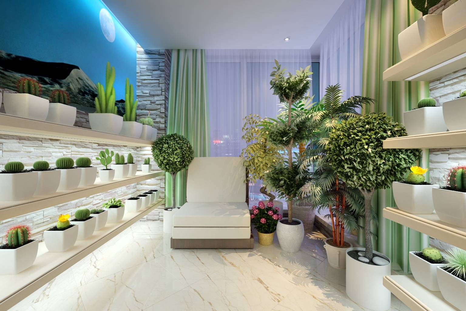 Изюминкой интересного дизайна квартиры, безусловно, является зимний сад с отделкой мрамором и необработанным камнем. Вход осуществляется из кабинета. Разделяет помещения огромная стеклянная дверь.