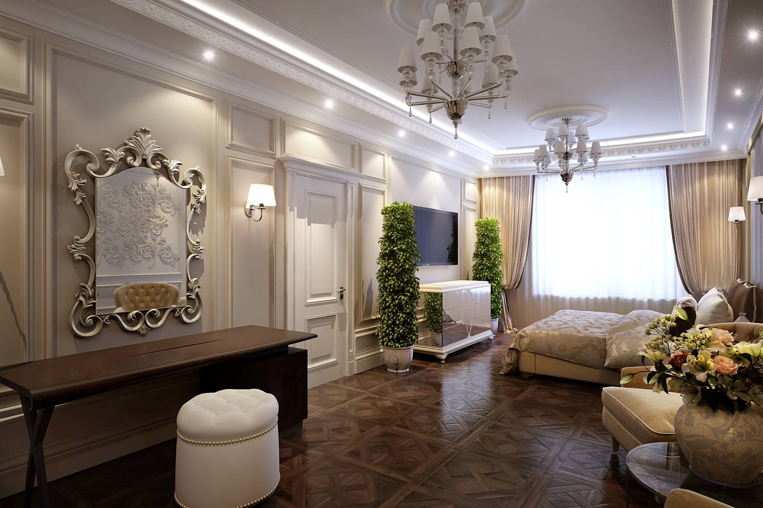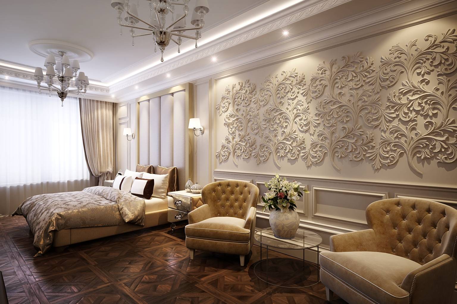 Что касается второго – дизайнер выбрал в качестве основного растительный декор. Он повторяется в настенном панно, отделке шкафа, раме зеркала и даже в рисунке постельного белья.