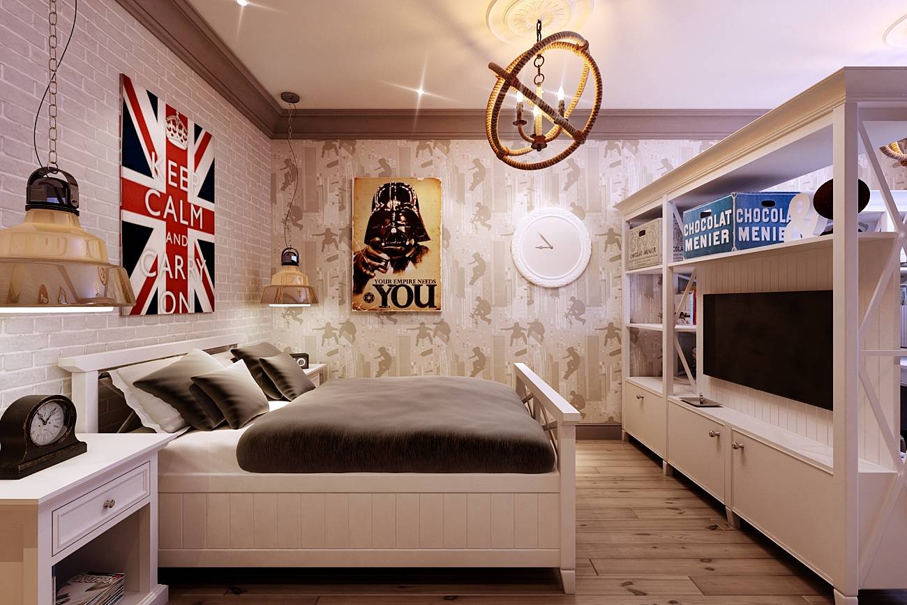 Комната для мальчика решена в аскетичном стиле. Отделка стены под кирпич и обои спортивной экстрим-тематики, необычный декор и аксессуары, которые так любят тинейджеры.