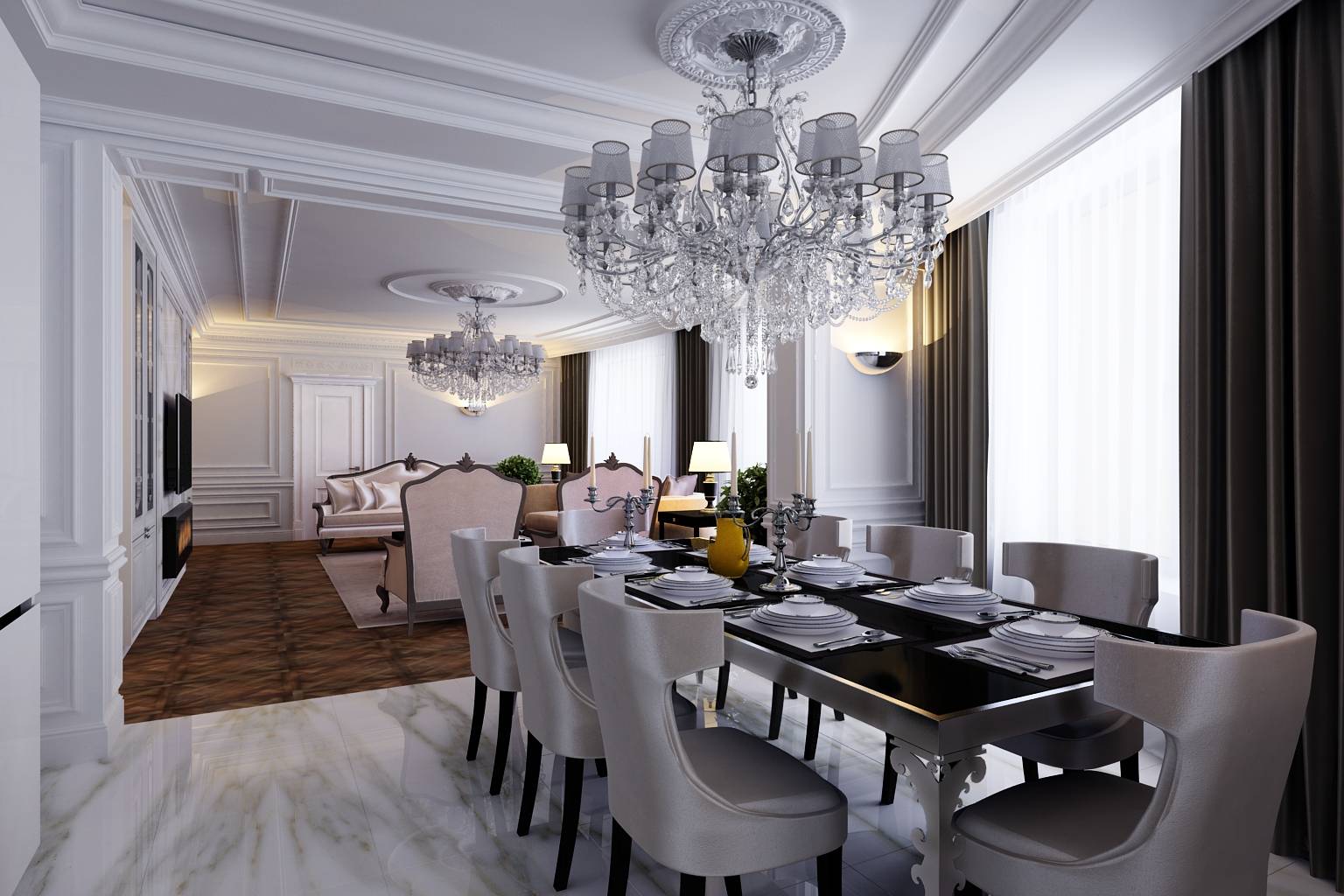 - мраморный пол отделяет зону столовой, благородный паркет – зону гостиной.