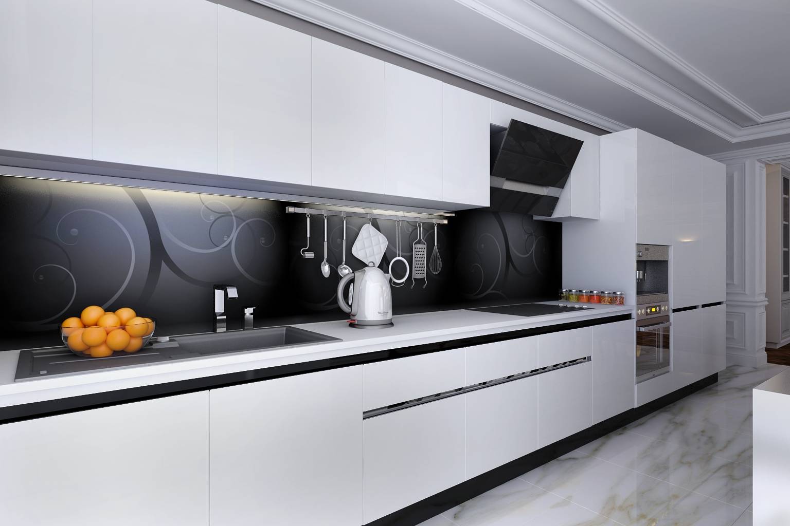 - белые фасады кухонного гарнитура и контрастный черный фартук с фантазийным орнаментом;