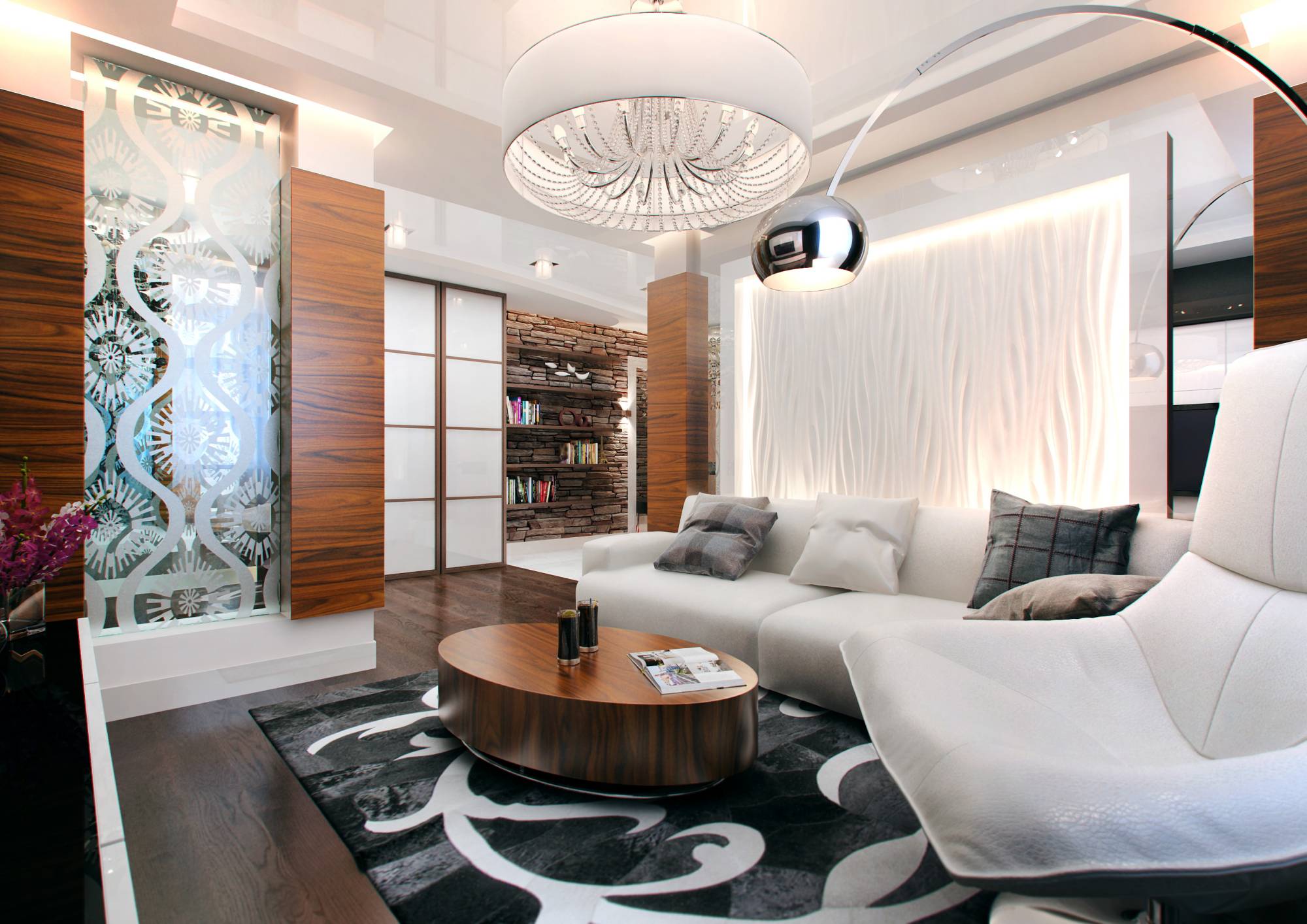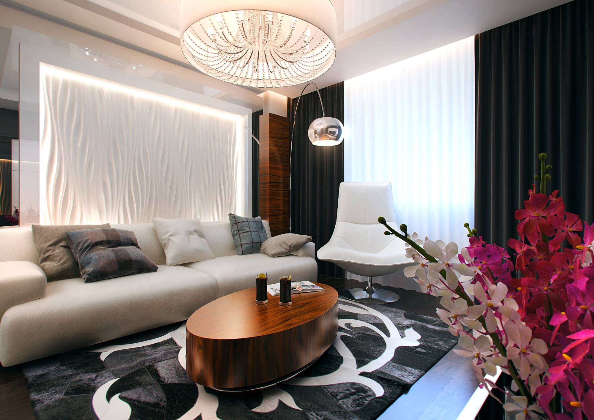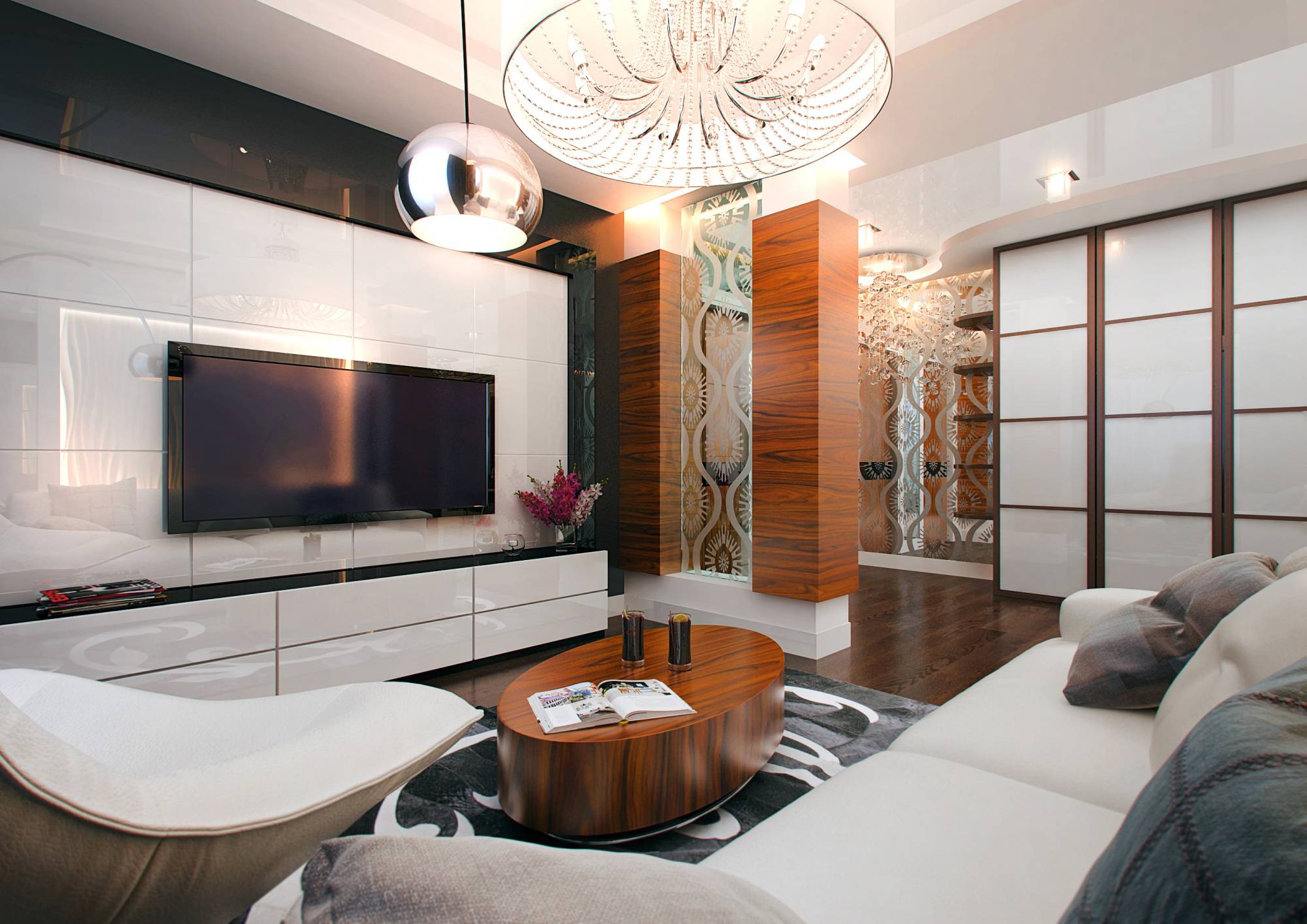 Глянцевый натяжной потолок, люстра, диван и кресло, декоративное панно с подсветкой, консоль с плазмой.