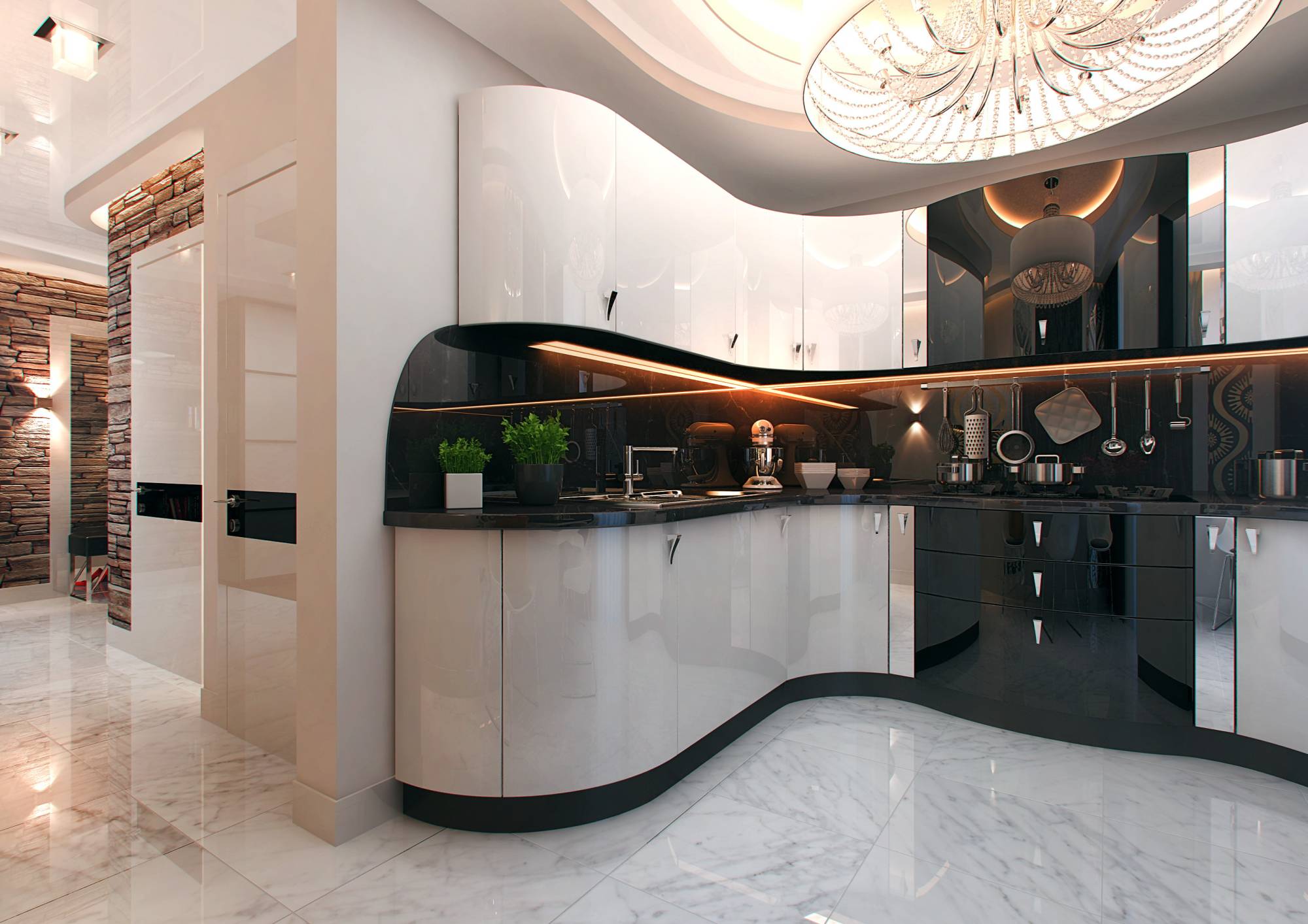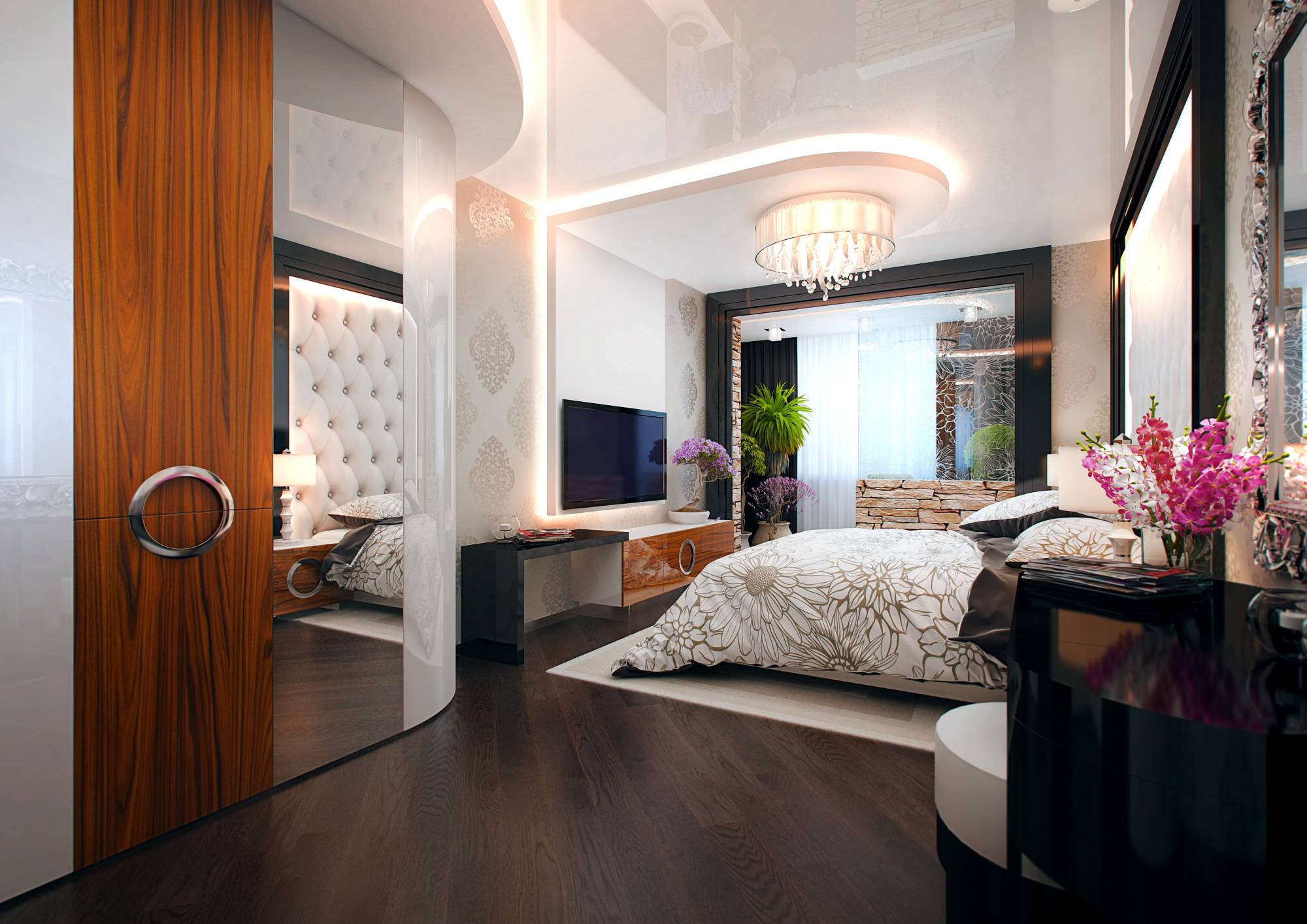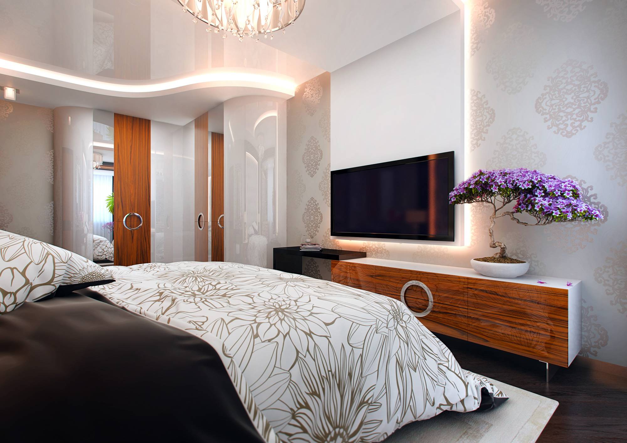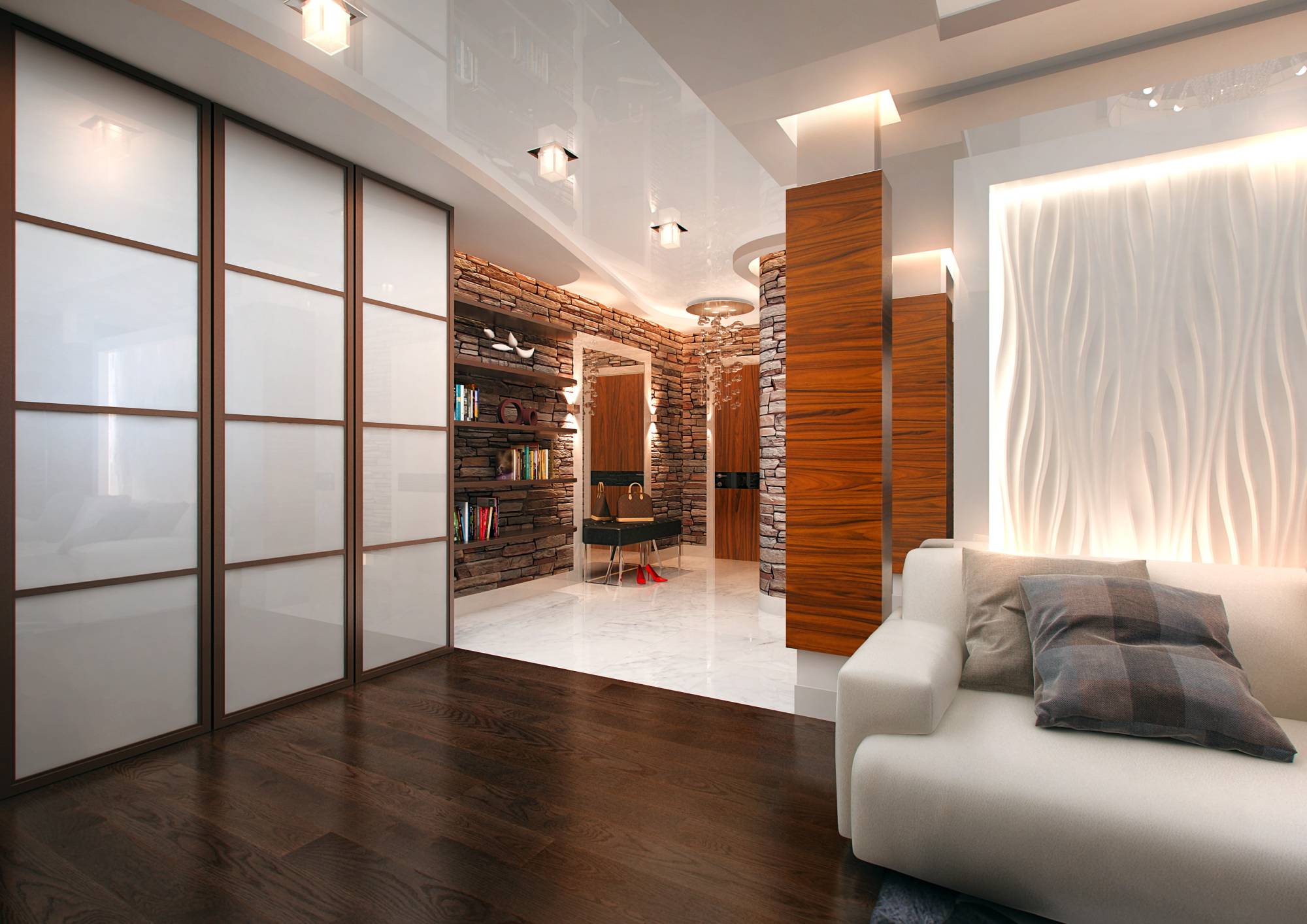 Глянцевый натяжной потолок, люстра, диван и кресло, декоративное панно с подсветкой, консоль с плазмой.