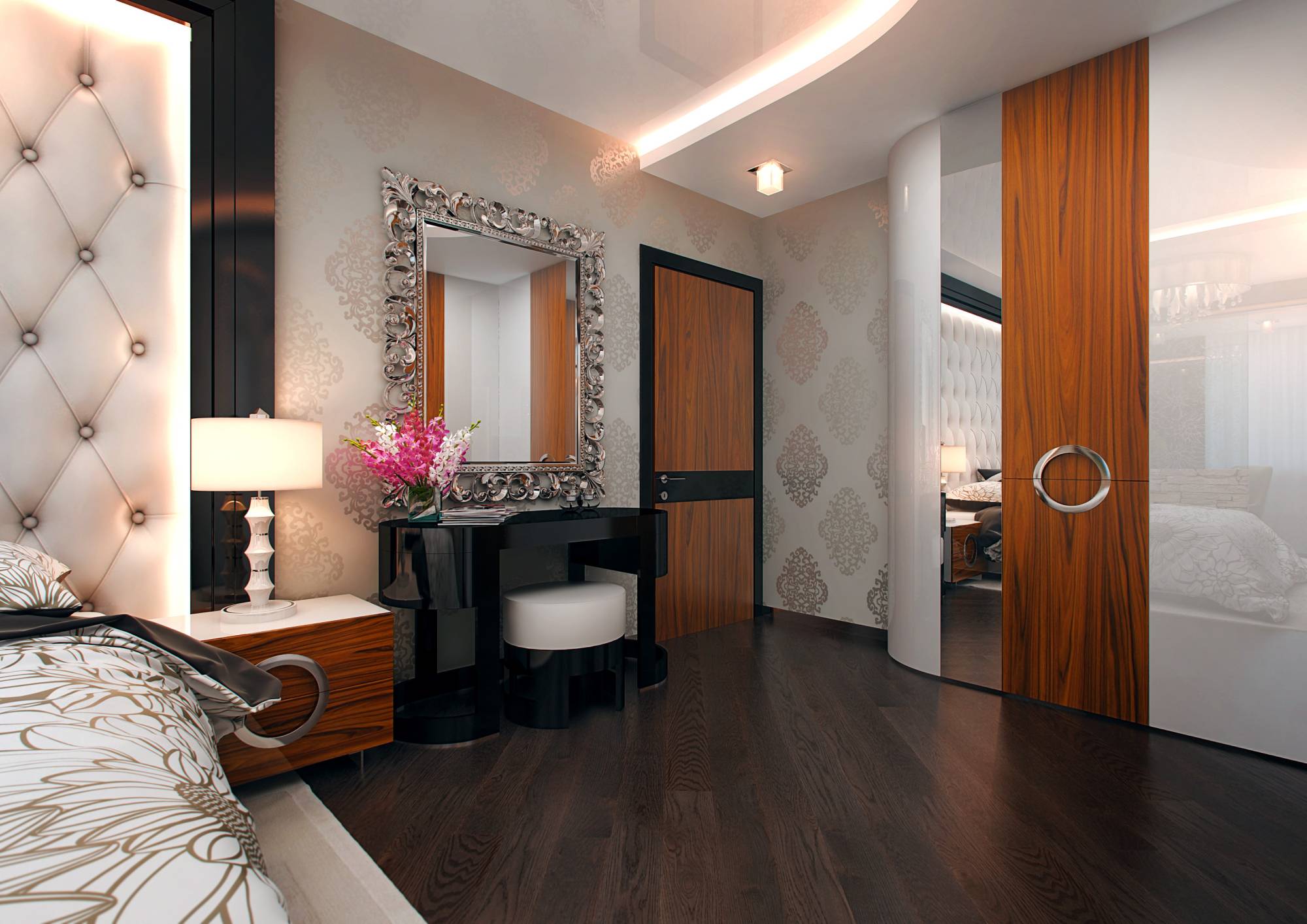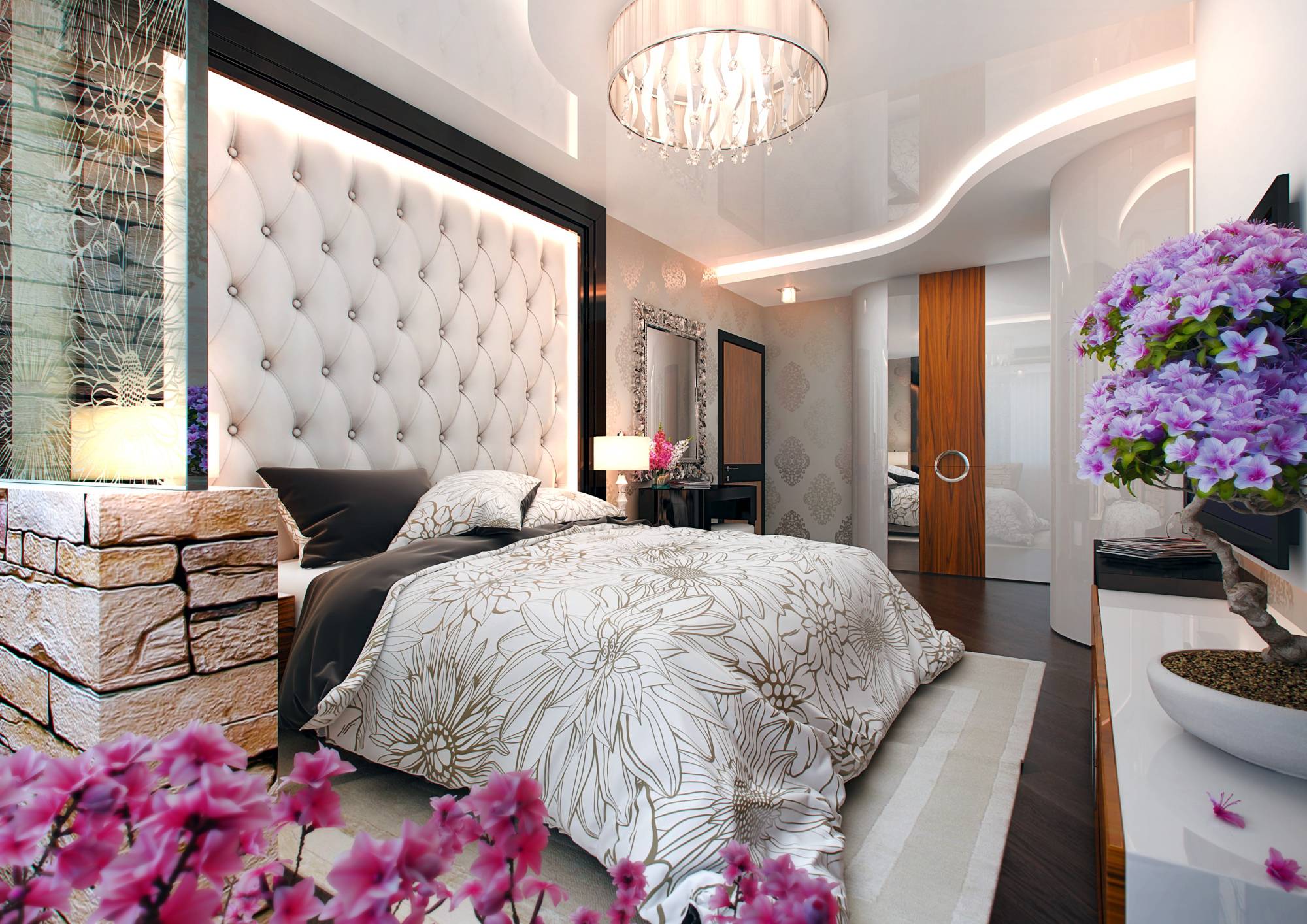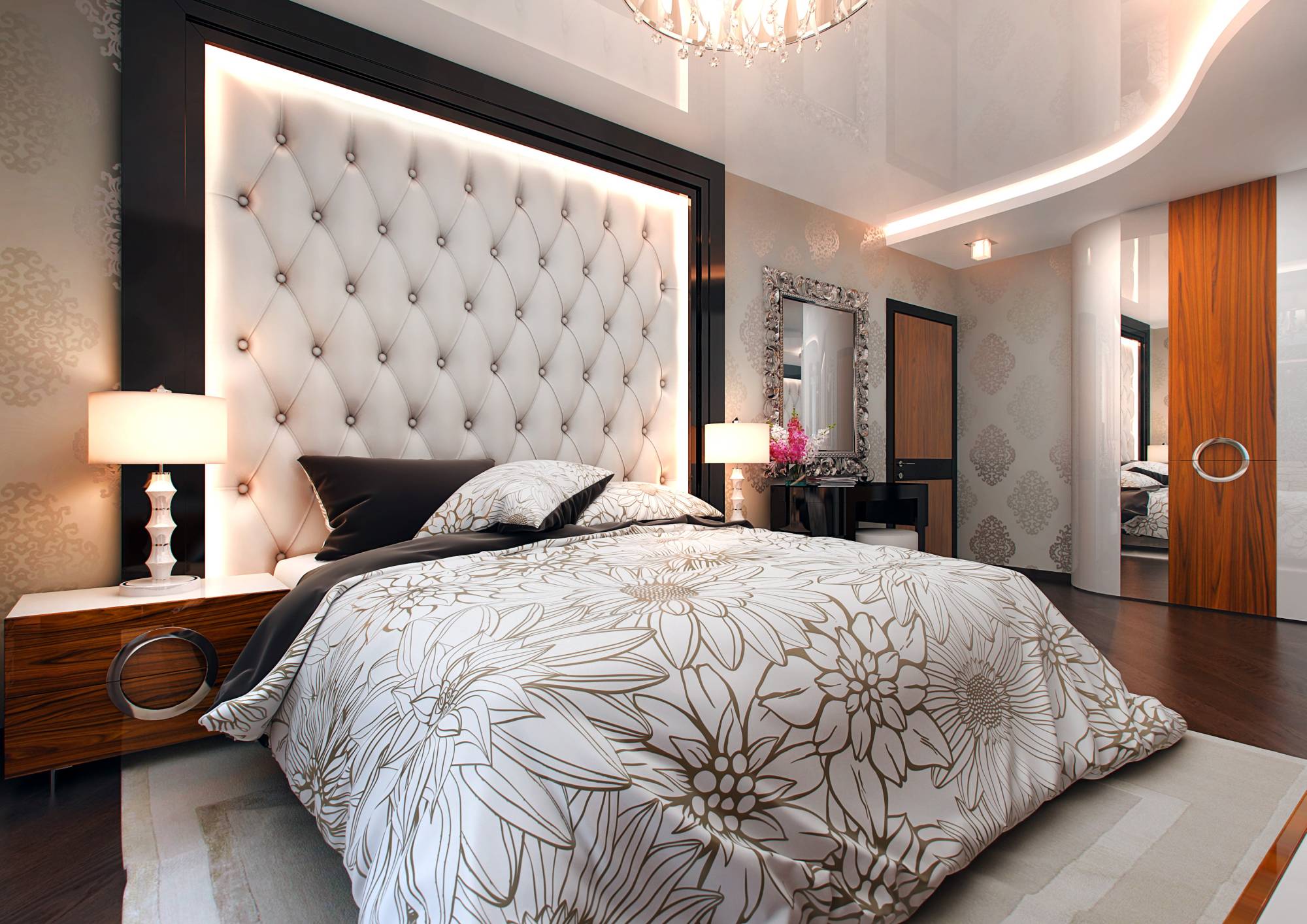 Высокое, до потолка, белое изголовье кровати, обрамлено в черную раму. Такая же черная рама очерчивает выход на балкон, который совмещен со спальней.