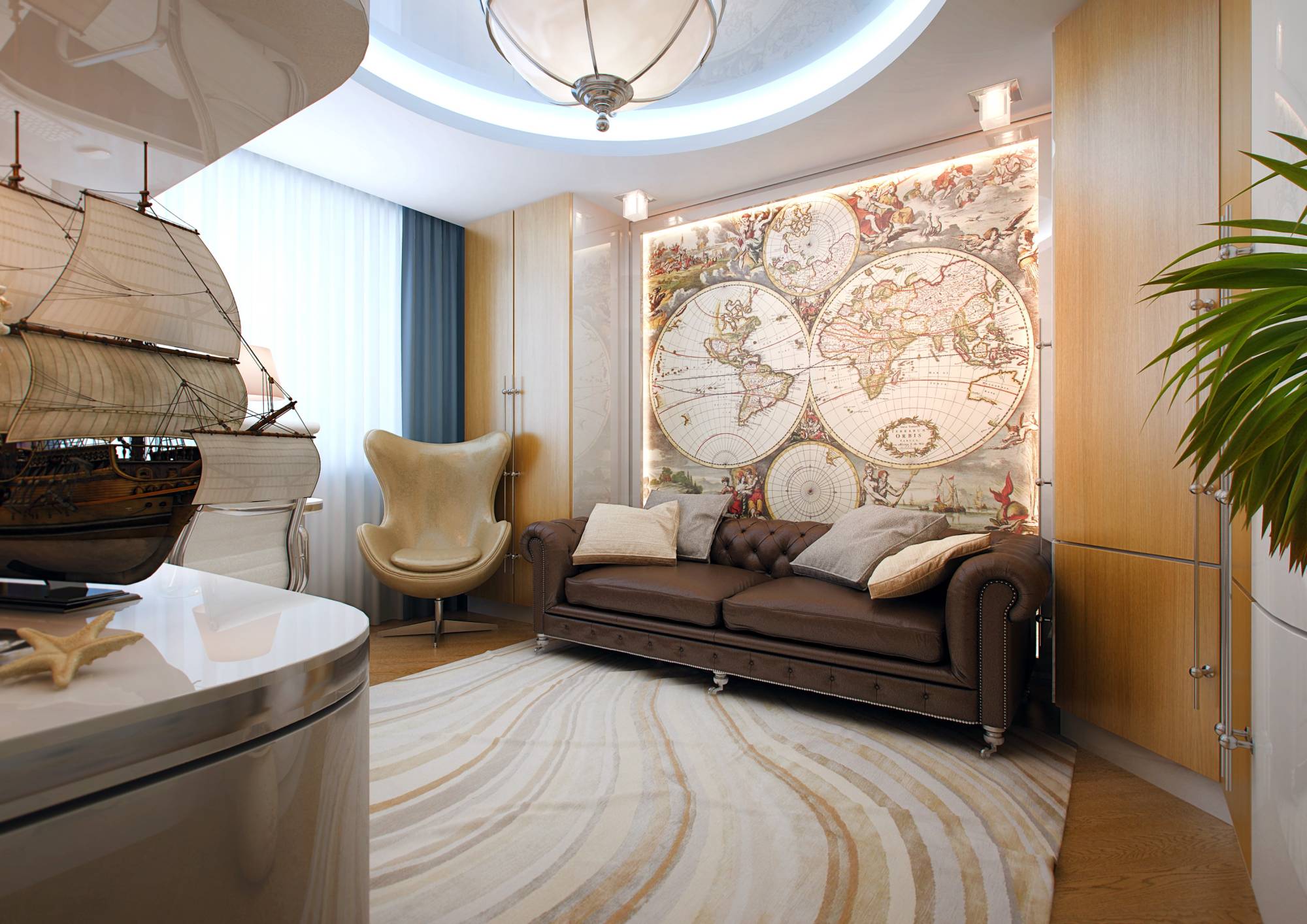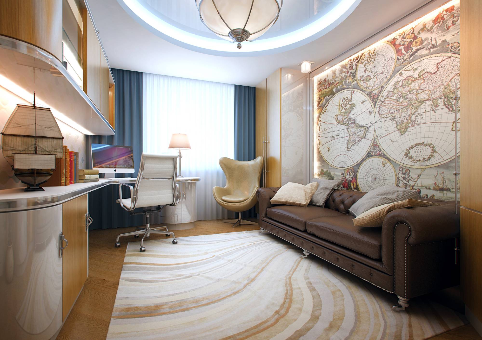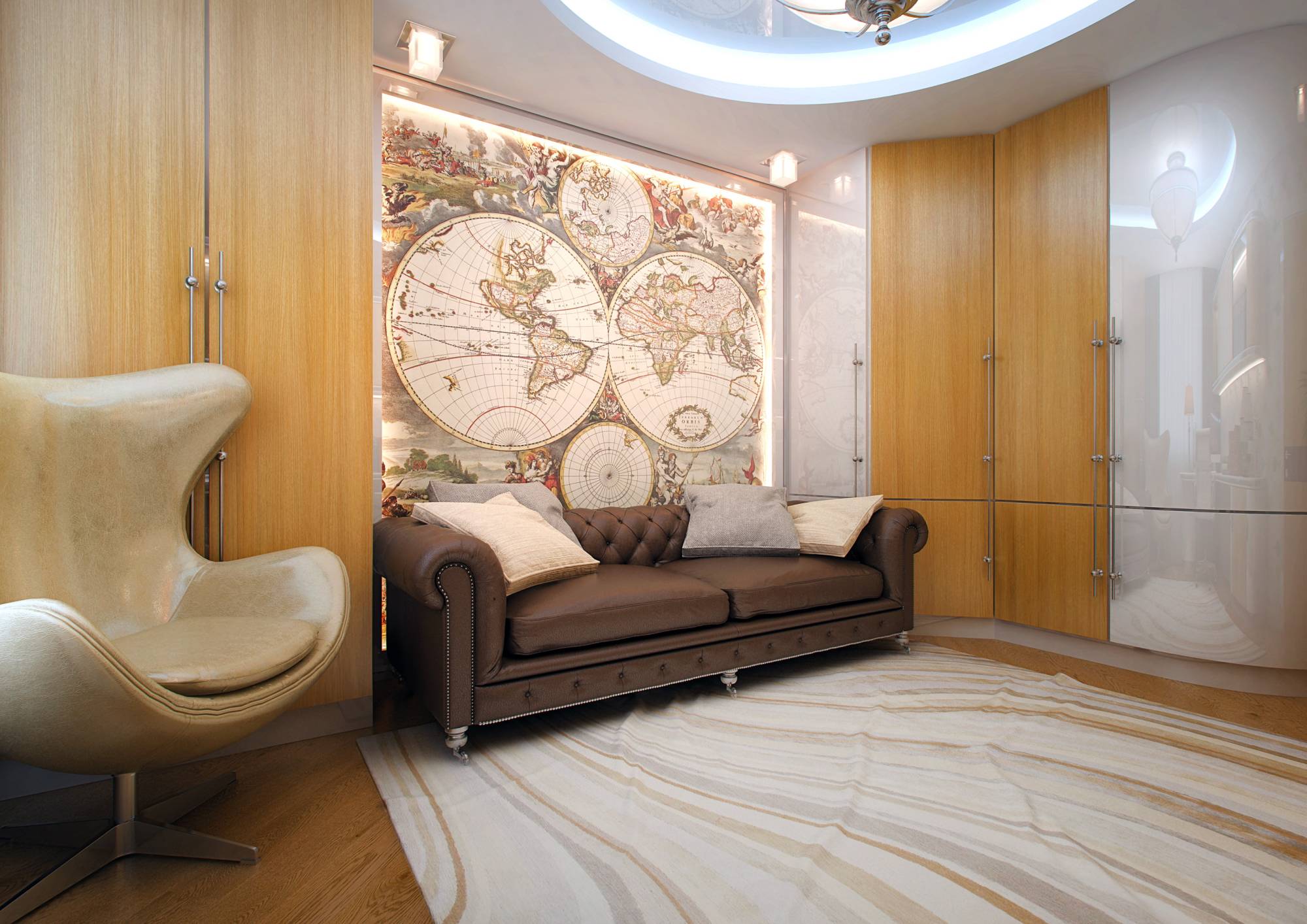Диван – классический Chesterfield в современном прочтении, со стеганной кожаной обивкой. Кожаное кресло Egg Chair Arne Jacobsen Style. Дополняют картину радиусный шкаф и рабочая зона.