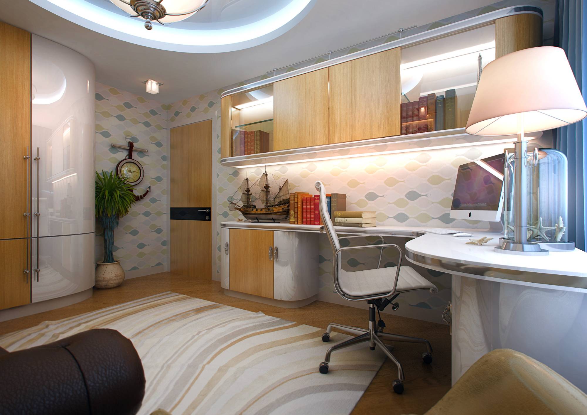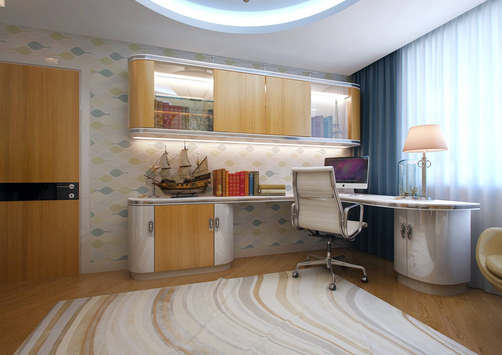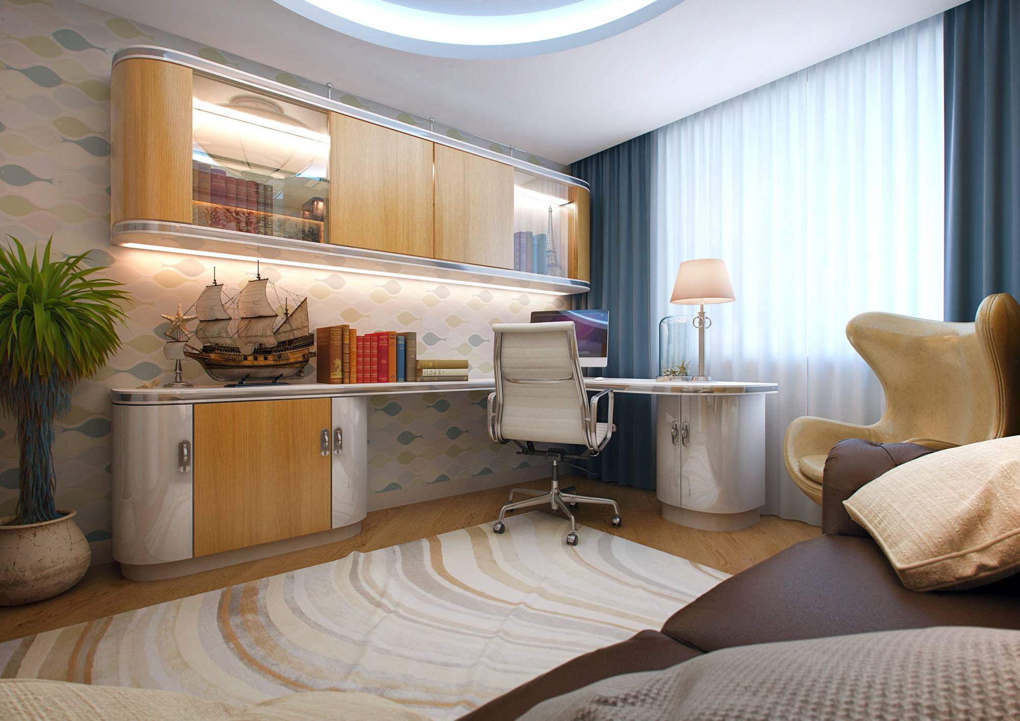 Диван – классический Chesterfield в современном прочтении, со стеганной кожаной обивкой. Кожаное кресло Egg Chair Arne Jacobsen Style. Дополняют картину радиусный шкаф и рабочая зона.