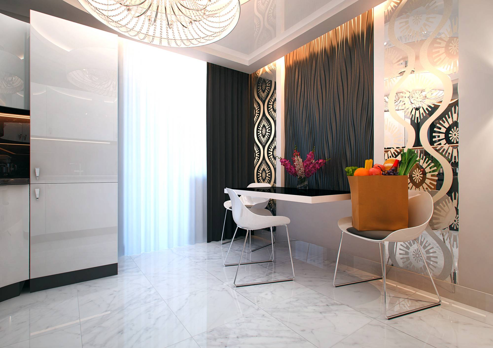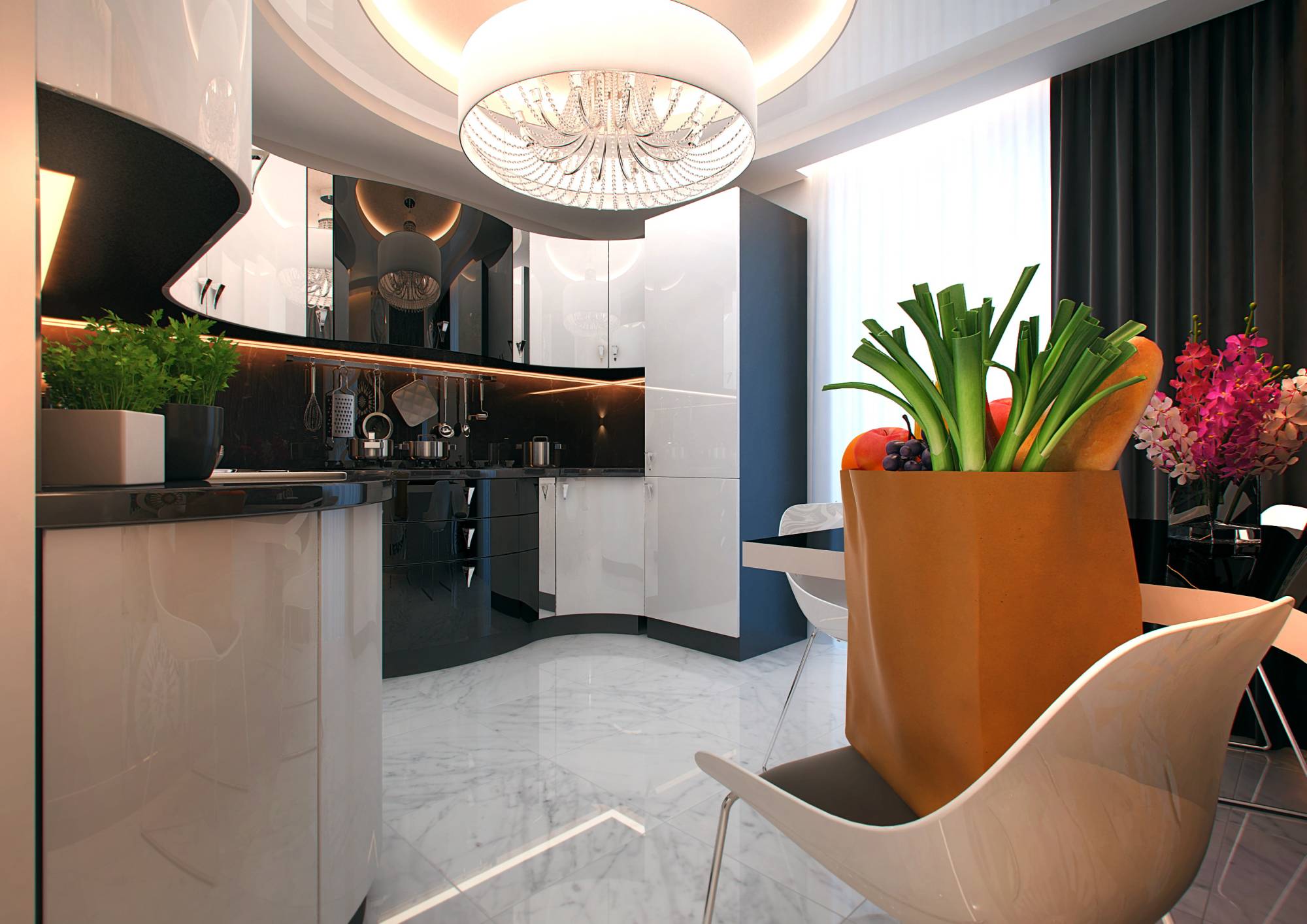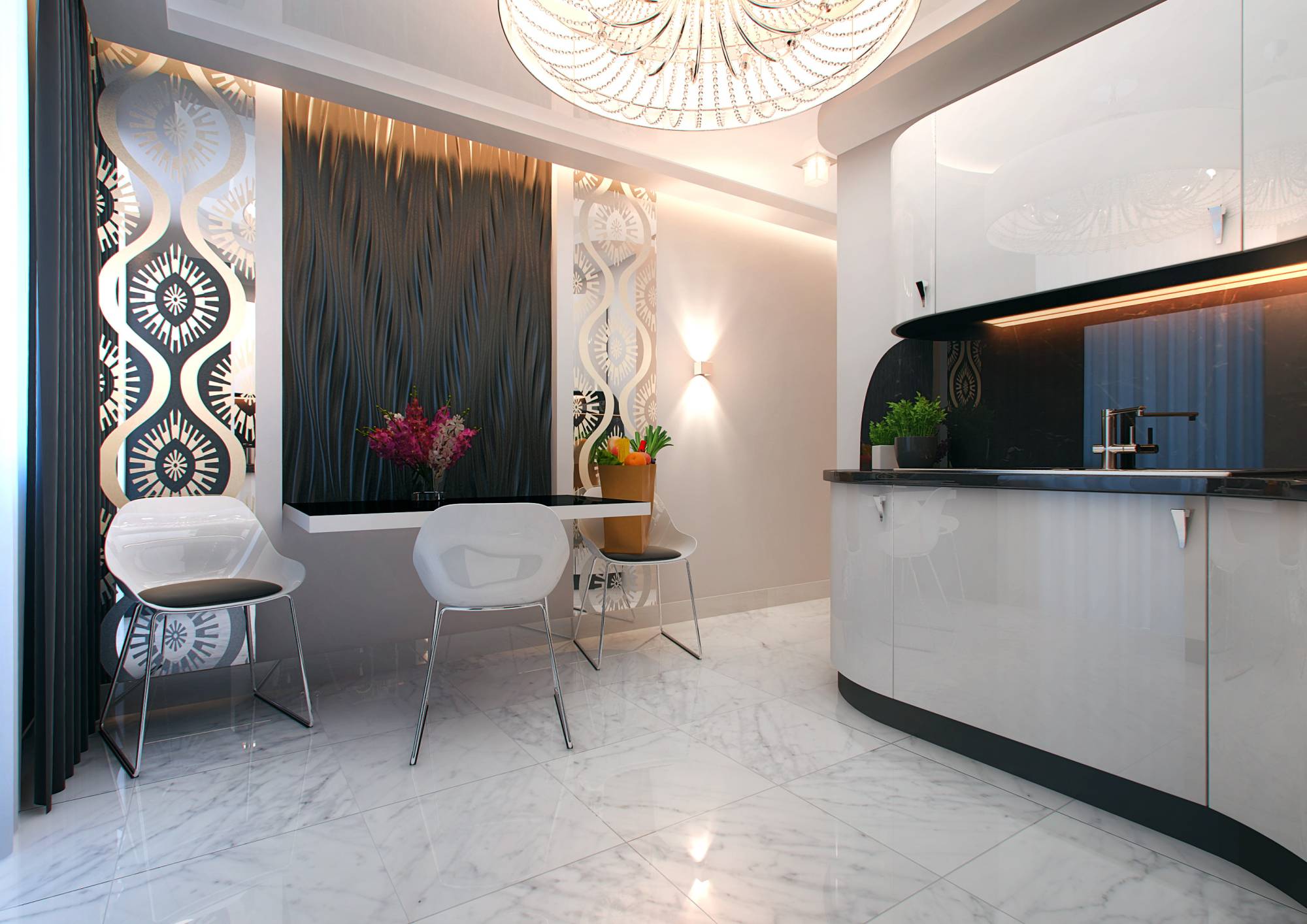 Черные глянцевые поверхности кухонного гарнитура, на которых особенно эффектно выглядят хромоникелевые кухонные приборы, черный обеденный стол и темные шторы контрастируют с белыми фасадами, стульями, отделкой стен и пола.