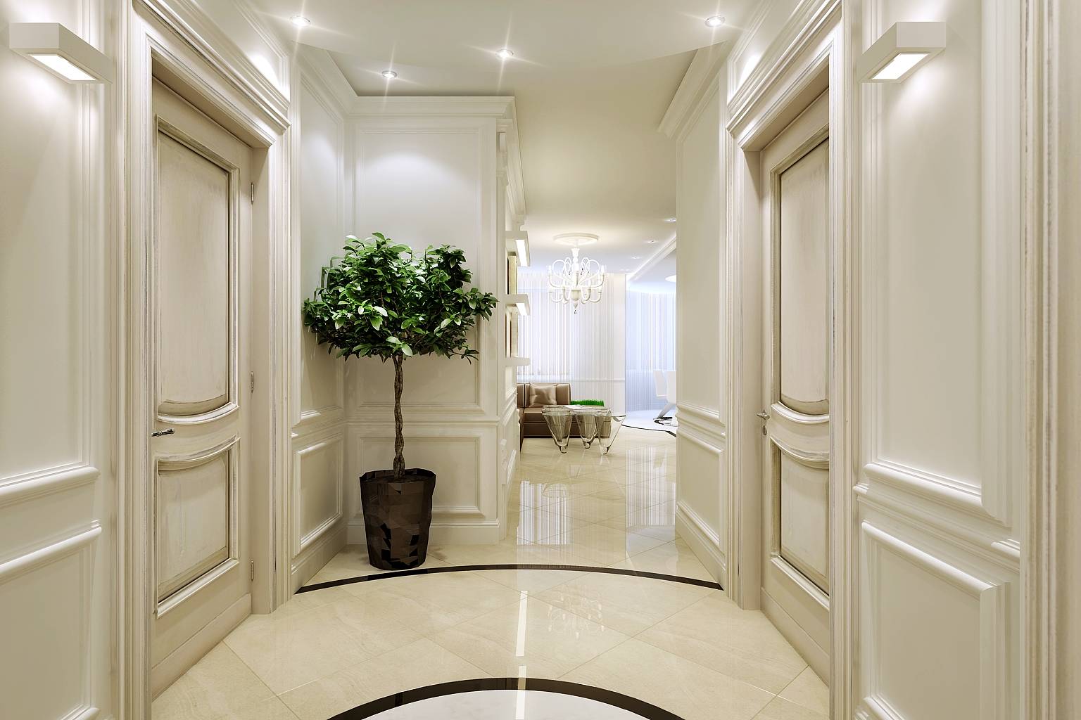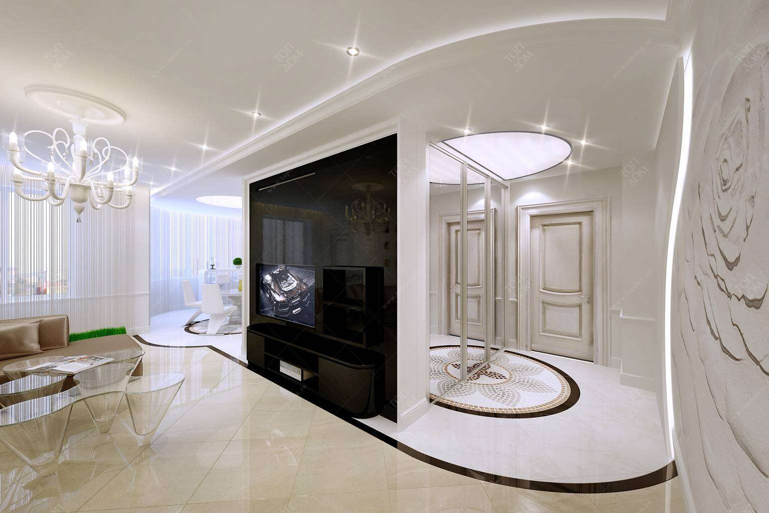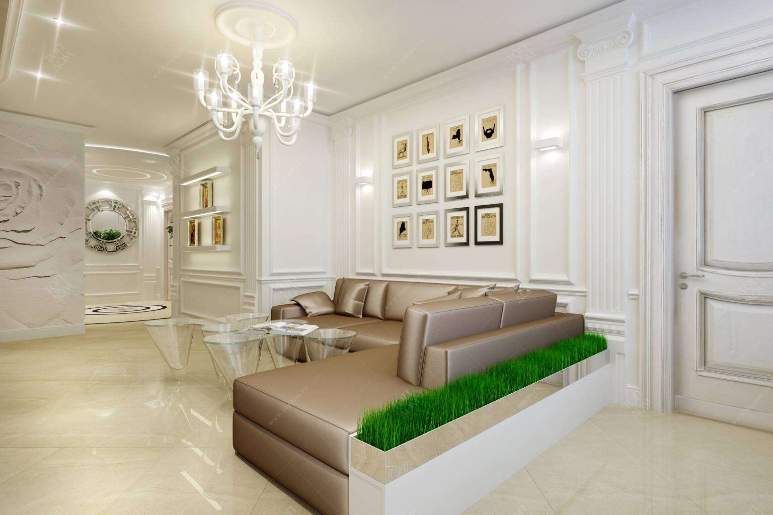 Гостиная впечатляет благодаря обилию белого цвета. При этом стены не выглядят прозаично. Дизайнер выбрал для одной стены декор в виде пилястр с каннелюрами в традиционном греческом стиле, а для другой – декоративное рельефное панно в виде цветка розы.