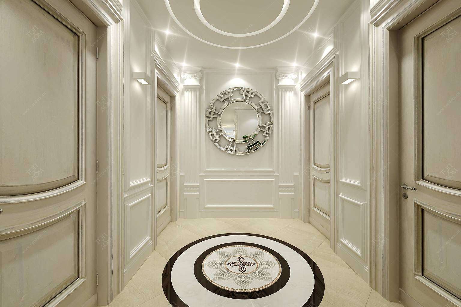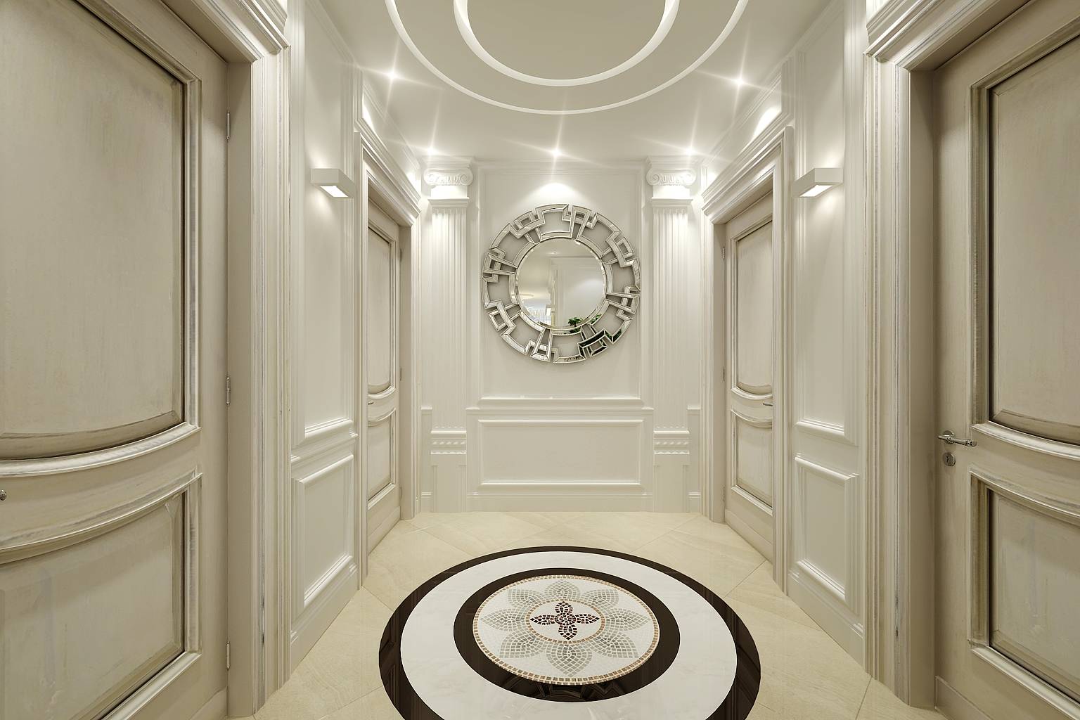 В интерьере холла развивается греческая тематика: белый цвет, мозаика с красивым узором, рама зеркала с классическим орнаментом.