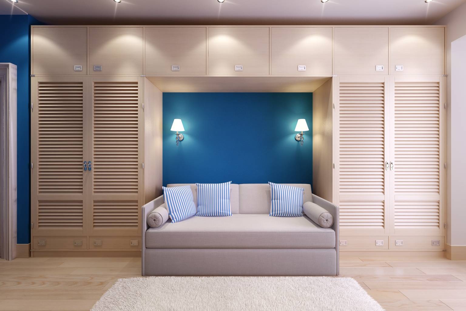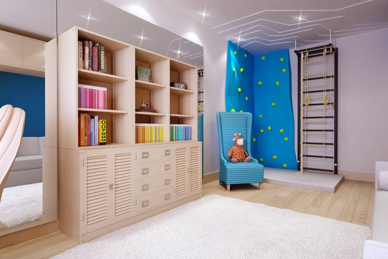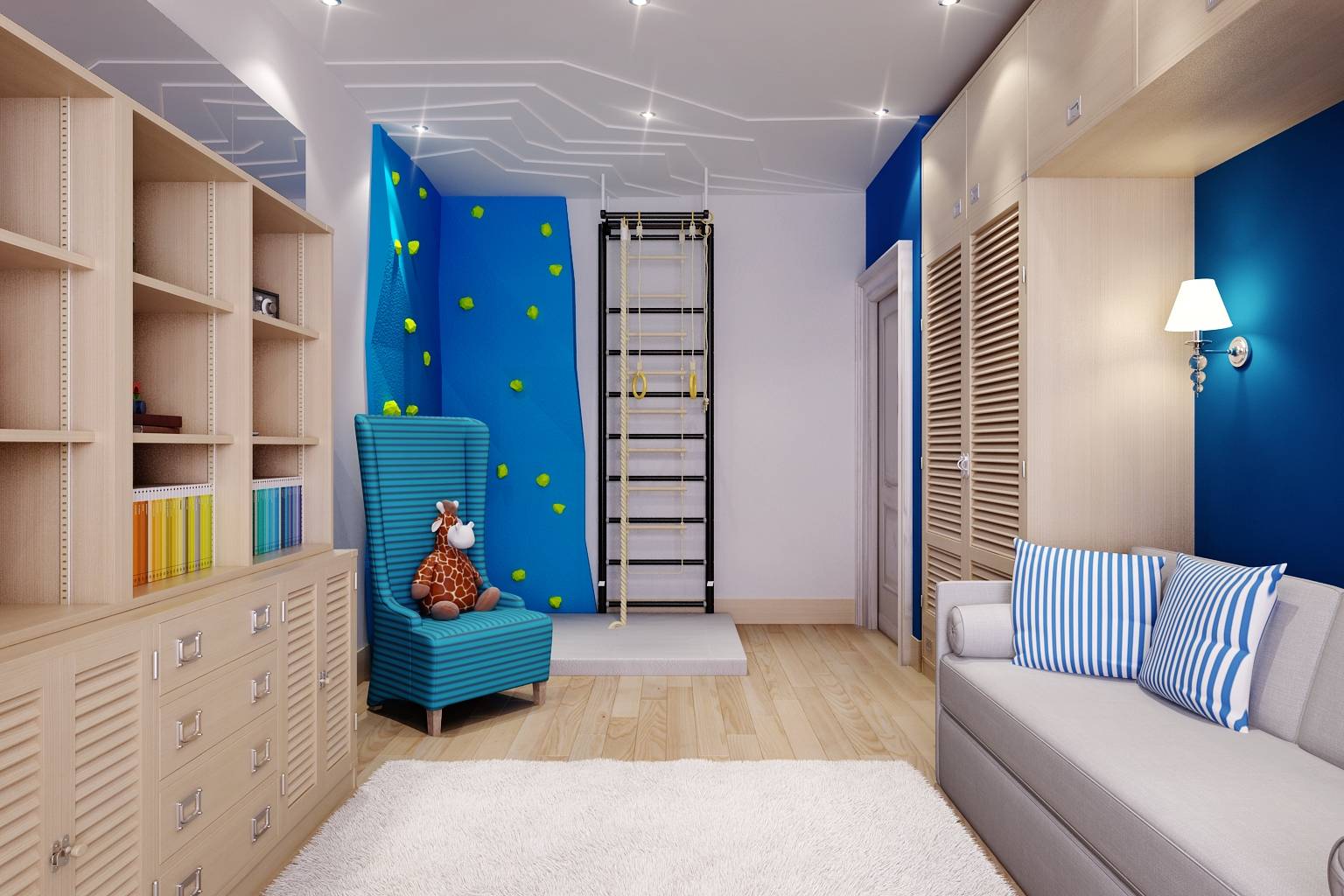 В противоположной стороне комнаты разместился спортивный уголок в голубых оттенках, которые повторяются в отделке стены и подушек.
