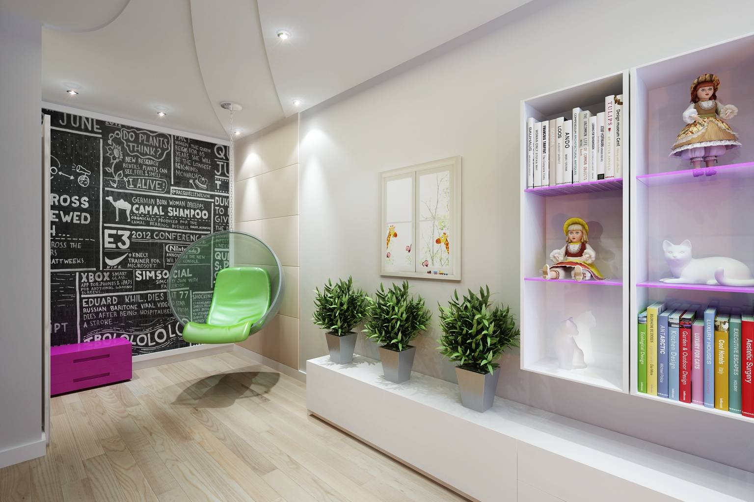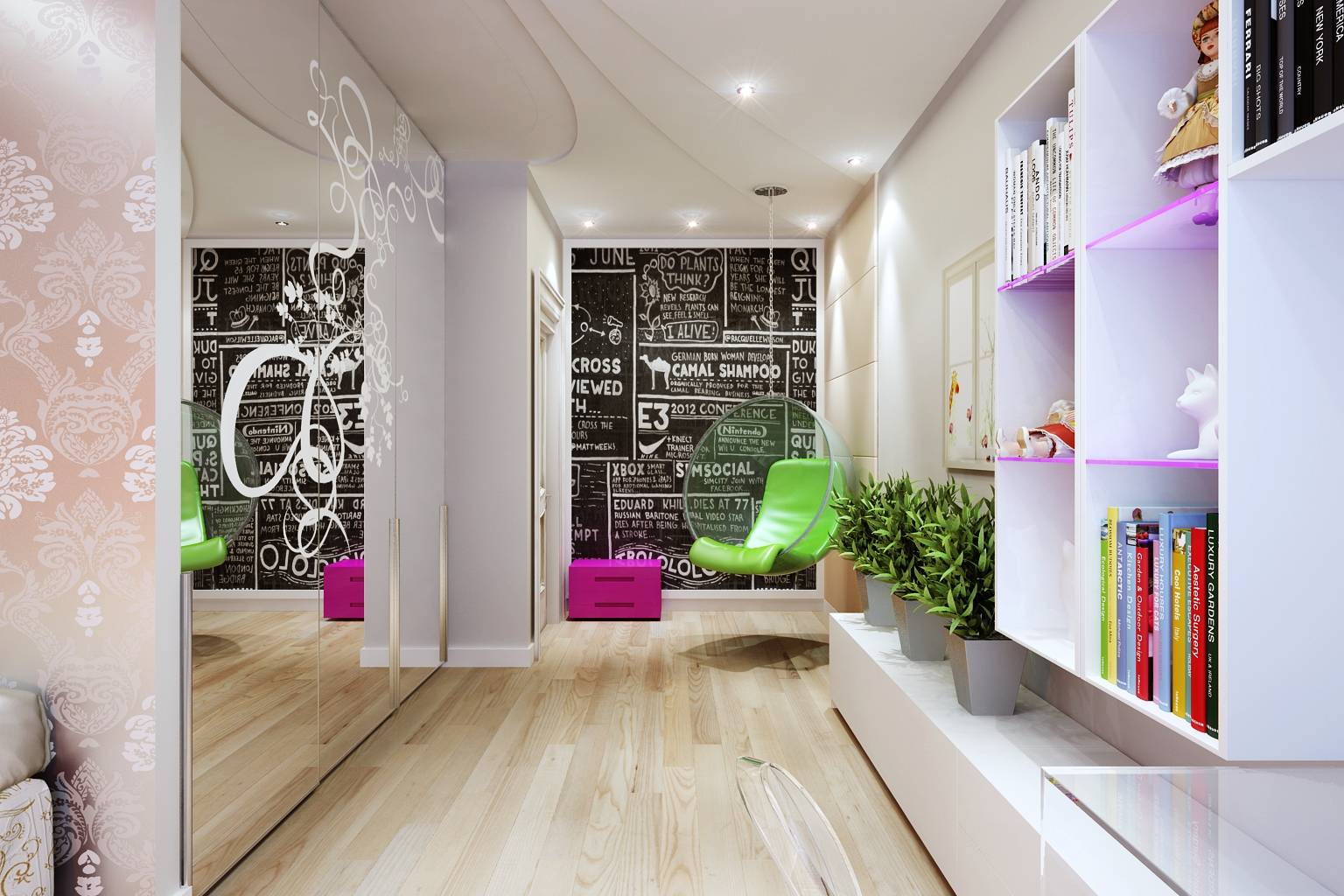 Комната для девочки – совсем «взрослая»: стильная мебель с рабочей зоной и знаменитым прозрачным креслом Louis Ghost от Kartell, а также не менее знаменитым подвесным креслом Bubble.