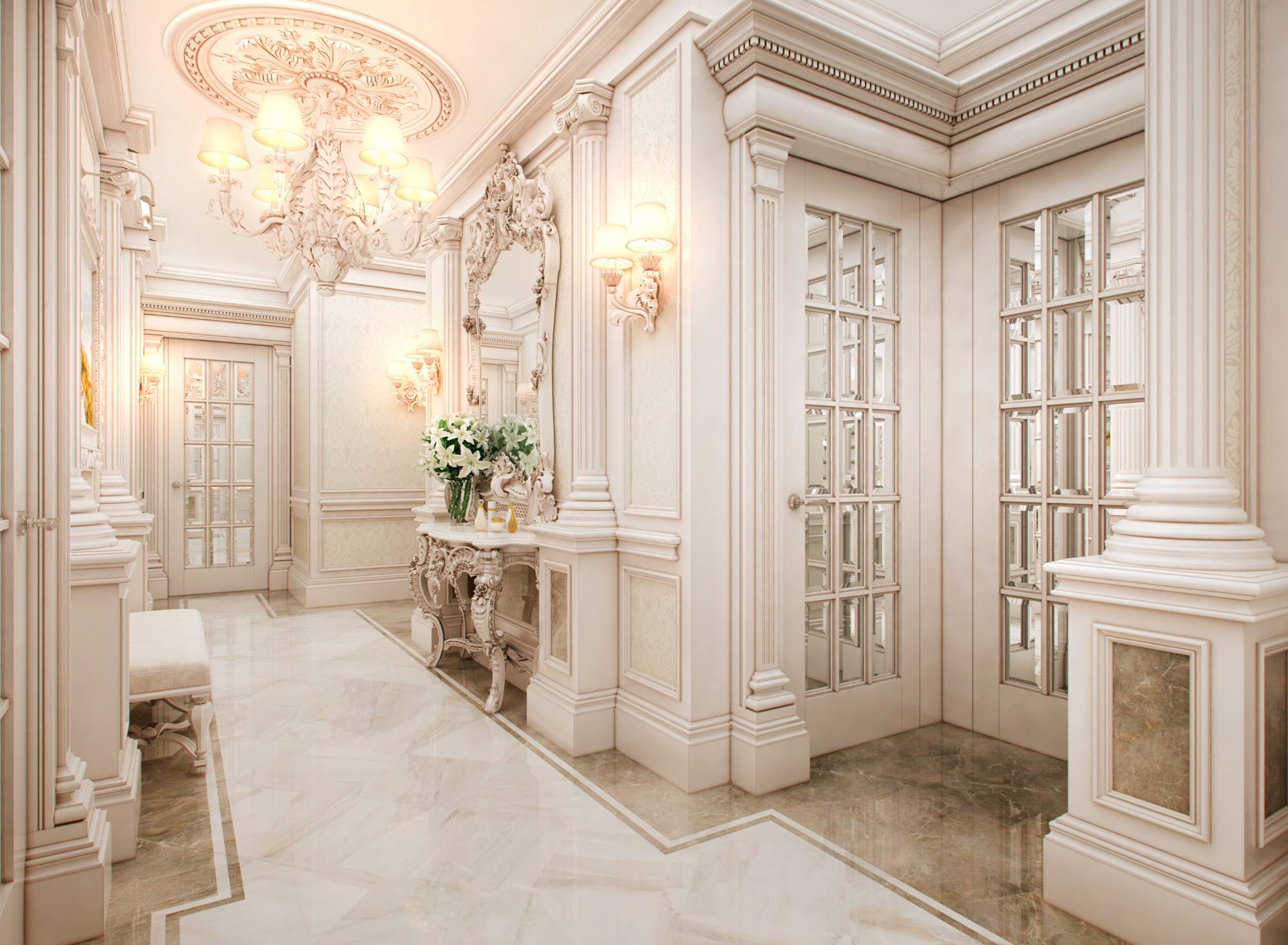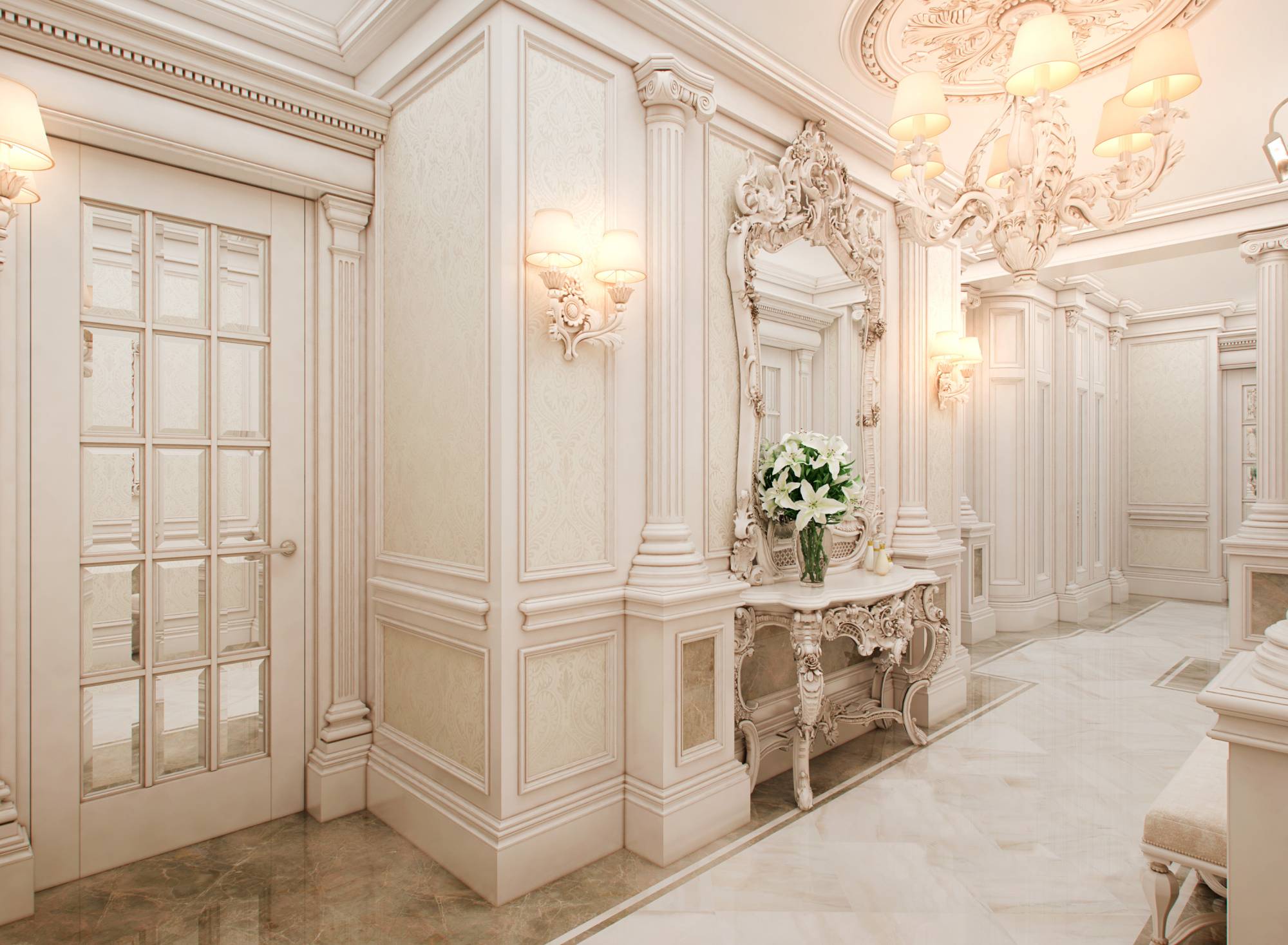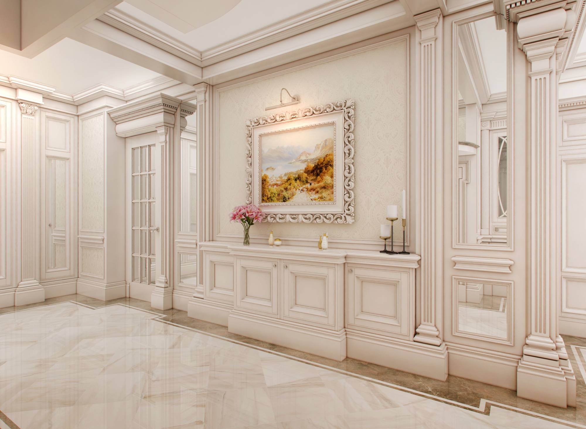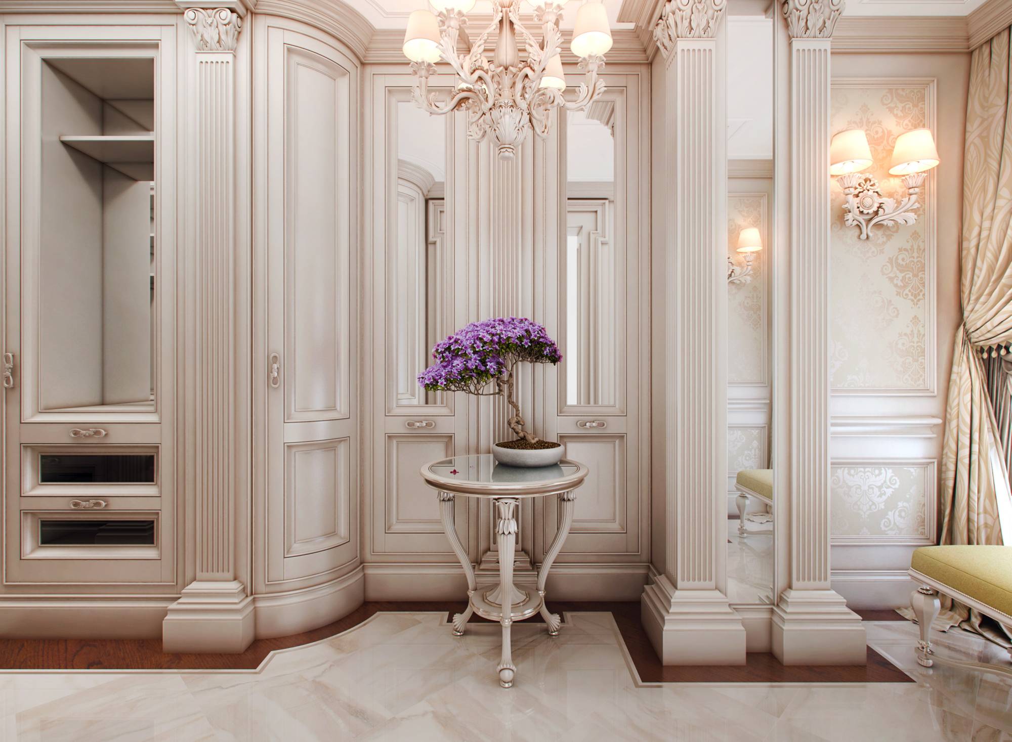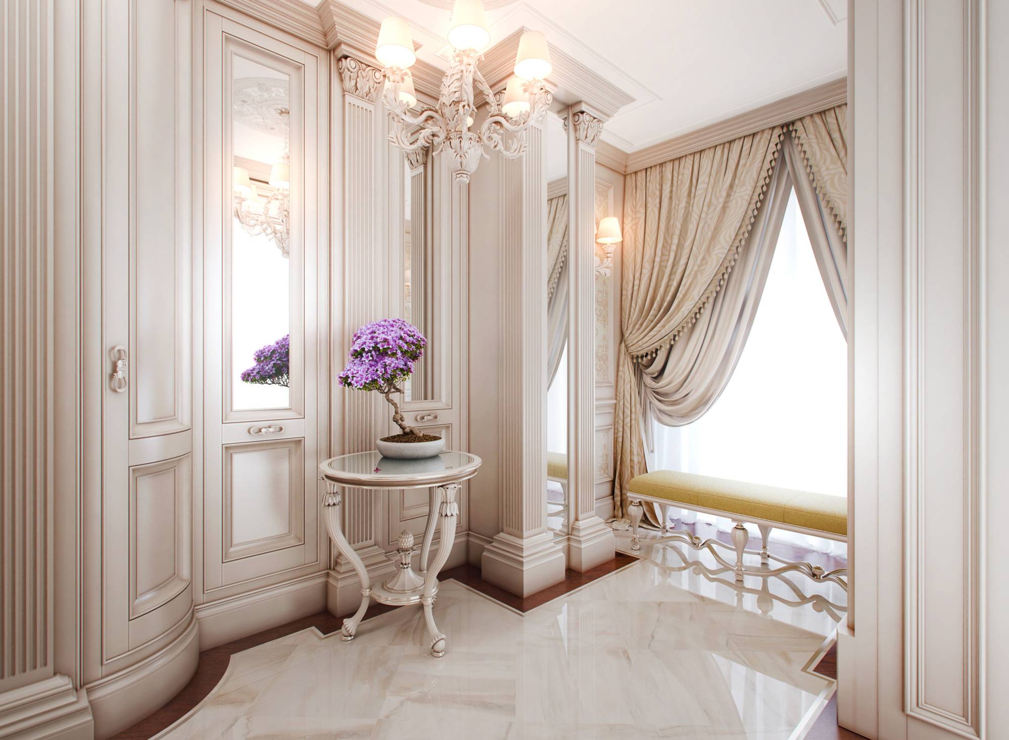 Холл в квартире широкий, просторный. Отделка в общем стиле – светлые оттенки, мрамор. Колонны, зеркальные двери, помпезная резная мебель — все «работает» на создание дорогого имиджа квартиры с первого взгляда.