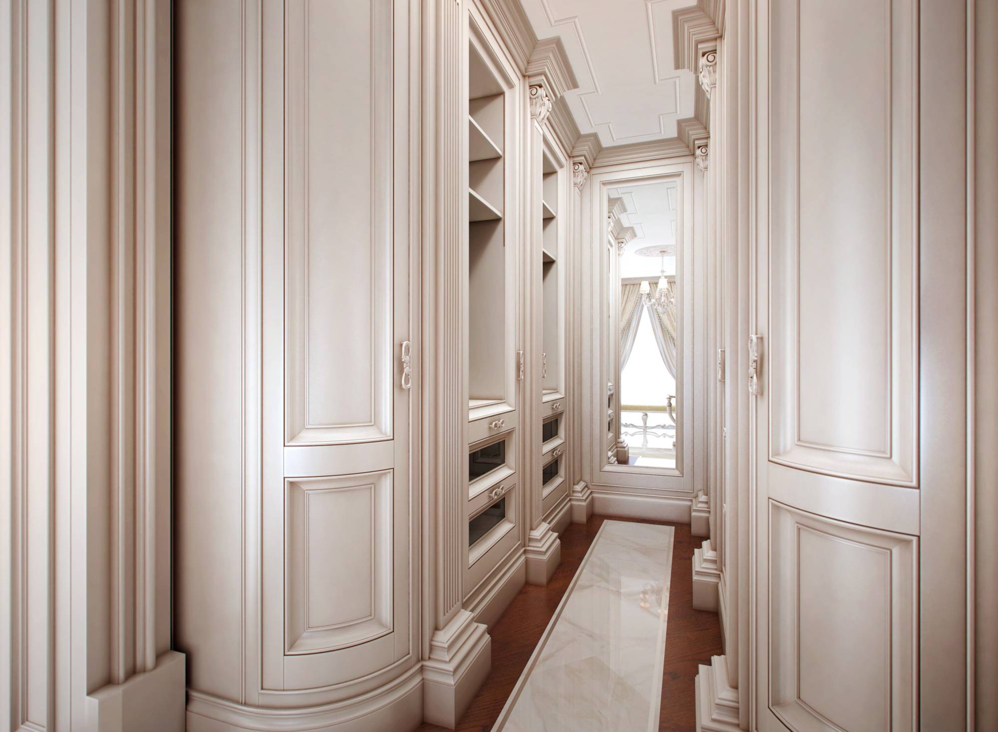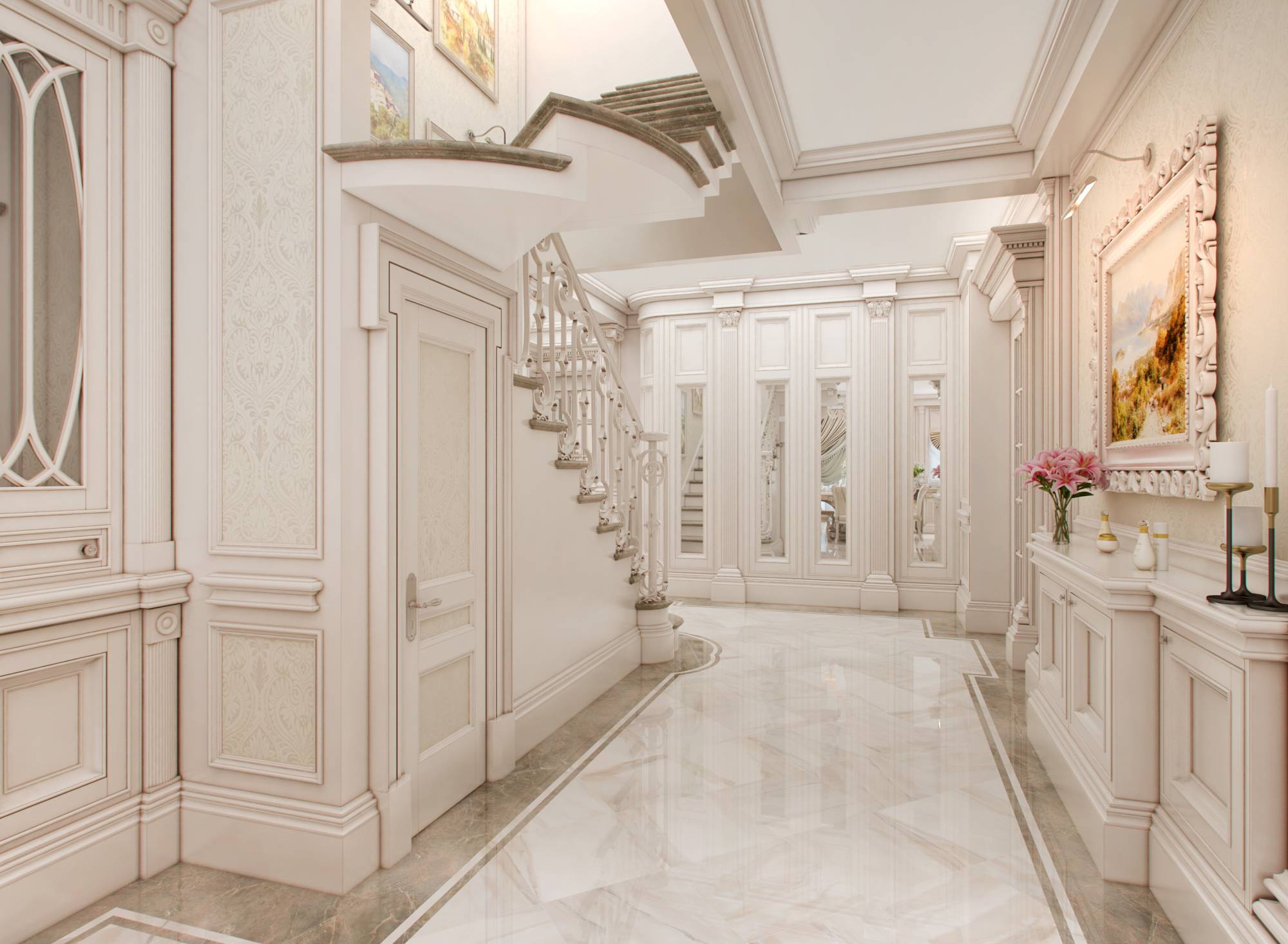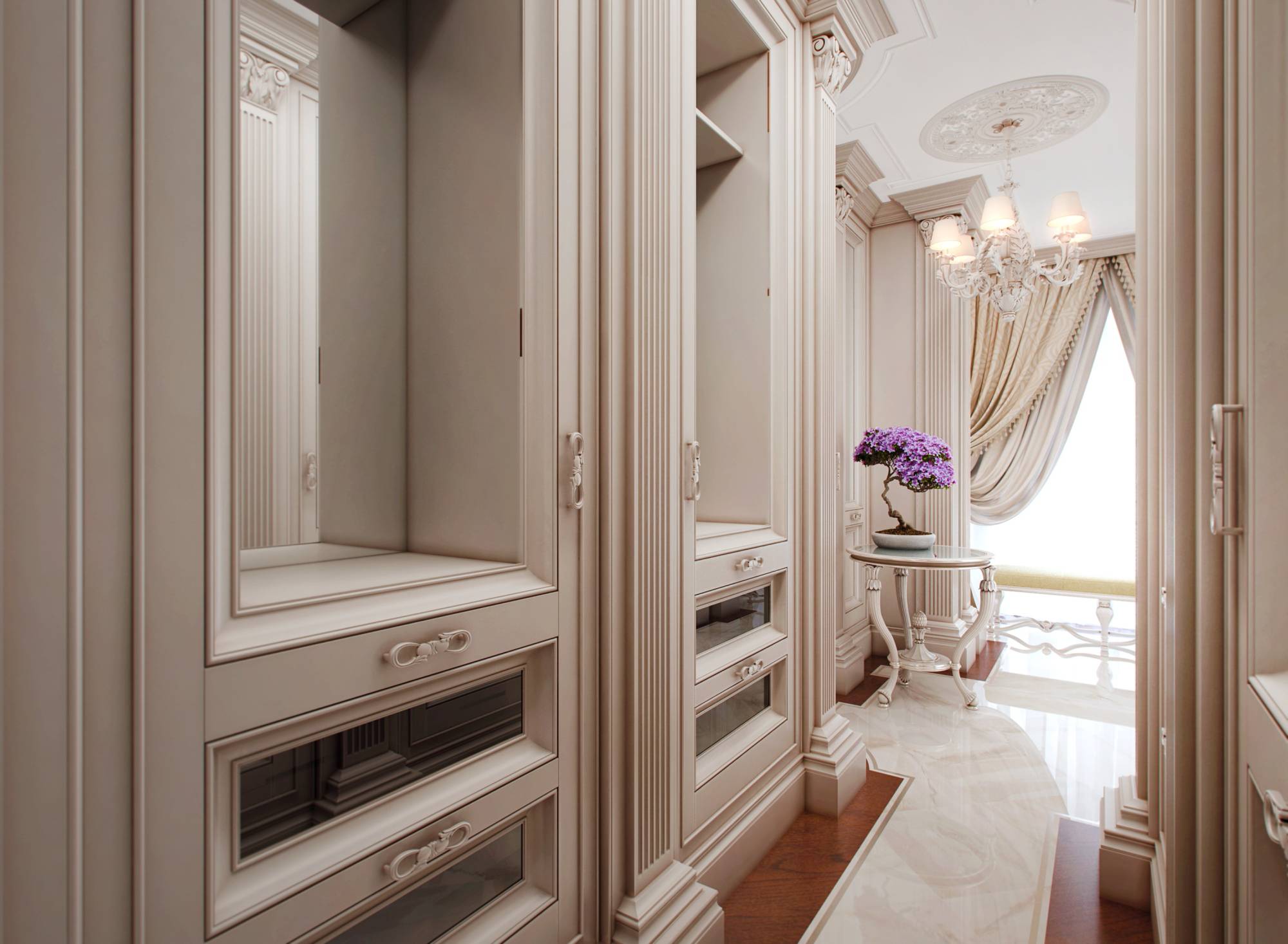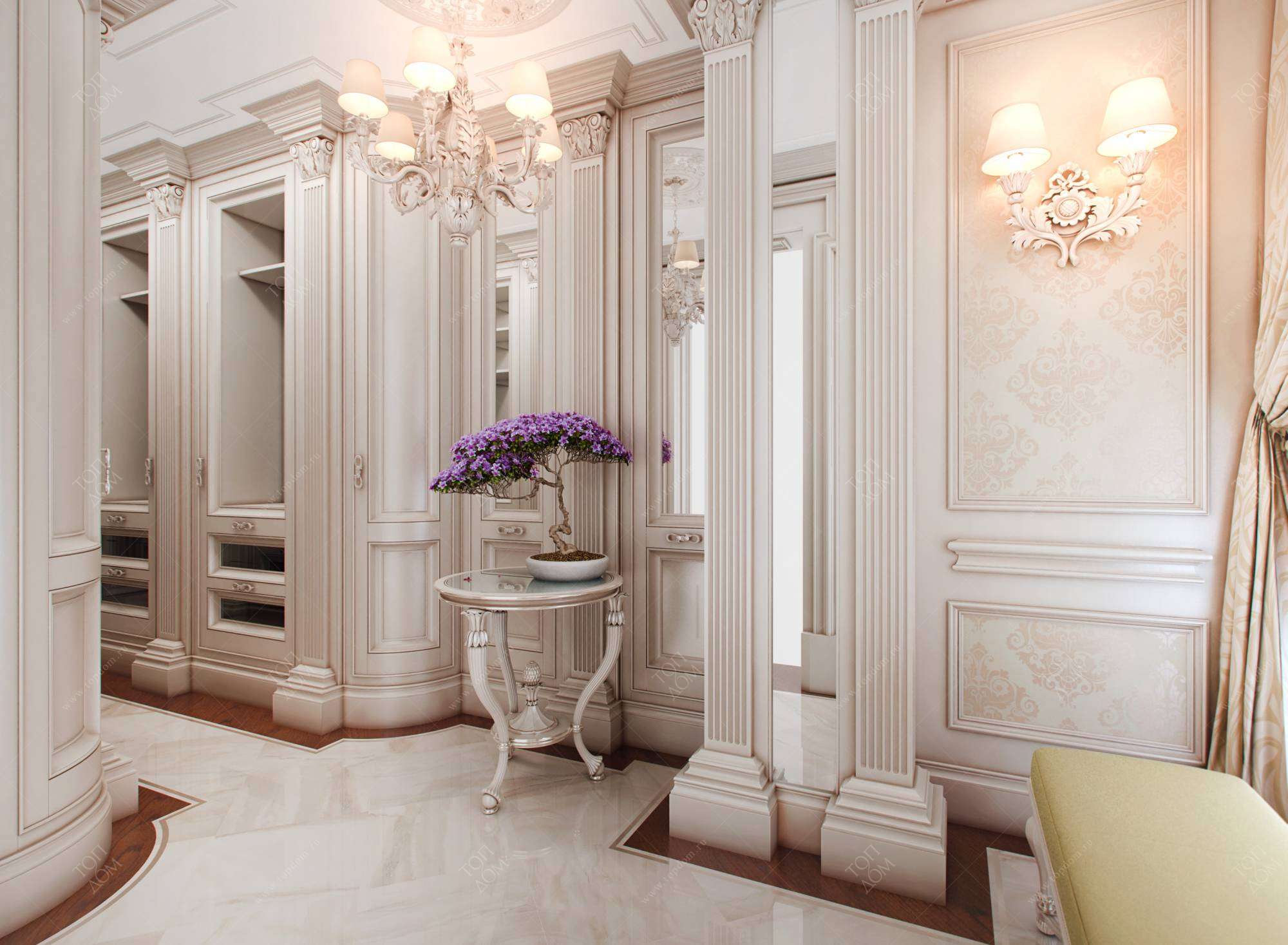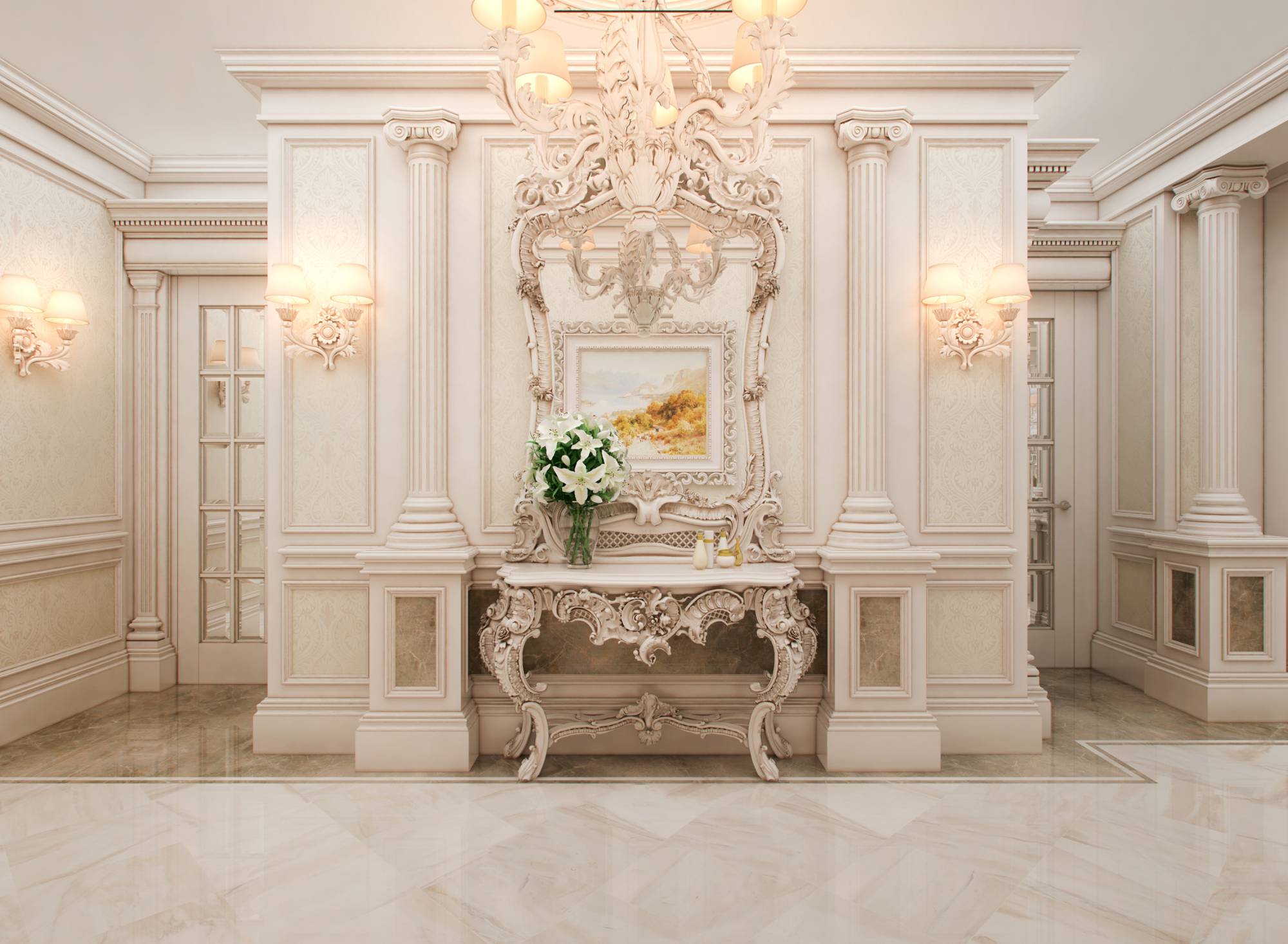 Холл в квартире широкий, просторный. Отделка в общем стиле – светлые оттенки, мрамор. Колонны, зеркальные двери, помпезная резная мебель — все «работает» на создание дорогого имиджа квартиры с первого взгляда.