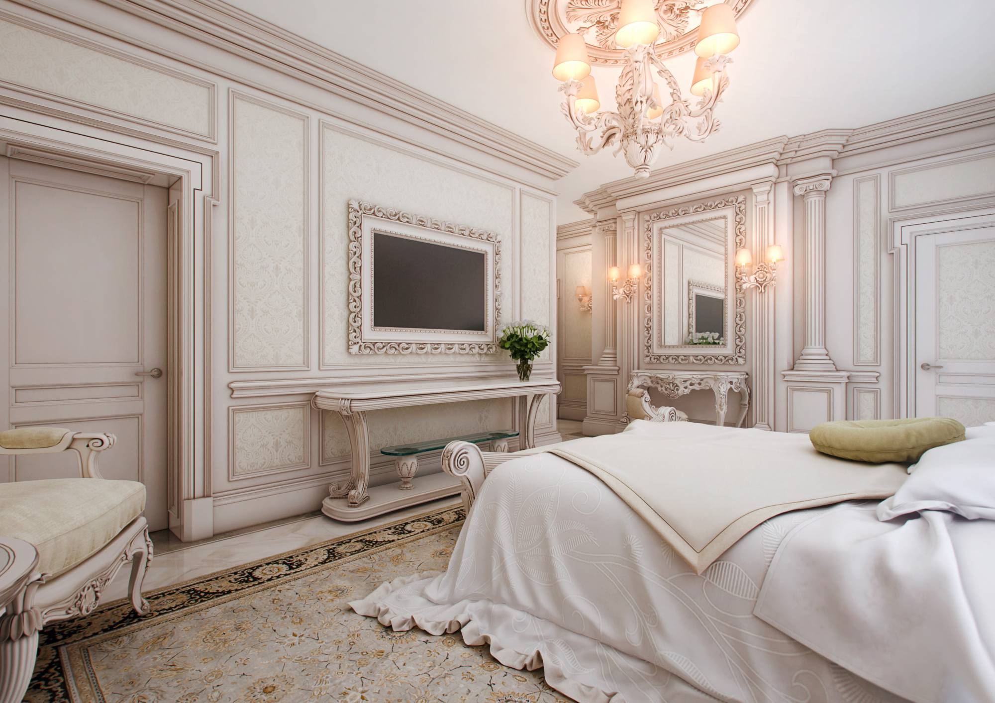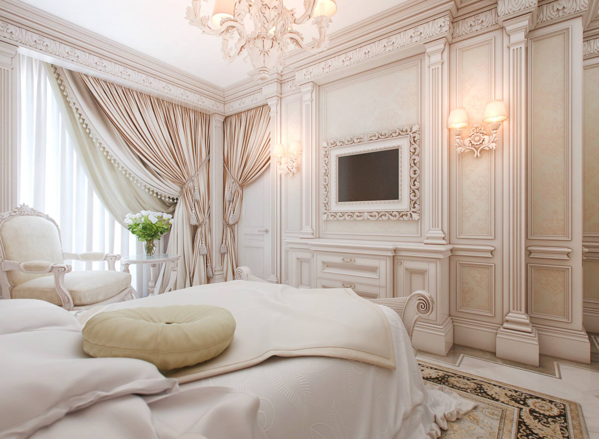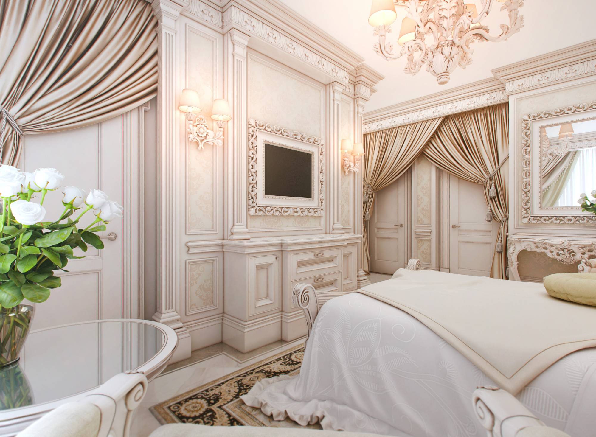 В спальне воплощены лучшие идеи оформления в классическом стиле: благородные светлые оттенки, зеркала и плазма в резных рамах, сдержанный изысканный декор, массивная мебель с отделкой.