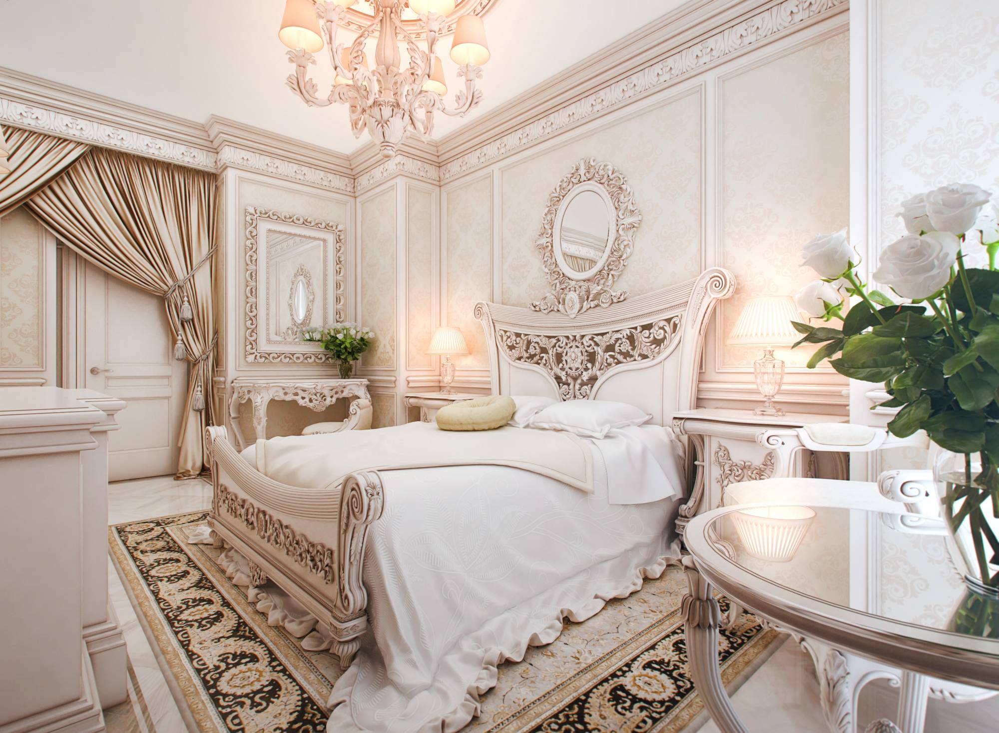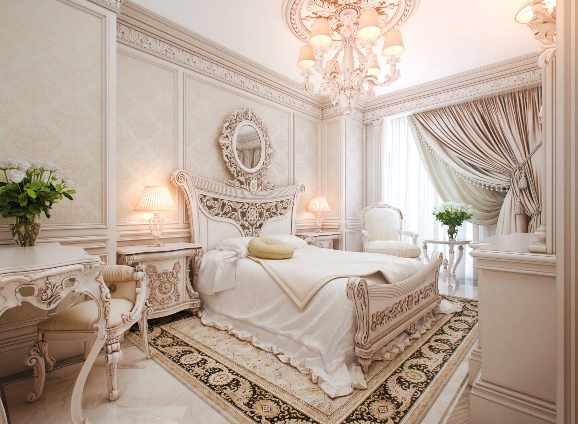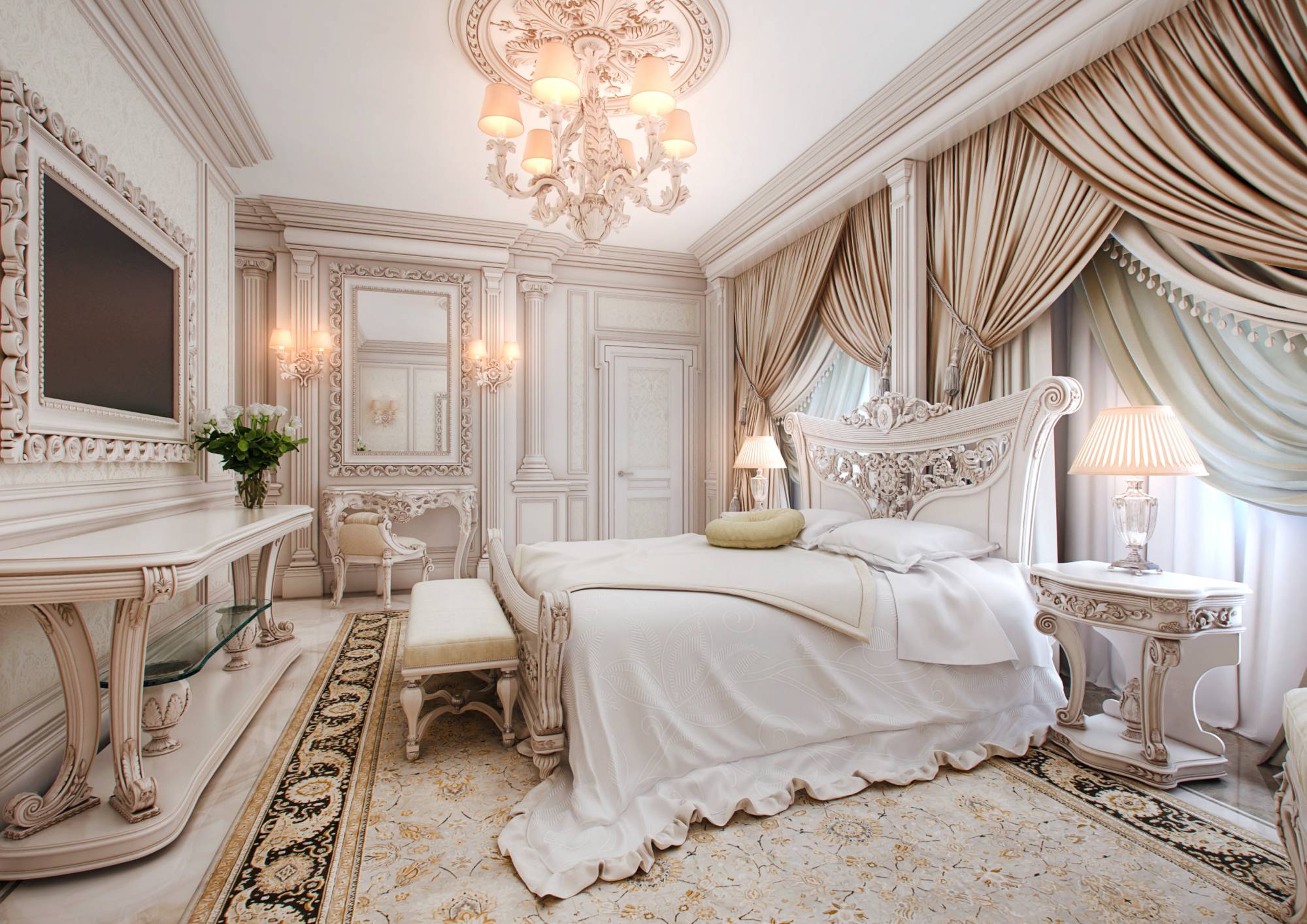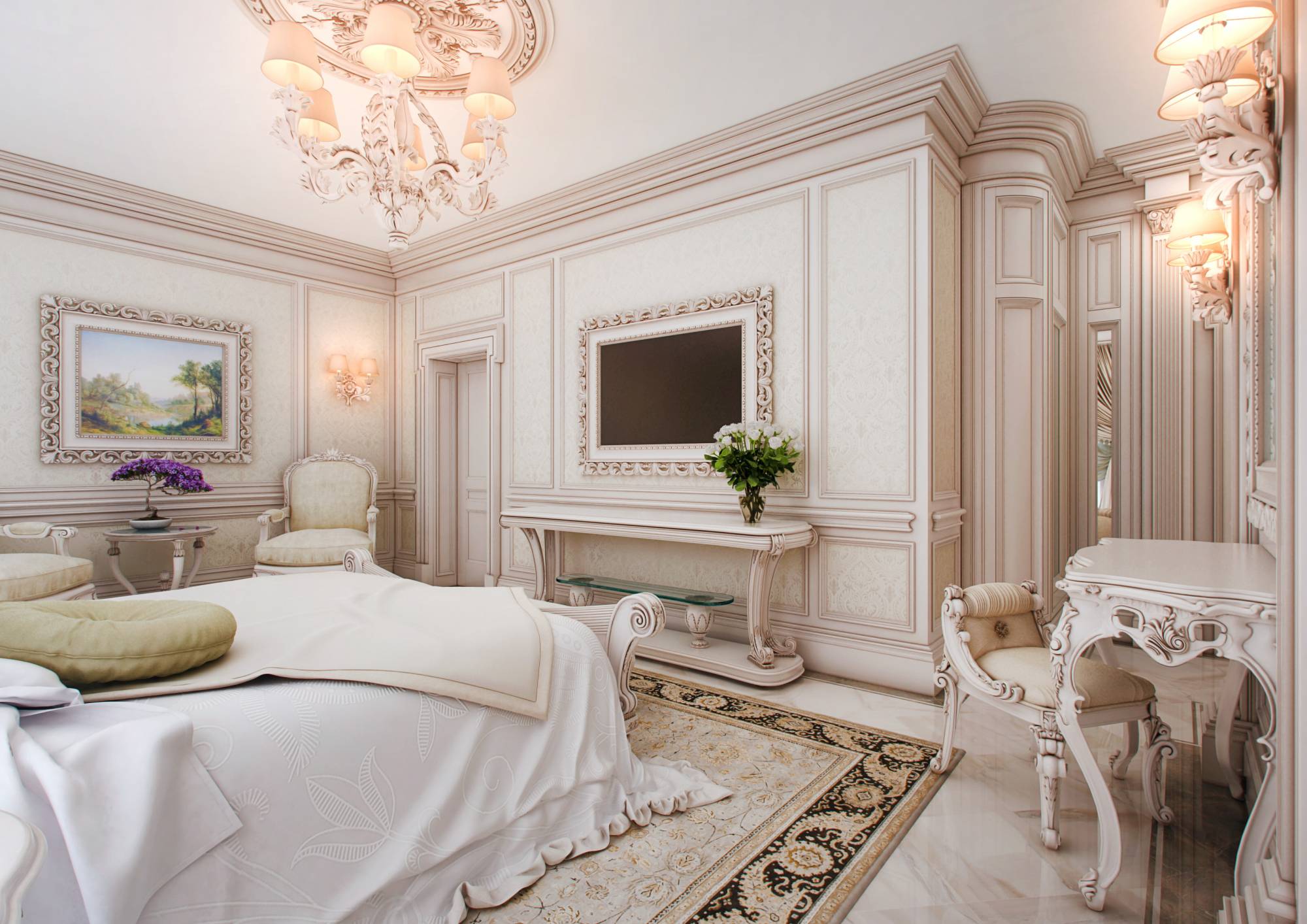 В спальне воплощены лучшие идеи оформления в классическом стиле: благородные светлые оттенки, зеркала и плазма в резных рамах, сдержанный изысканный декор, массивная мебель с отделкой.