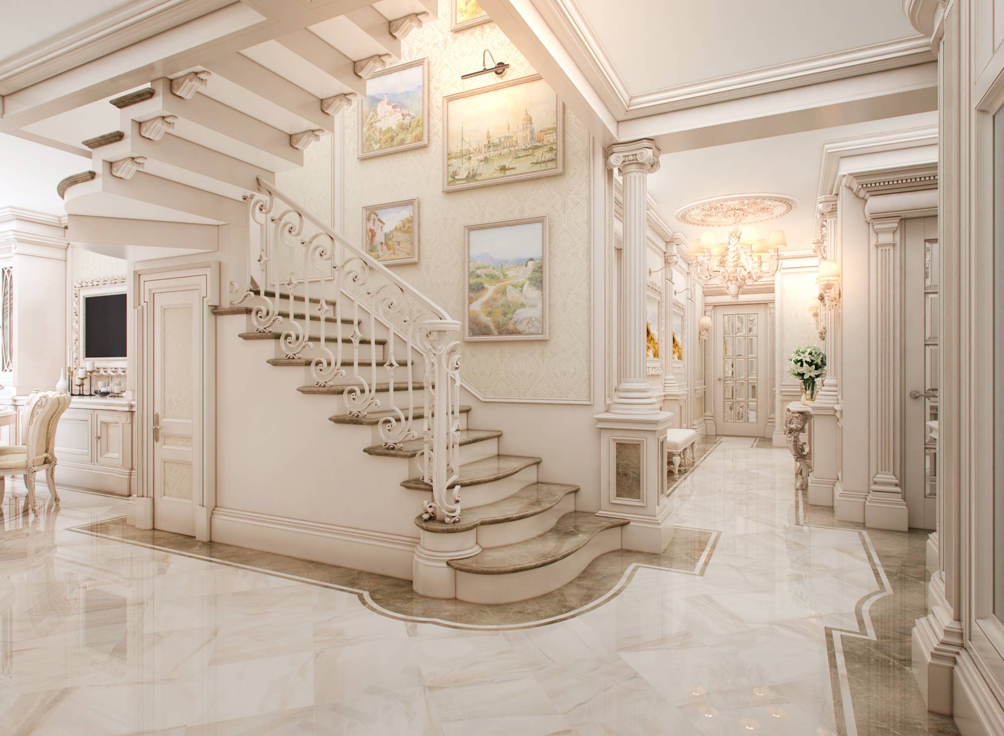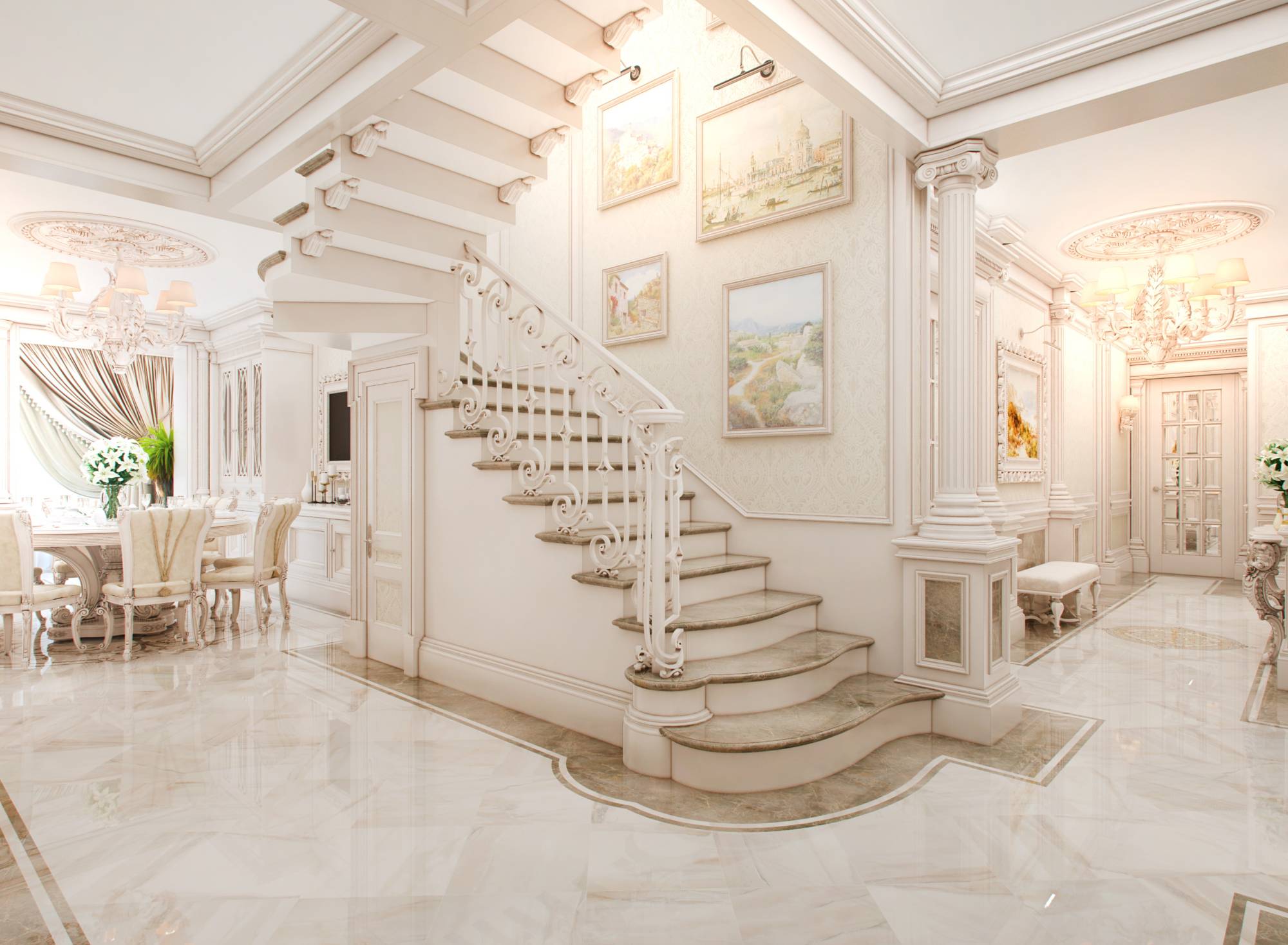 Двухуровневая квартира оснащена лестницей с мраморными ступенями и витыми металлическими перилами с изящными балясинами. Стену вдоль лестницы украшают картины.