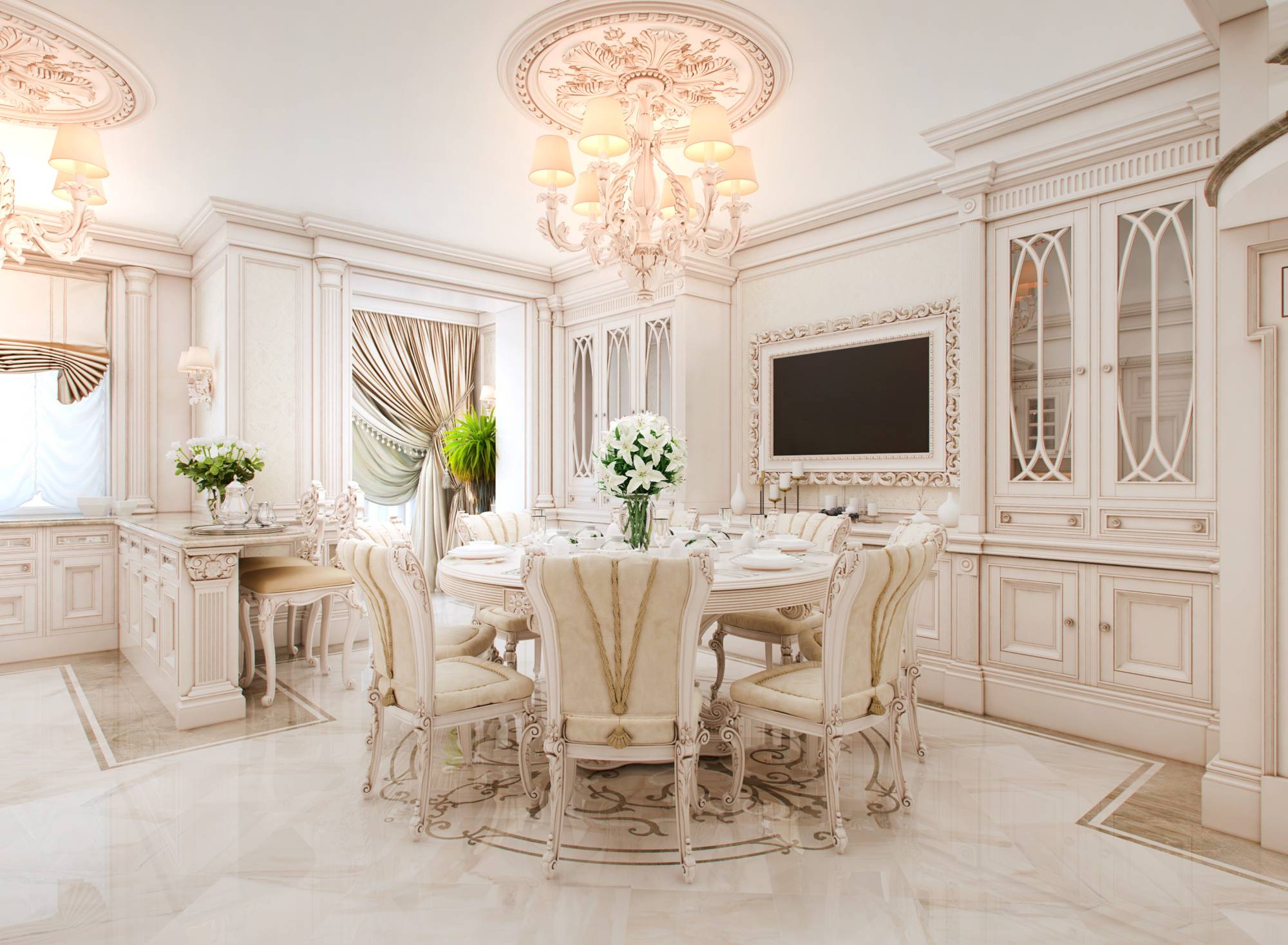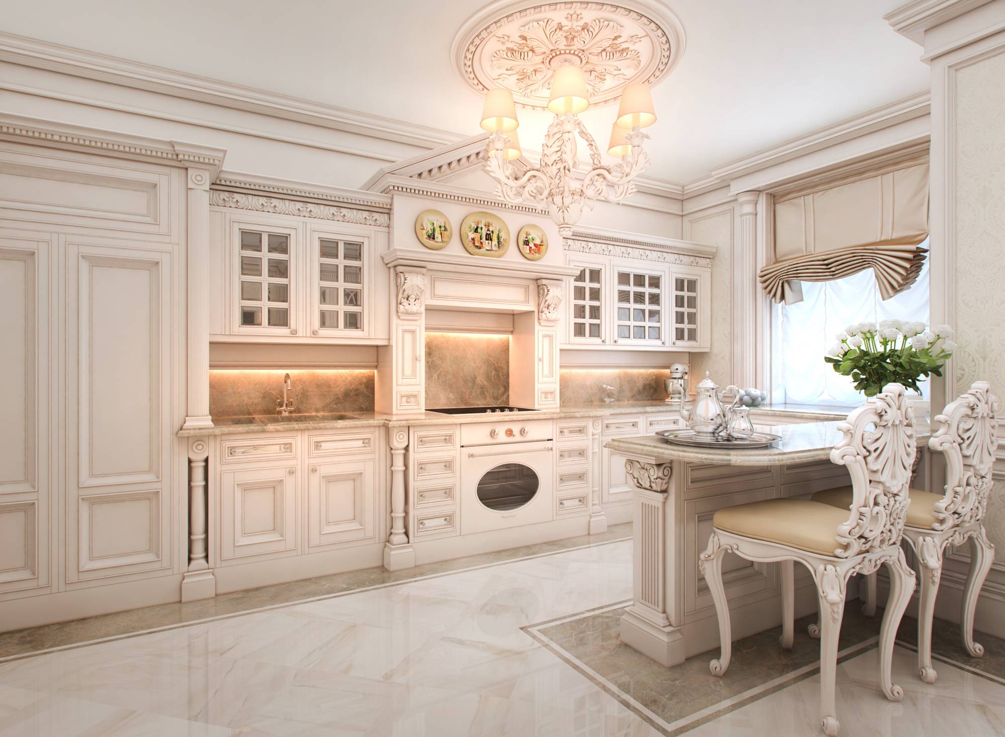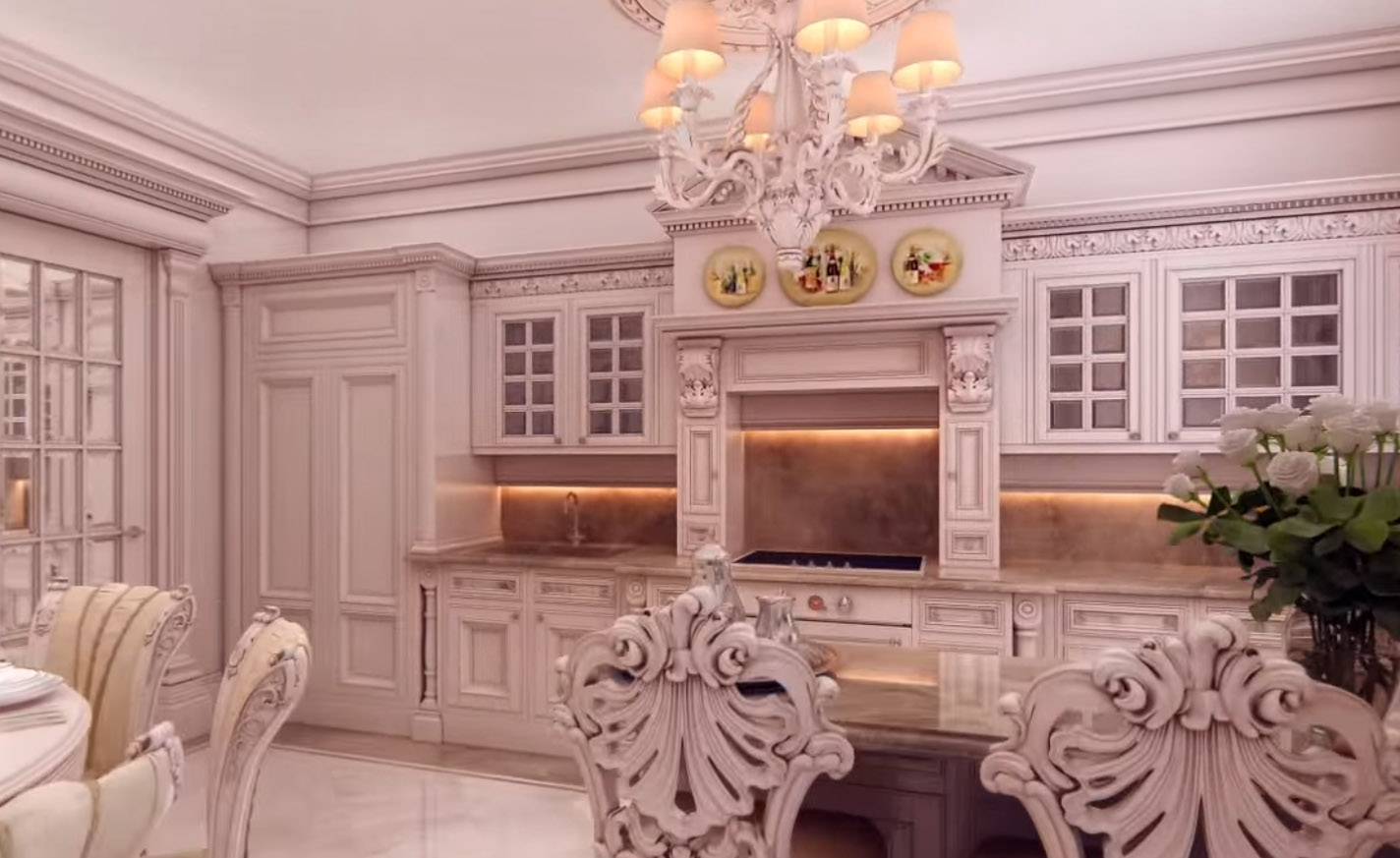 Кухня представляет собой объединенную зону со столовой. Кухонный гарнитур не просто выглядит дорого – это прекрасный образец классической римской архитектуры. В отделке использованы фронтон (внутренний треугольник), карнизы, фризы, полуколонны и пилястры, обилие резного декора. Красивая и долговечная столешница выполнена из мрамора в тон.