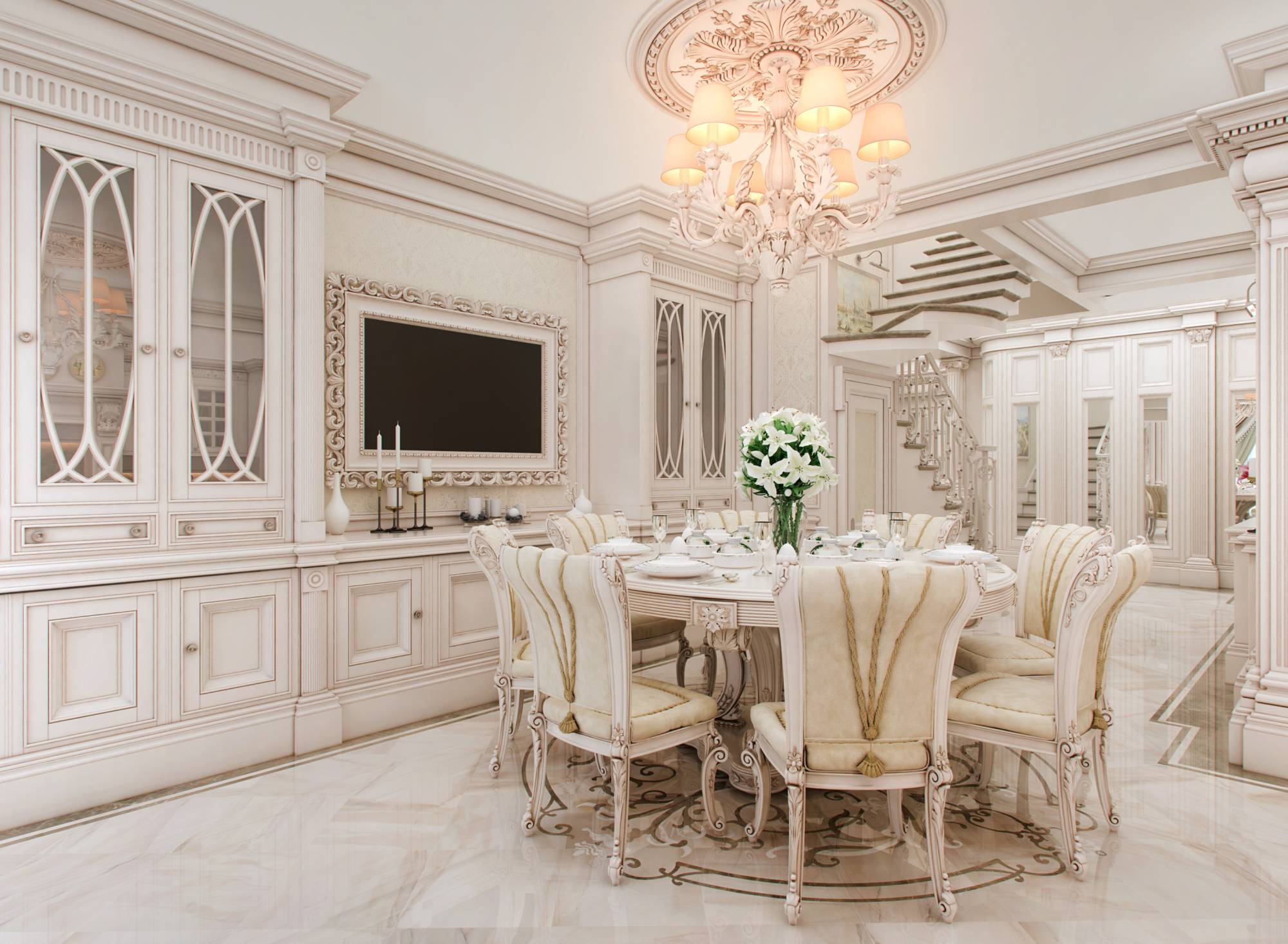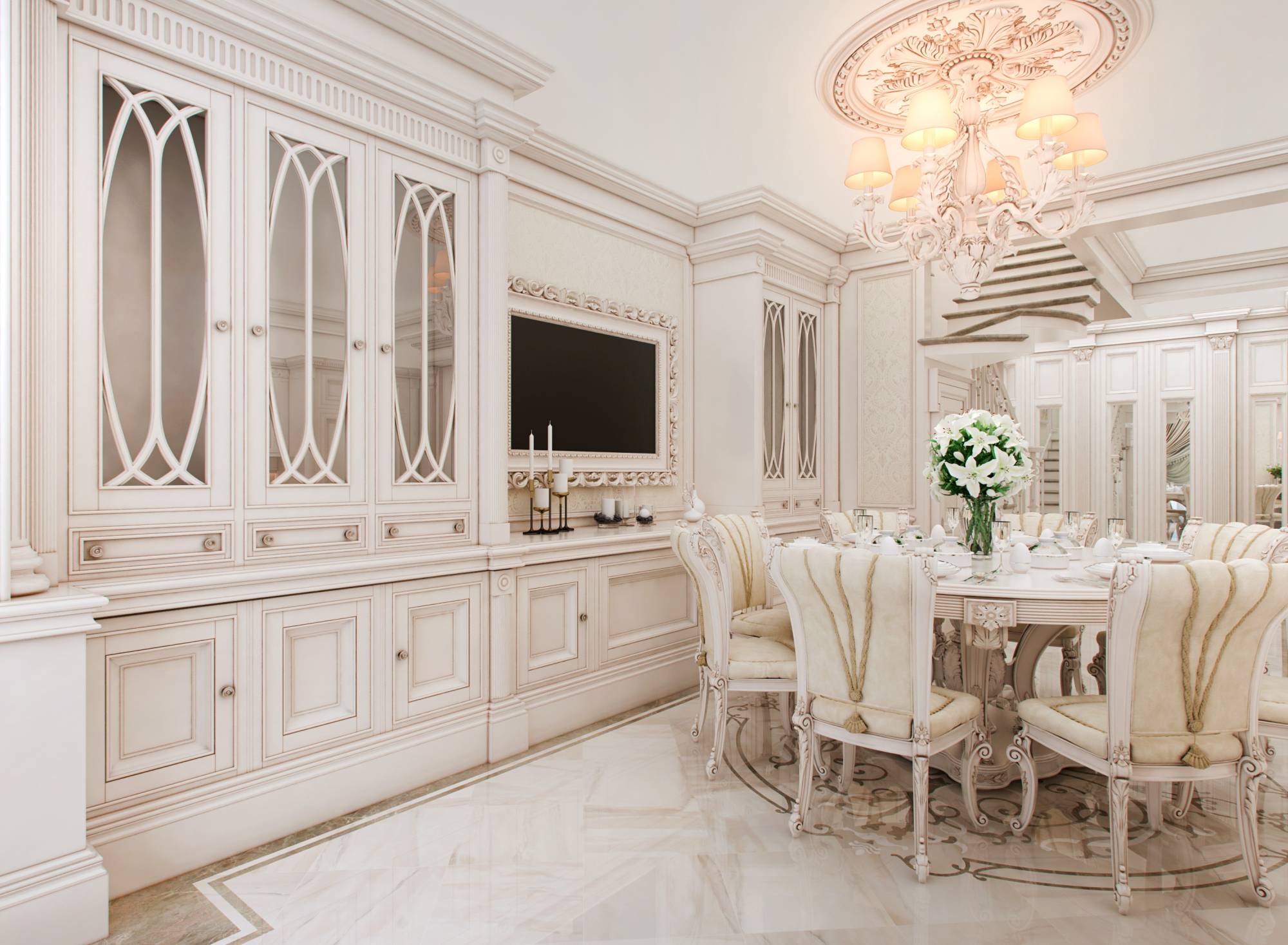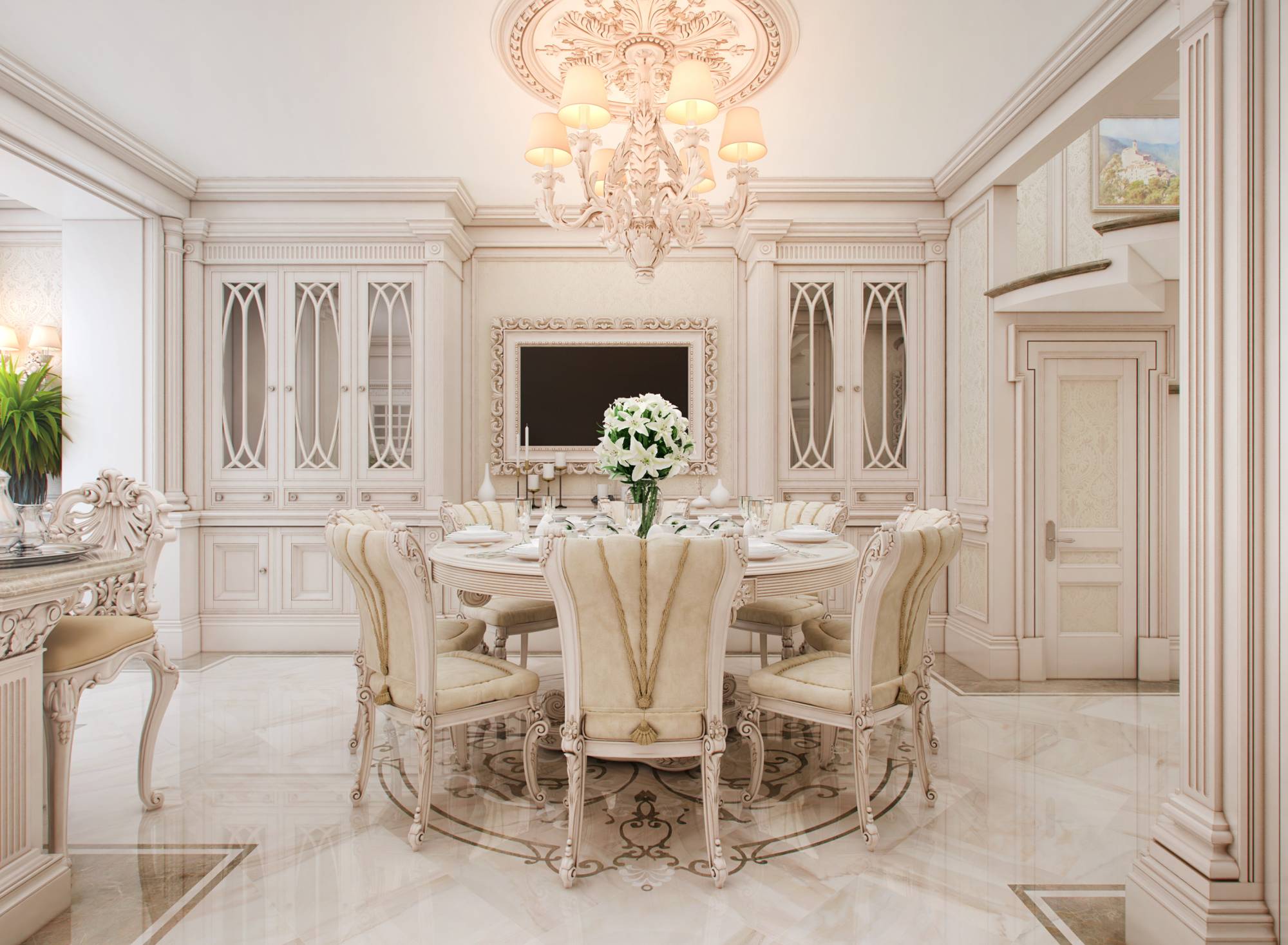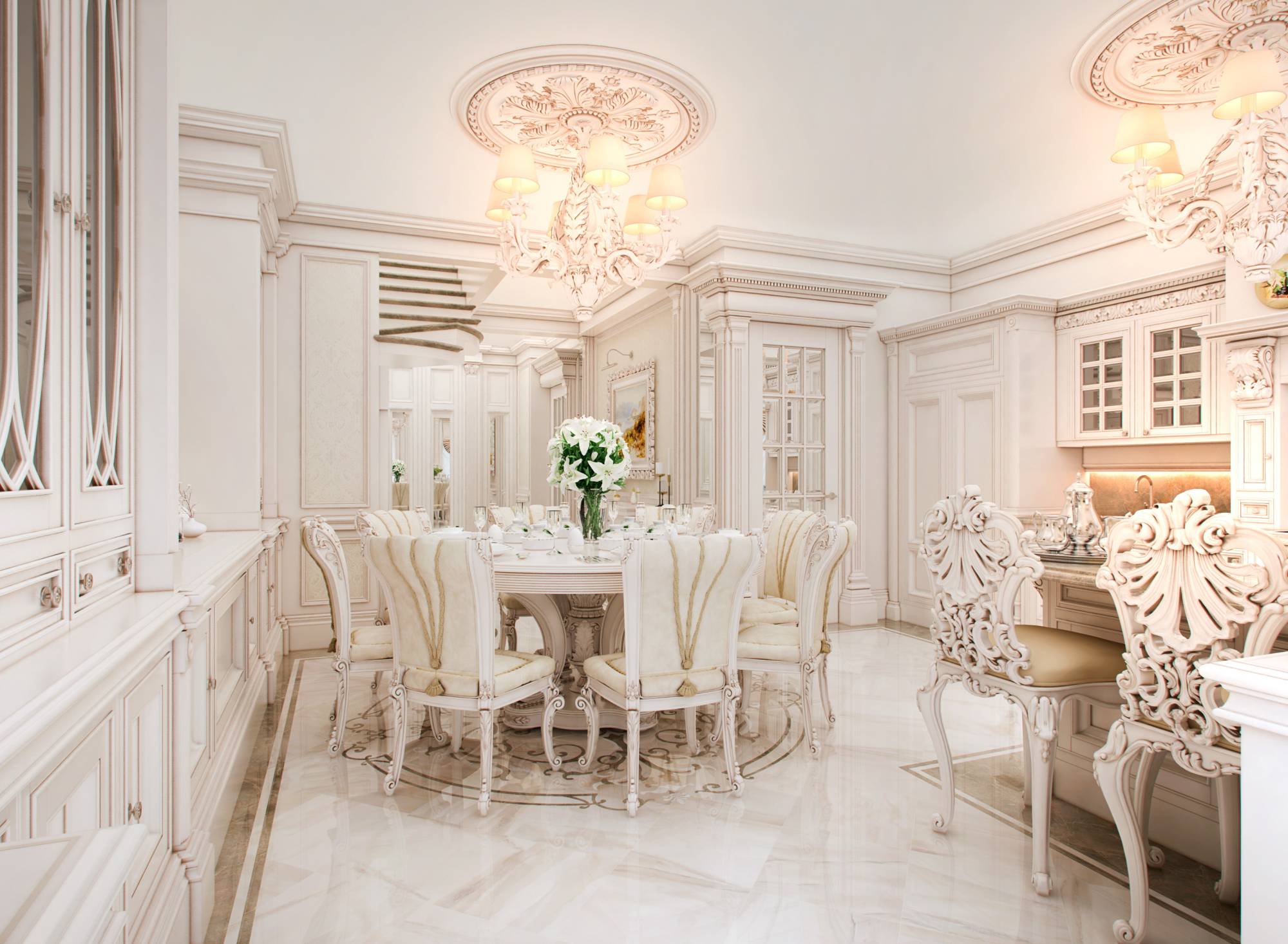 Кухня представляет собой объединенную зону со столовой. Кухонный гарнитур не просто выглядит дорого – это прекрасный образец классической римской архитектуры. В отделке использованы фронтон (внутренний треугольник), карнизы, фризы, полуколонны и пилястры, обилие резного декора. Красивая и долговечная столешница выполнена из мрамора в тон.