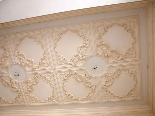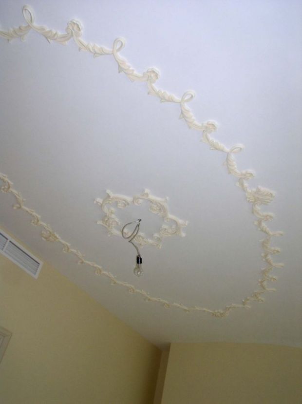При подготовке поверхность очищают от старой штукатурки, плоскость выравнивают и грунтуют. Для каждой из деталей на потолок наносят разметку, чтобы при креплении не вылезли края и не оставались пустоты.
