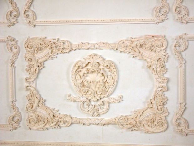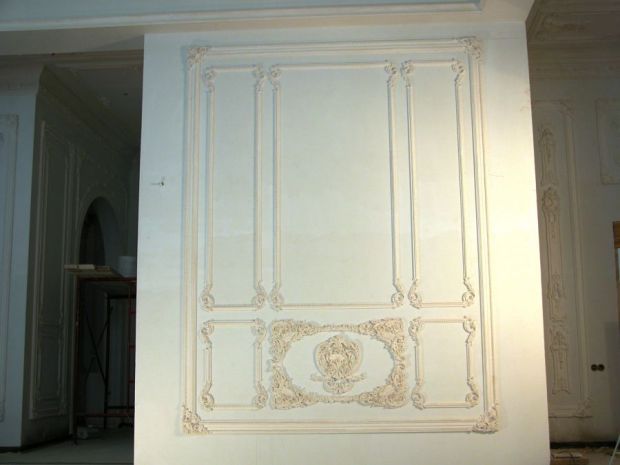 Для дизайна стен используют несколько видов лепного декора: молдинги (рельефные и простые), угловые сегменты и самостоятельные орнаменты, пилястры, кронштейны.