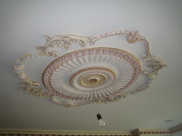 - в спальне гипсовая круглая розетка дополнена овальным орнаментом;