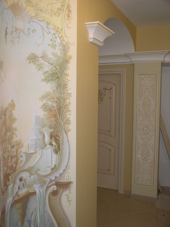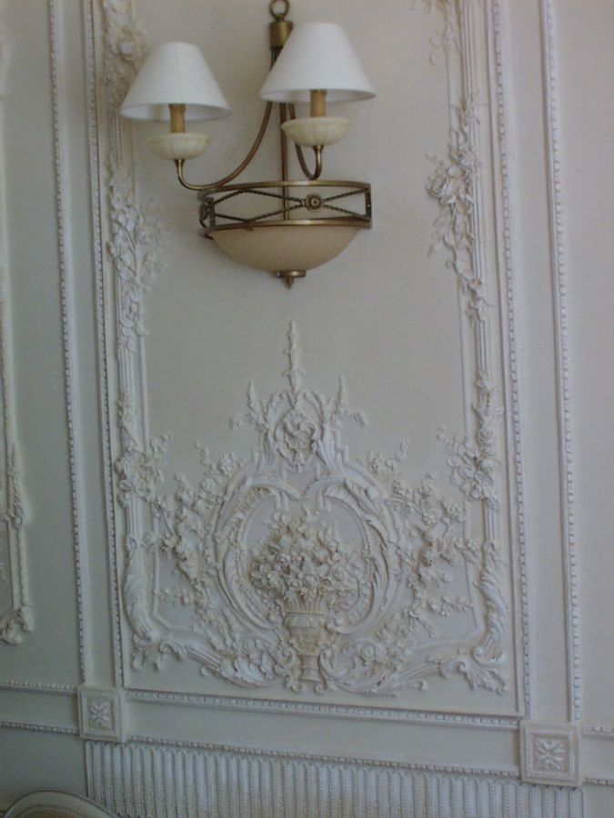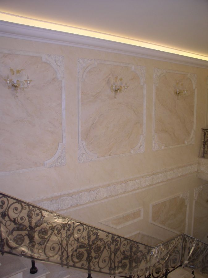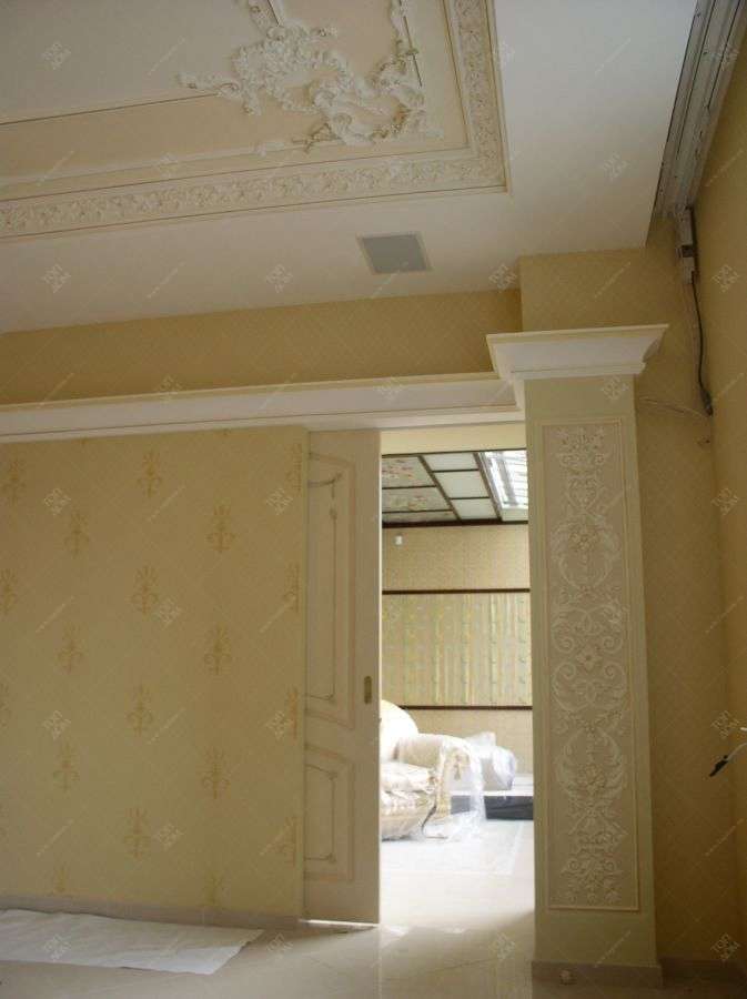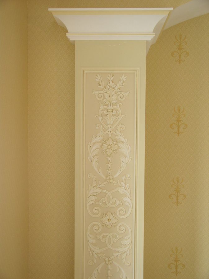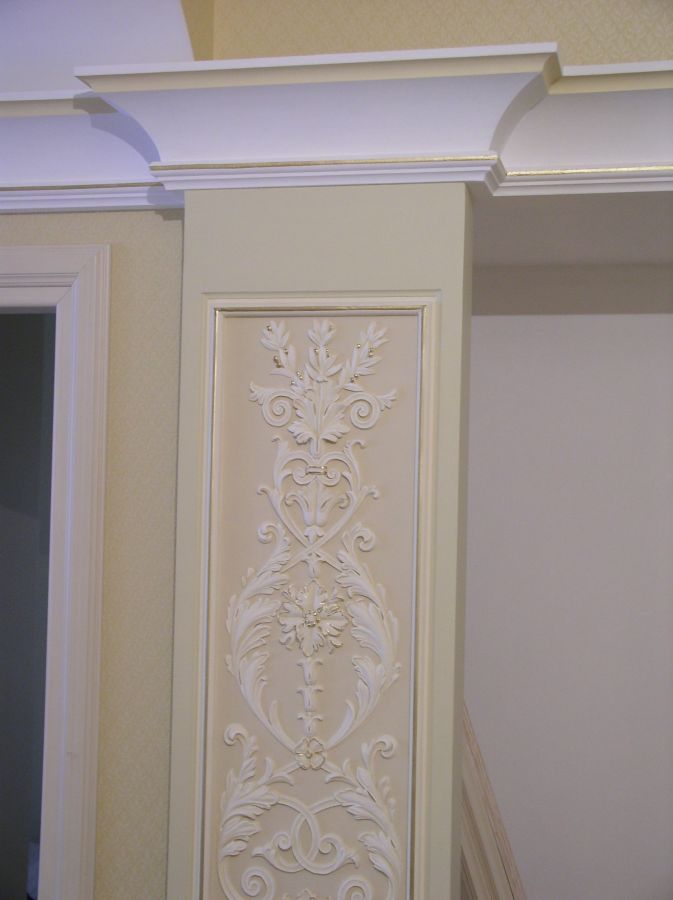 Для дизайна стен используют несколько видов лепного декора: молдинги (рельефные и простые), угловые сегменты и самостоятельные орнаменты, пилястры, кронштейны.