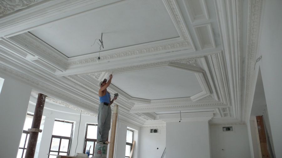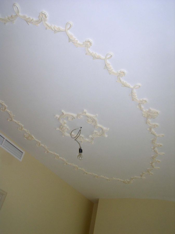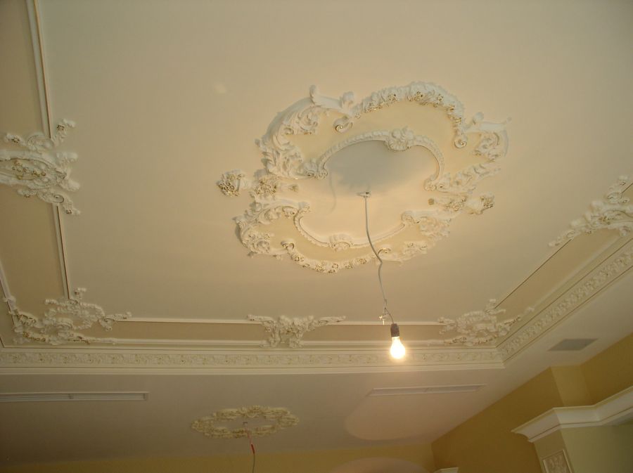 При подготовке поверхность очищают от старой штукатурки, плоскость выравнивают и грунтуют. Для каждой из деталей на потолок наносят разметку, чтобы при креплении не вылезли края и не оставались пустоты.