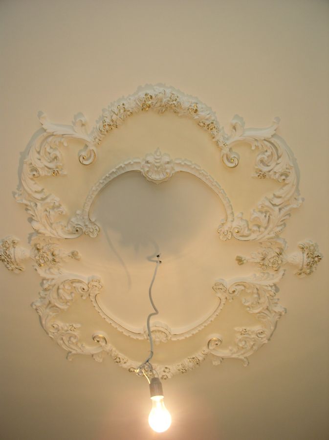 - внутренняя часть потолка между молдингами окрашена в более темный оттенок, это делает плоскость более выразительной;