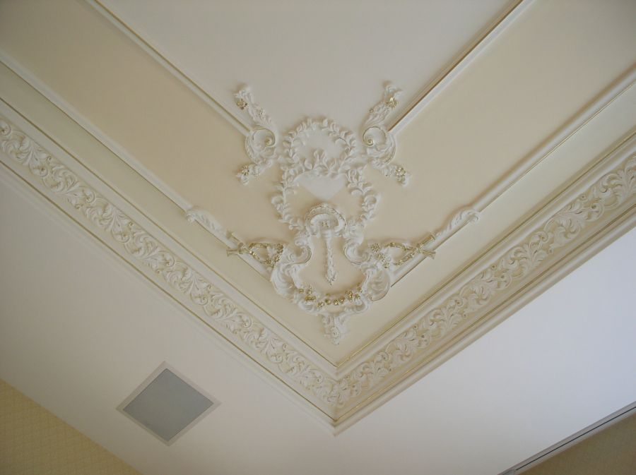 - потолочная кромка выделена по периметру двумя рядами молдингов с угловыми и центральными декоративными фрагментами; витиеватость их рисунка перекликается со сложным узором розетки;