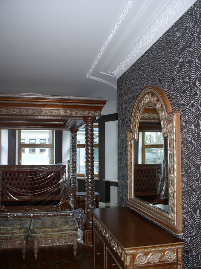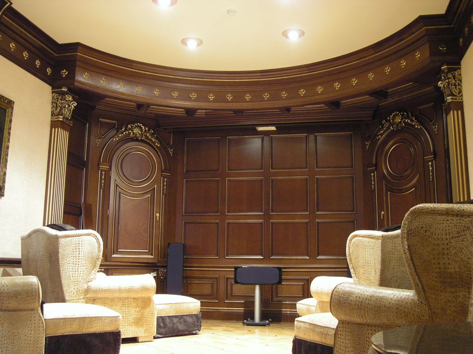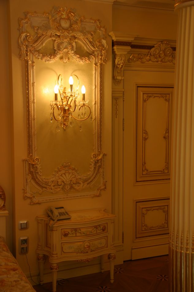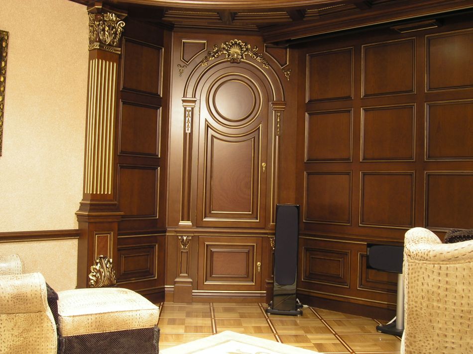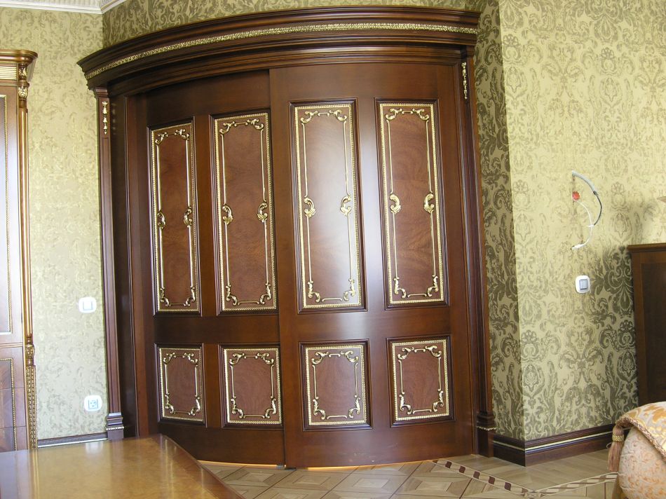 - Деревянные фасады украшаются резным декором, зеркалами, позолотой. Оформление может повторять дизайн лепных потолочных карнизов.