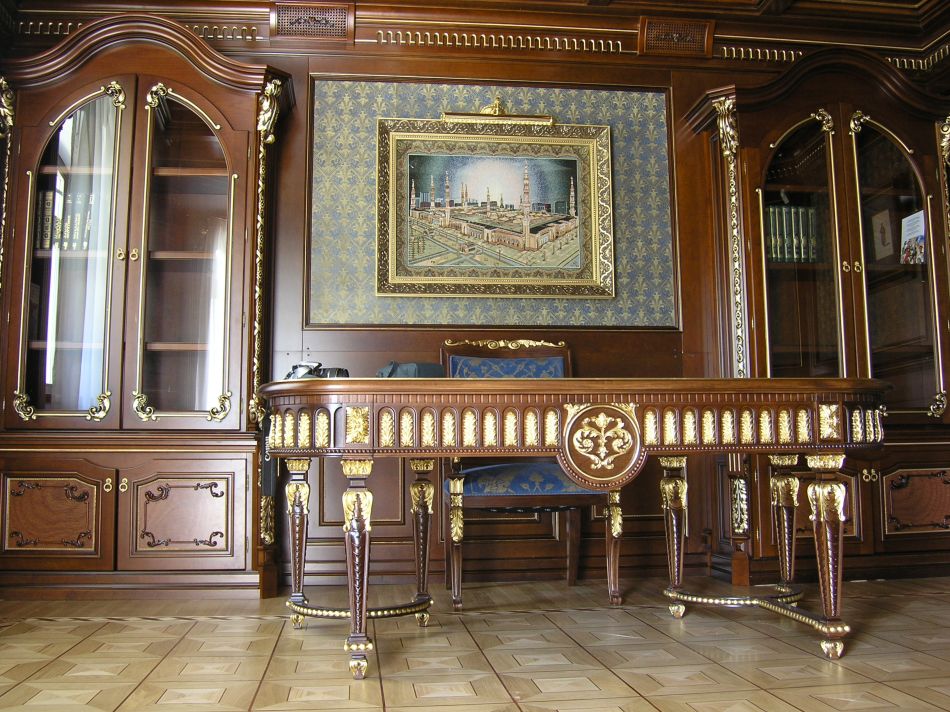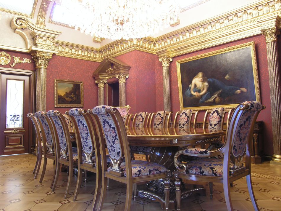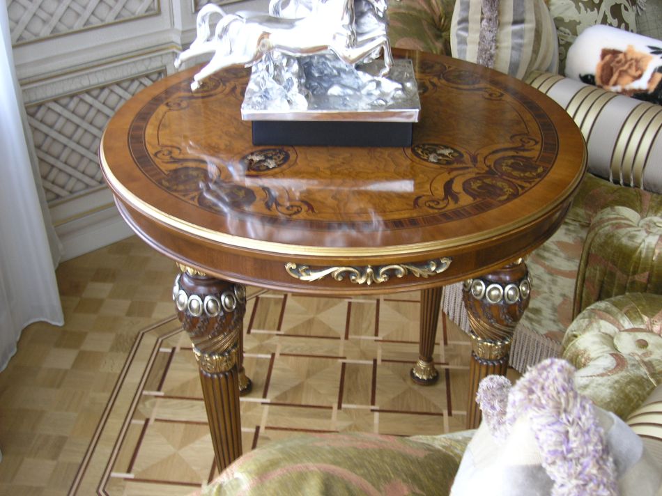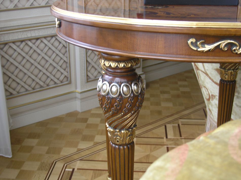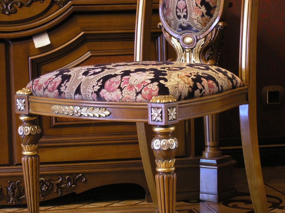 - Меблировка дома может сочетать щедро украшенные резьбой и позолотой предметы с чуть более строгими, массивными формами. Обязательное качество – симметрия в их дизайне.