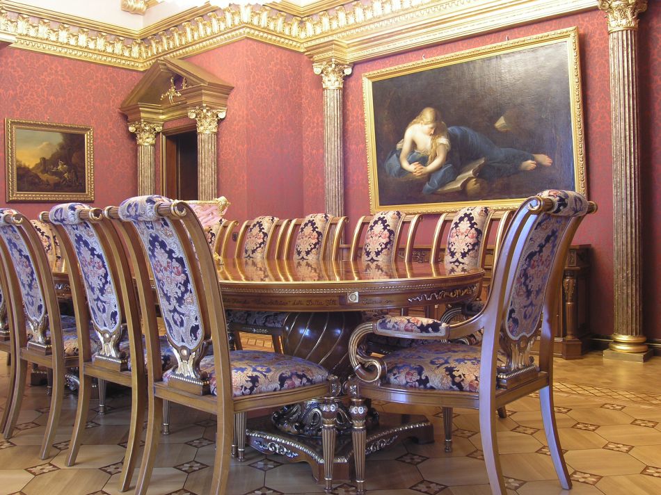 - В традиционную обеденную группу входит монументальный лакированный стол на украшенных резьбой опорах, деревянные стулья с мягкой спинкой и сиденьем (обивочная ткань может повторять дизайн штор).