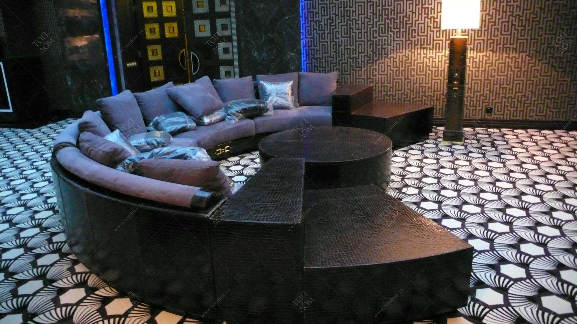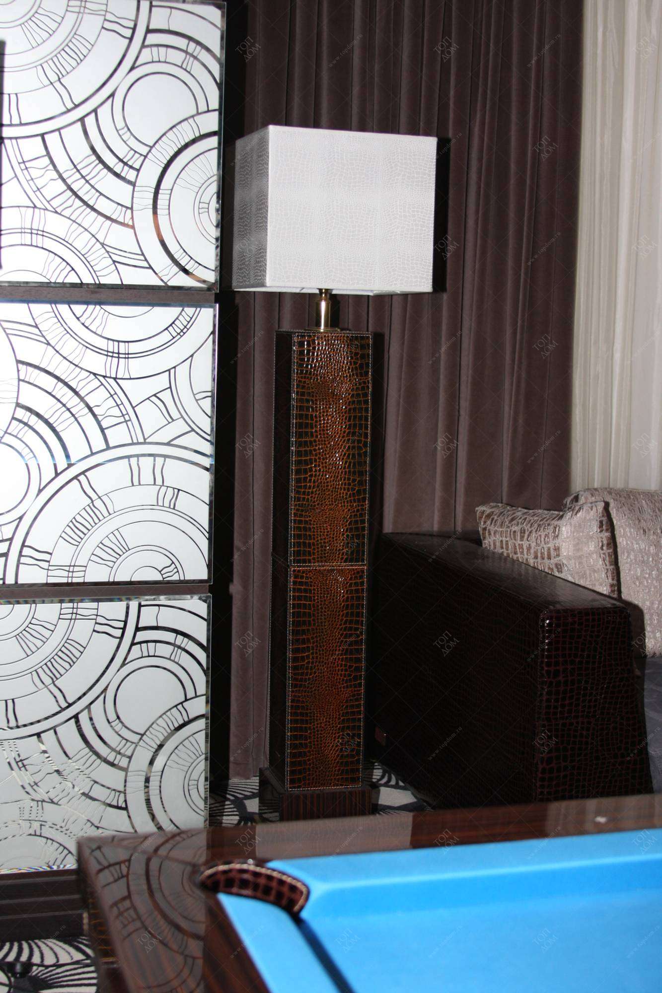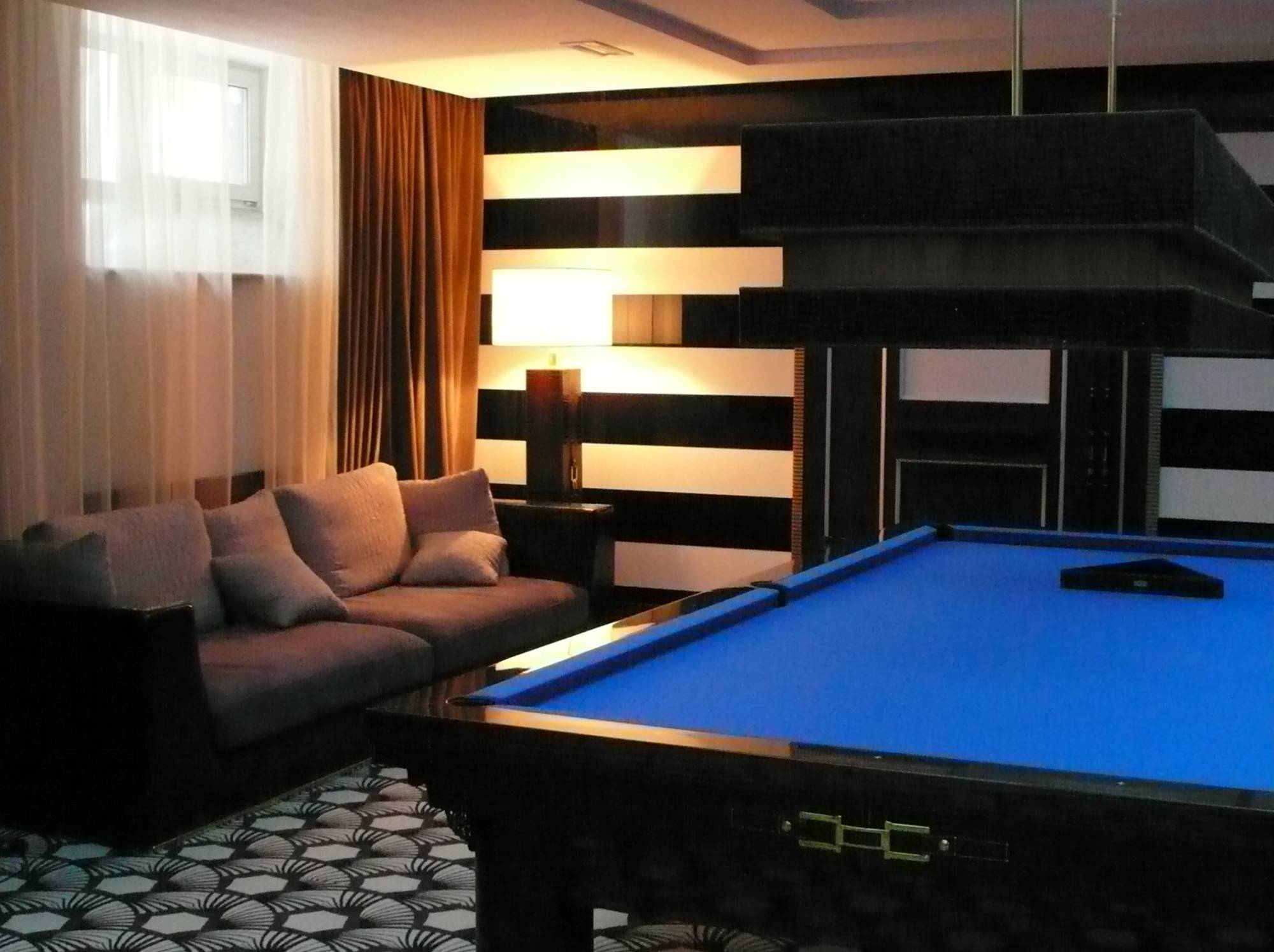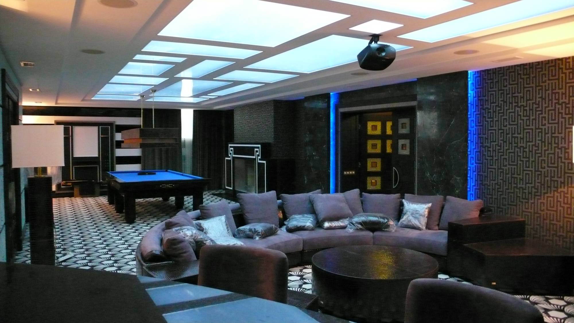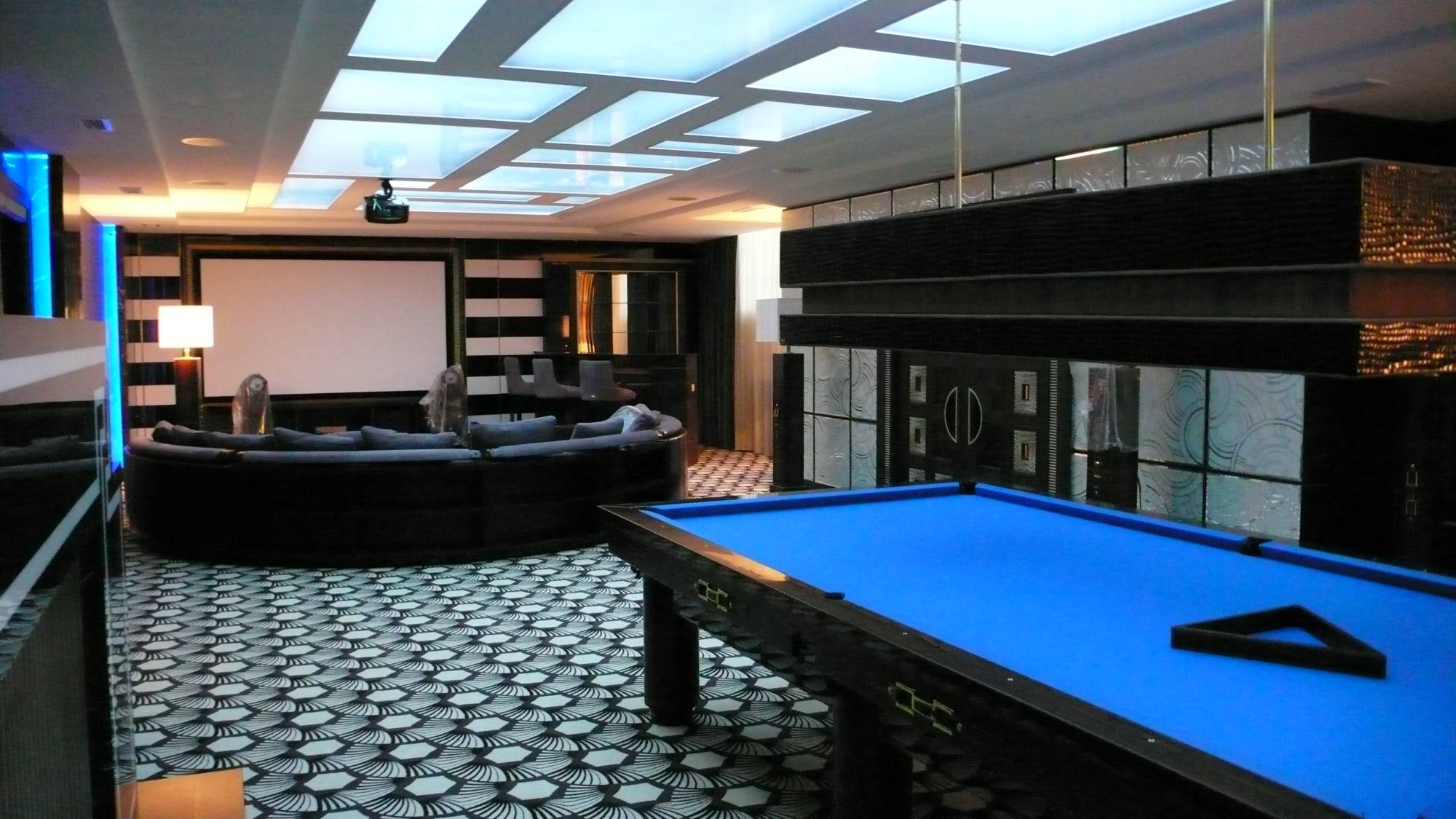 - в зале домашнего кинотеатра – вертикальные опоры торшеров, внутренняя часть луз и ножки бильярдного стола, фасад барной стойки, круглый ступенчатый диван и журнальный столик;