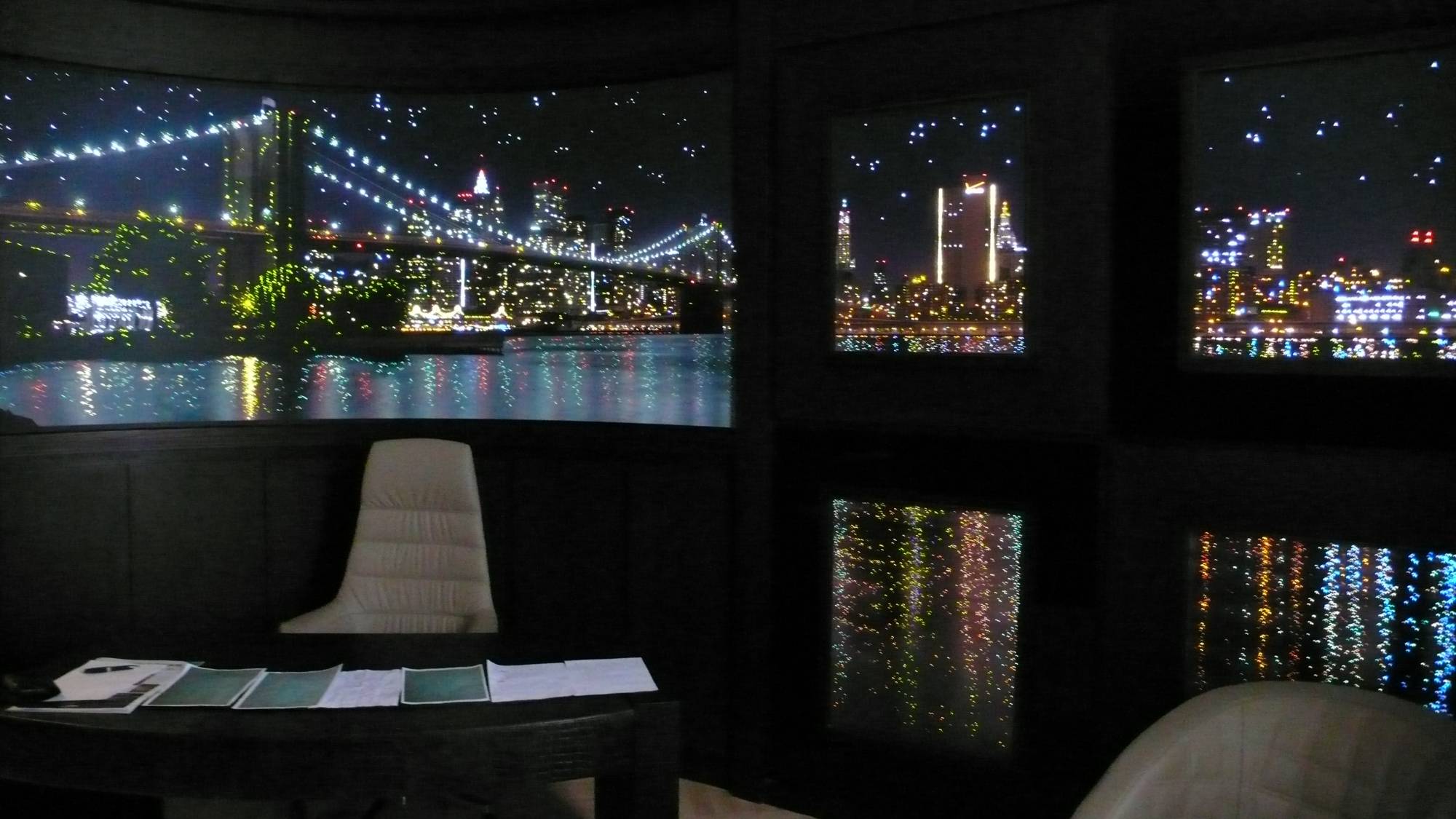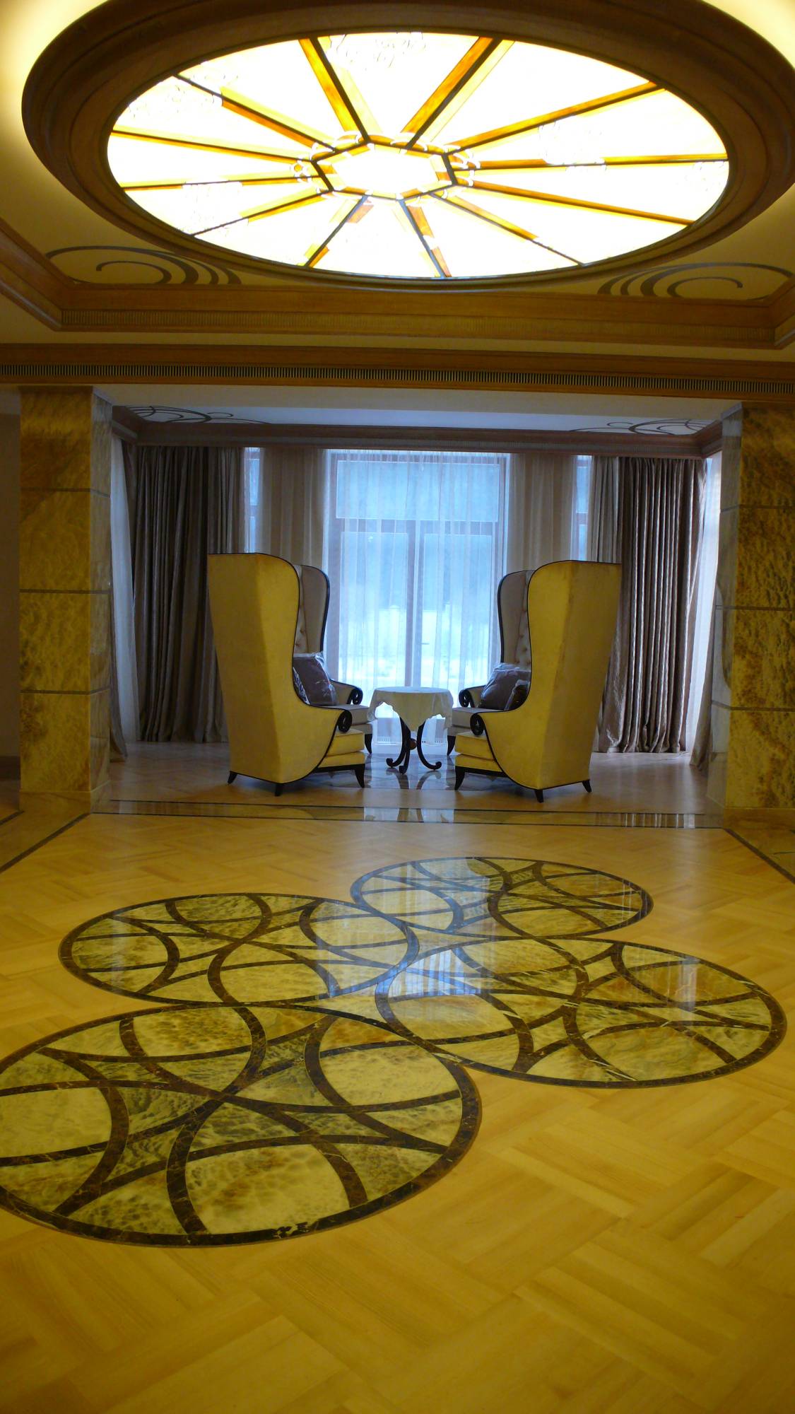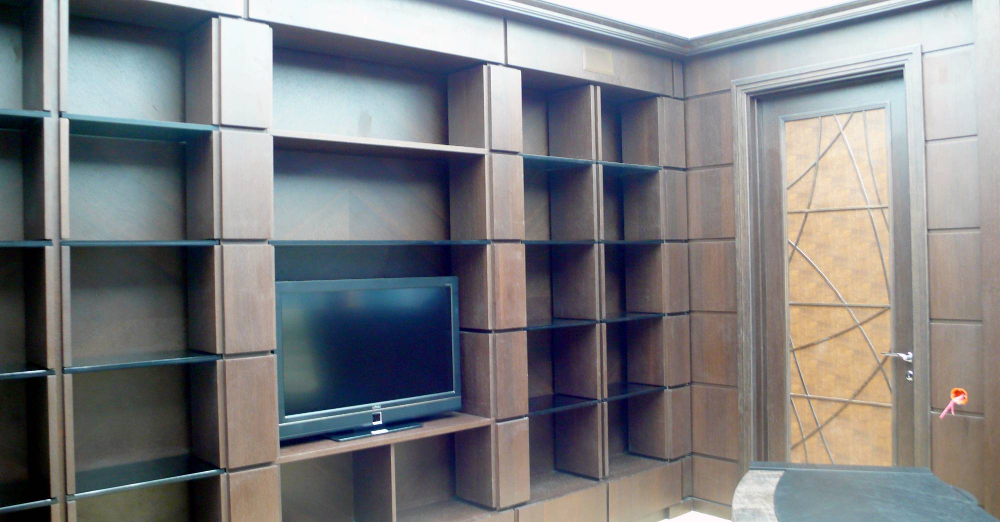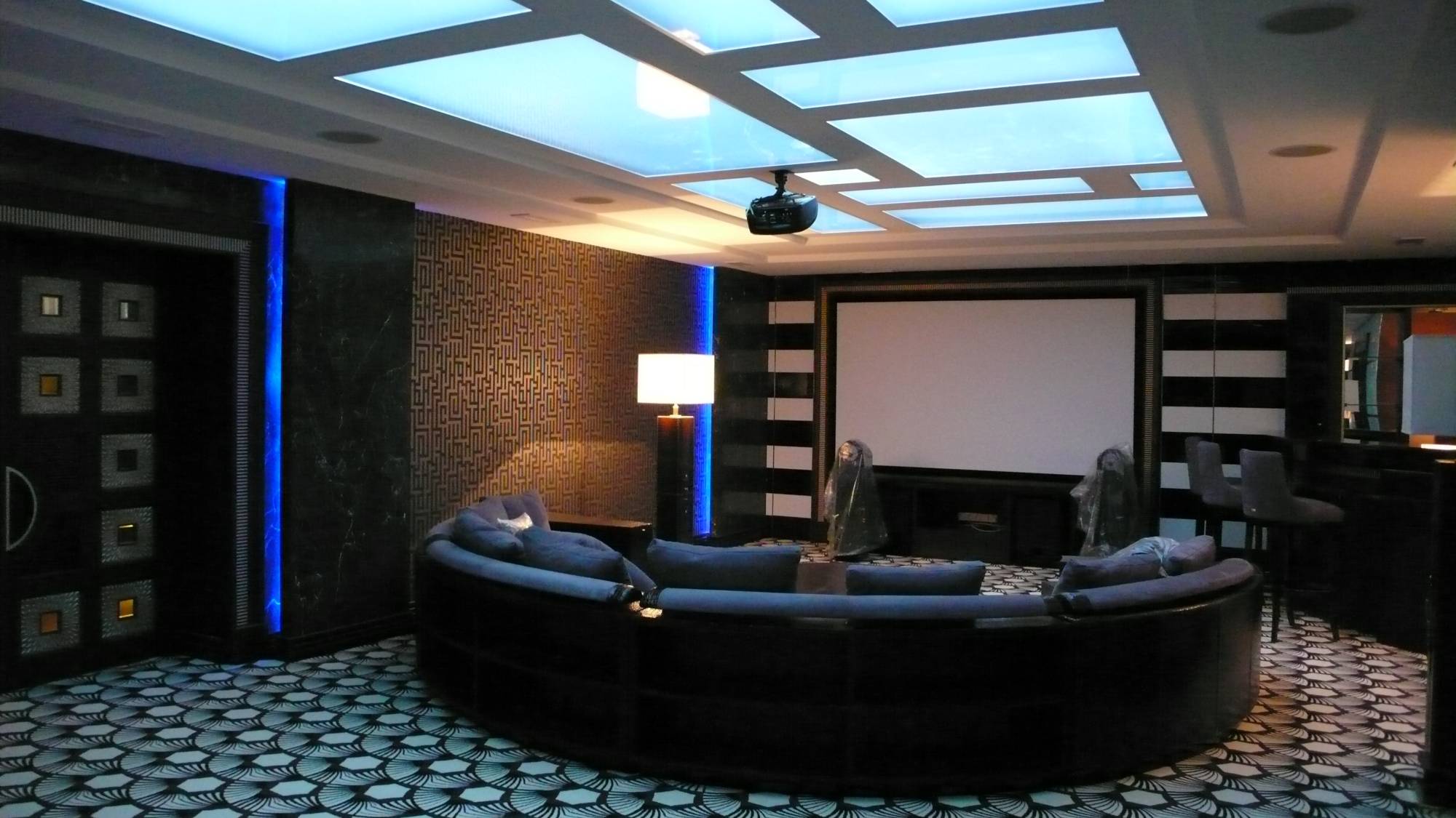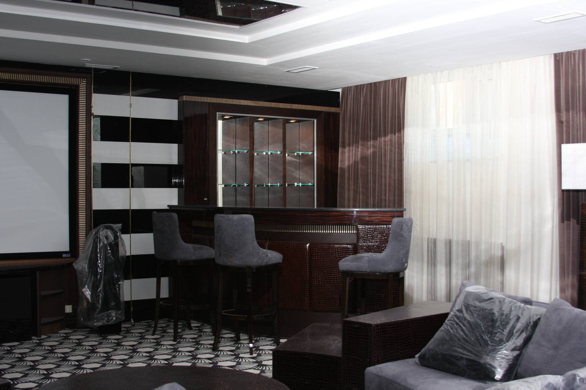 - в зале домашнего кинотеатра – вертикальные опоры торшеров, внутренняя часть луз и ножки бильярдного стола, фасад барной стойки, круглый ступенчатый диван и журнальный столик;