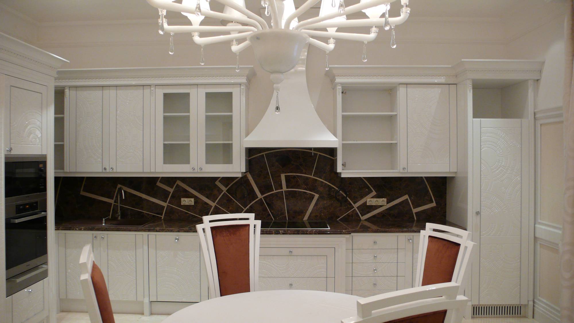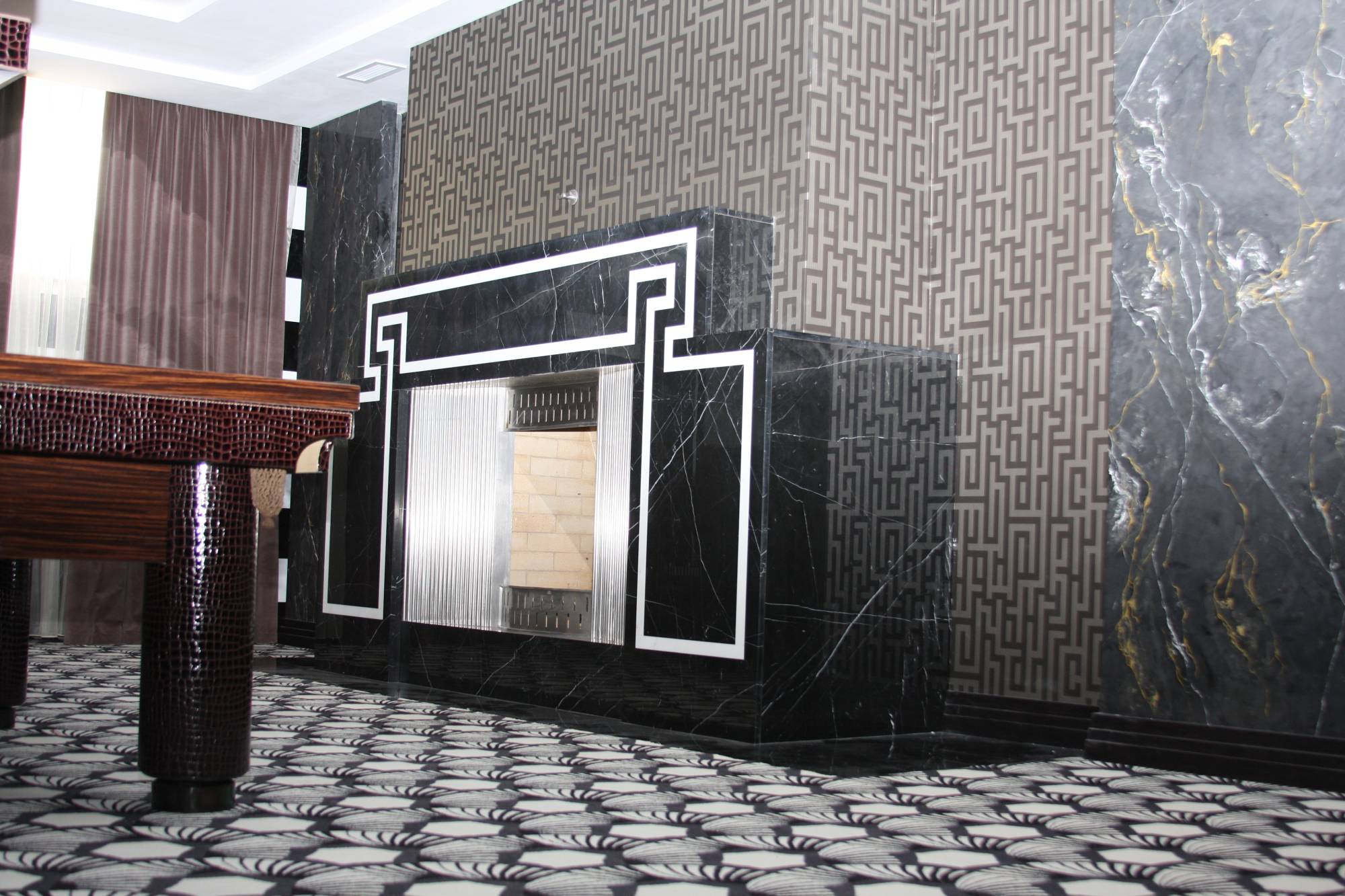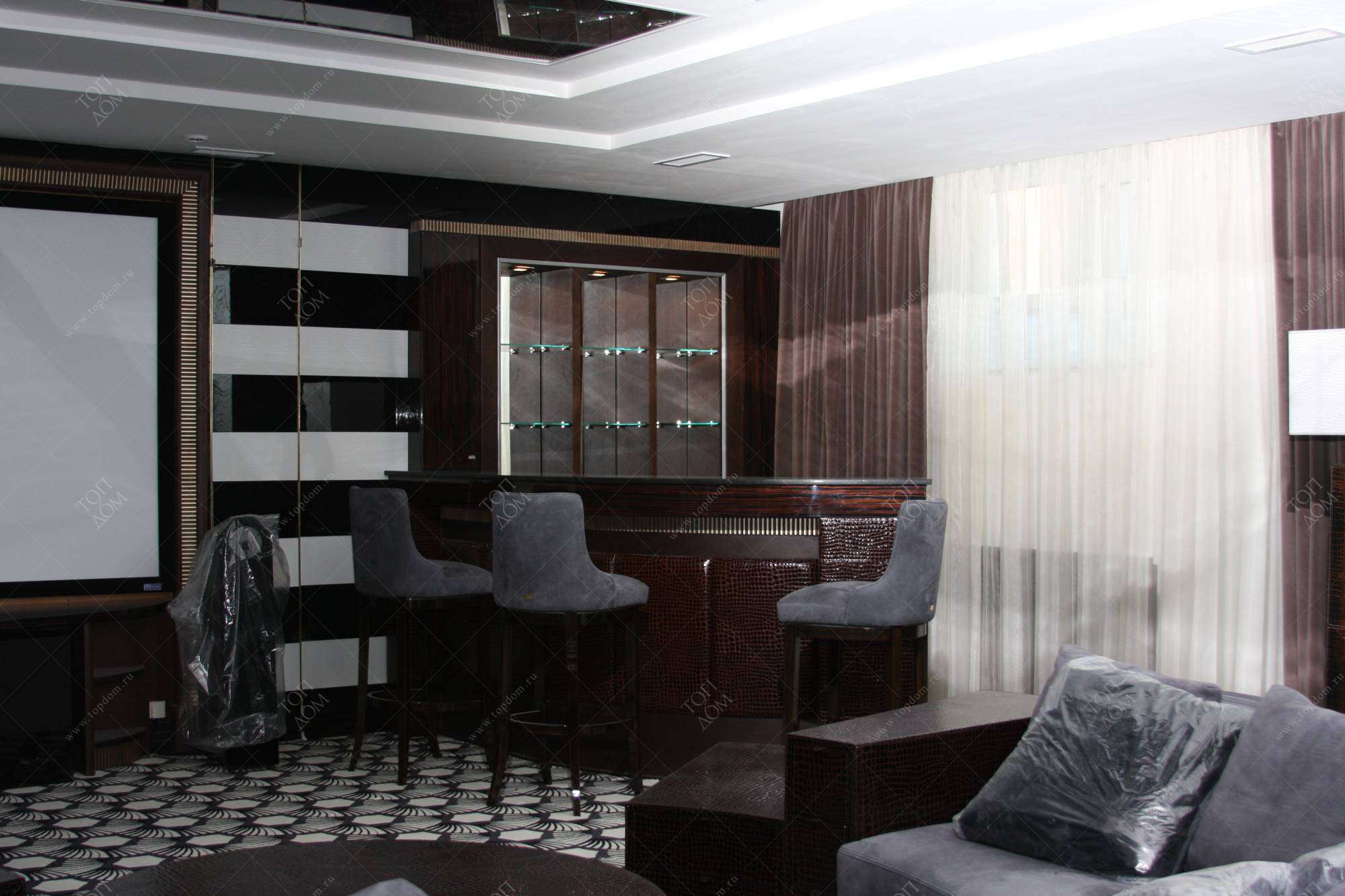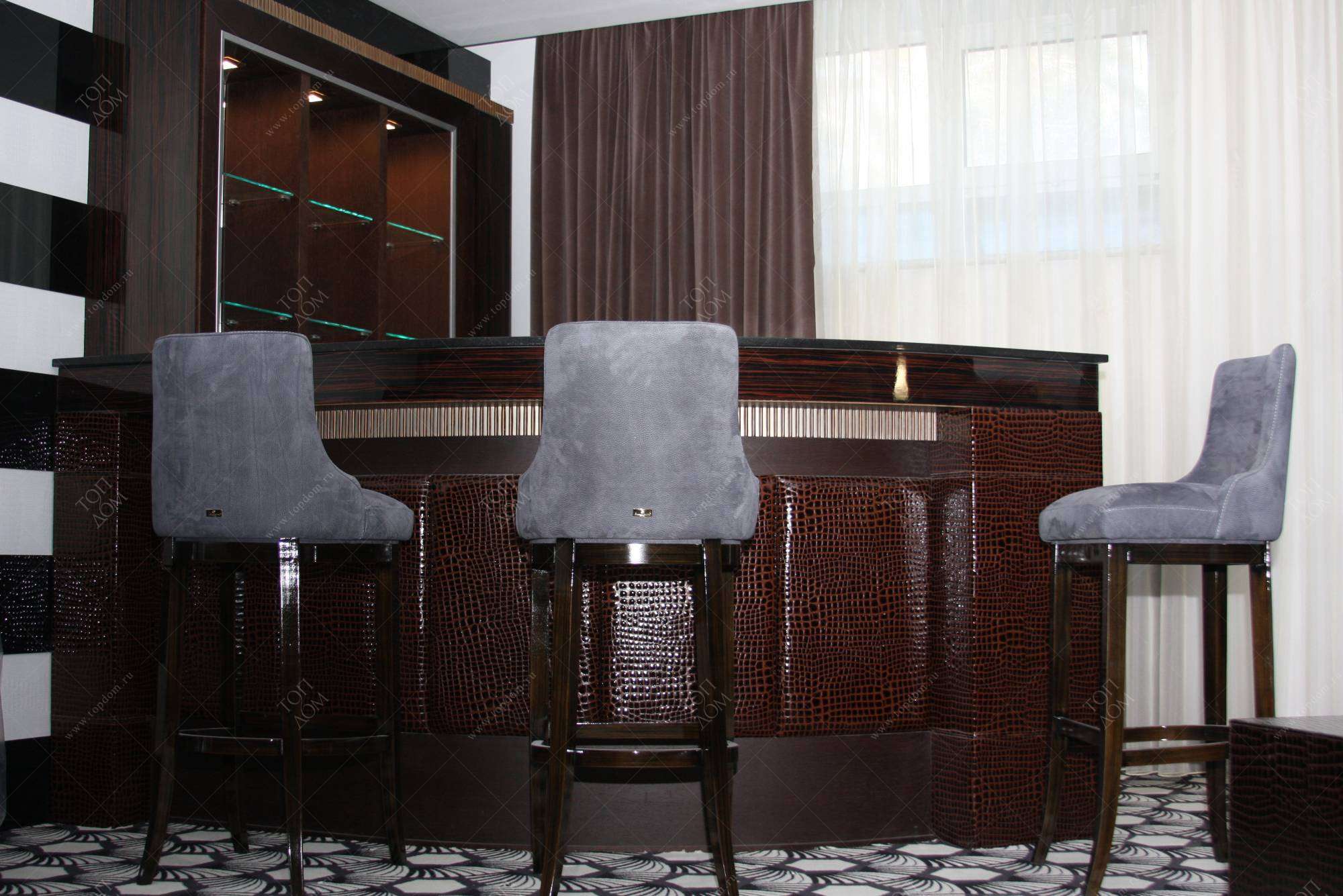 В примере обустройства большого дома по проекту «ТопДом» представлено характерное для стиля оформление столовой, зоны отдыха с высокими креслами, кухни с украшенными геометрическим узором фасадами, бильярдной с декорированной кожей барной стойкой, шкафами с серебристыми накладками.