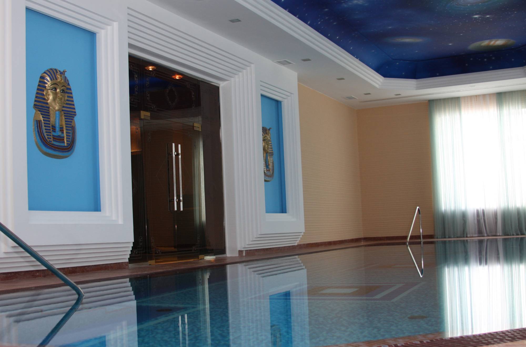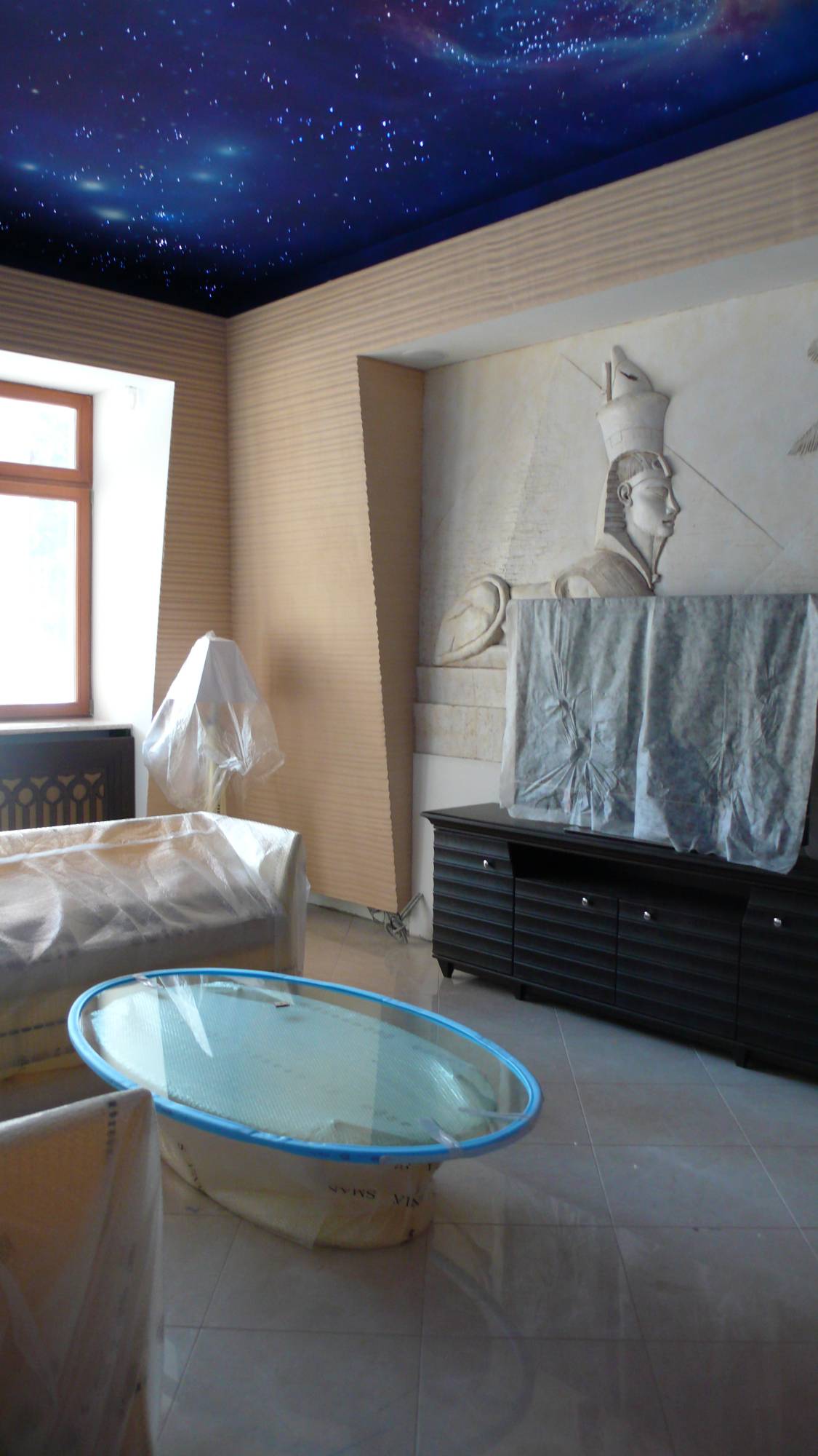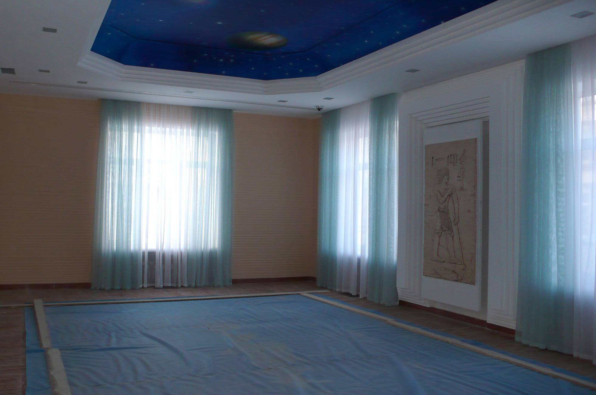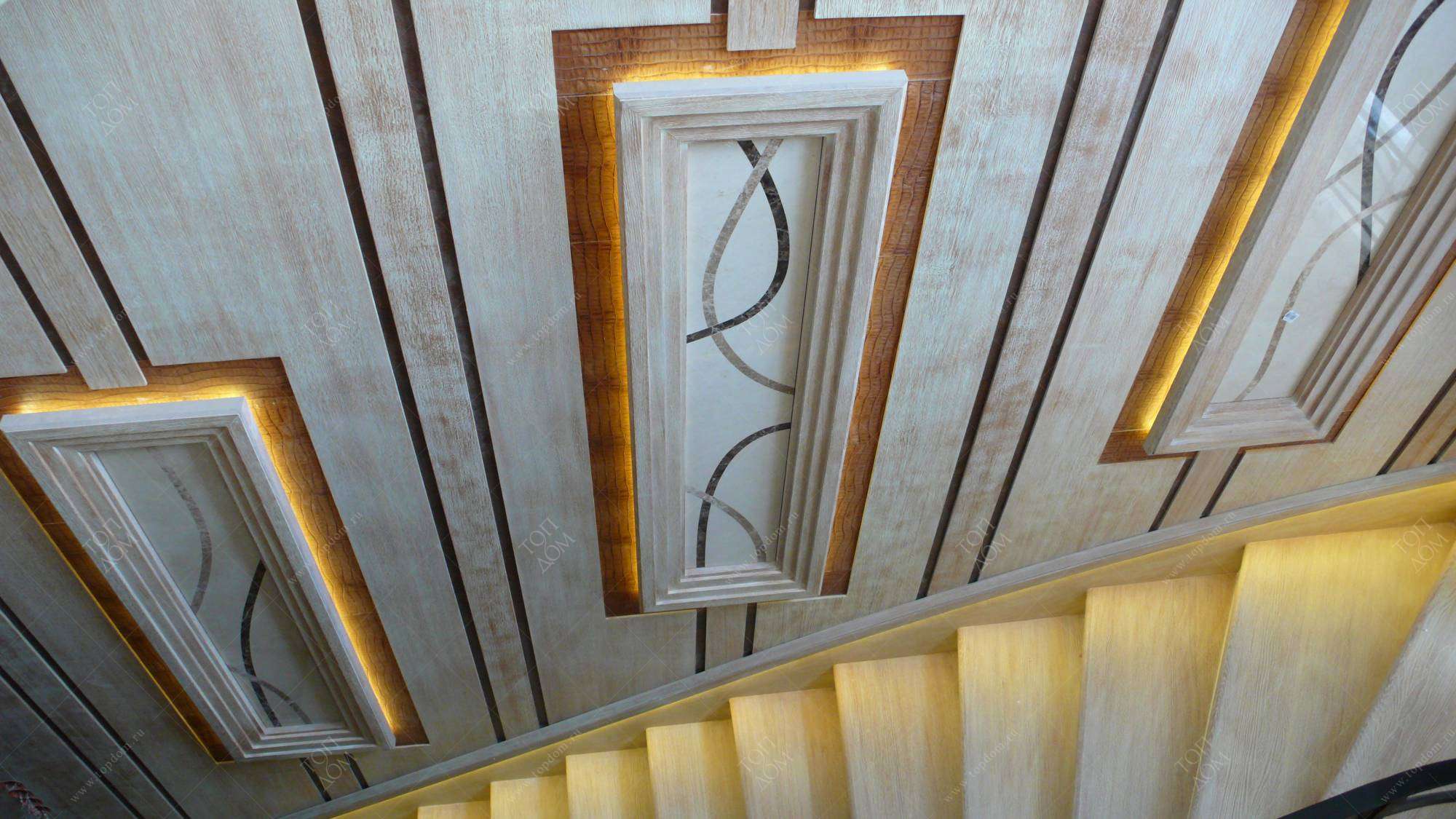 В проекте обустройства большого дома мастера-декораторы «ТопДом» украсили рельефными рисунками полукруглую стену в холле (крупный растительный орнамент), широкие фризы по периметру прихожей (флористика плюс морские раковины). В гостиной панно с изображением Сфинкса акцентирует внимание на ТВ-зоне, его дополняет объемная роспись на египетскую тематику.