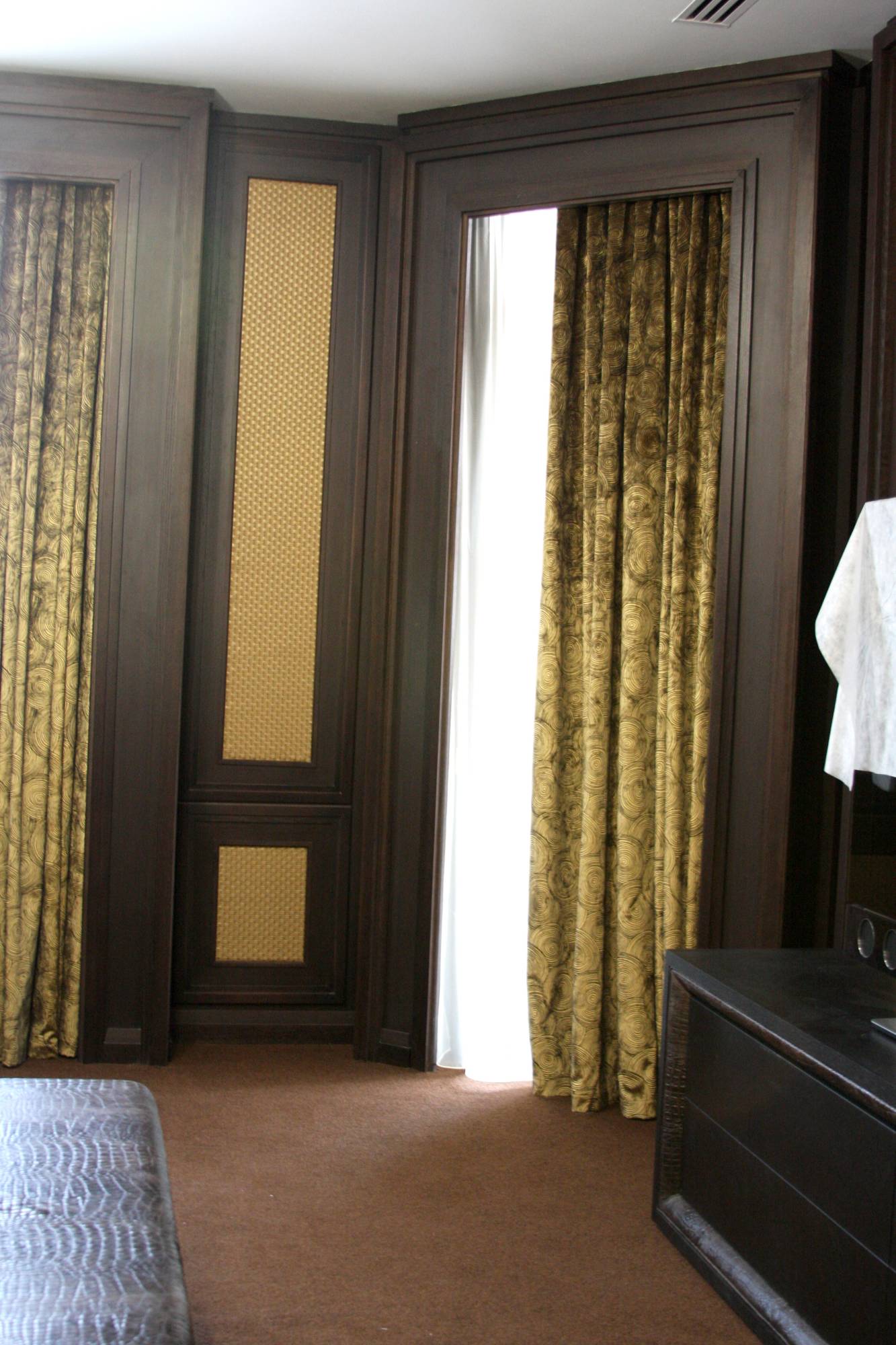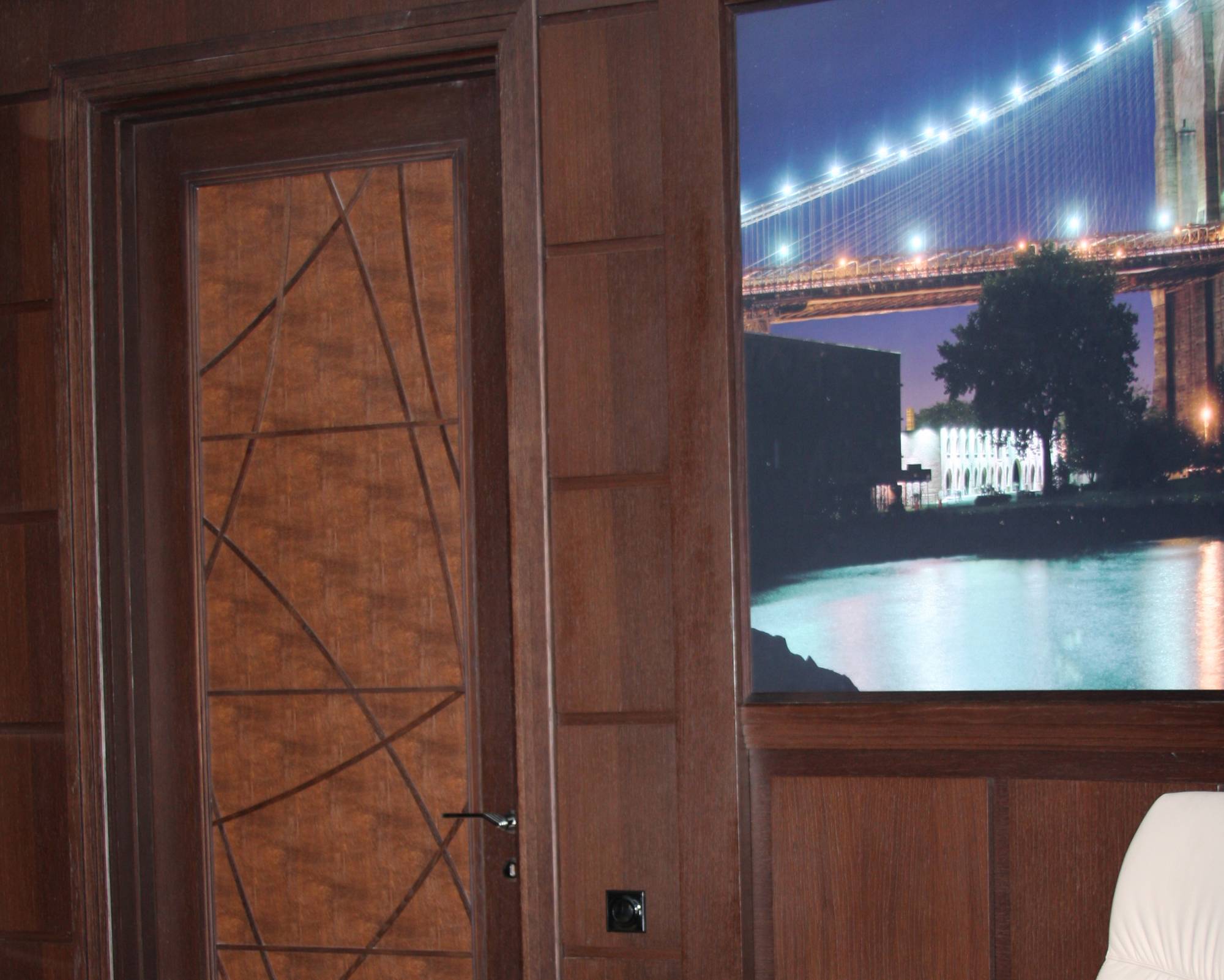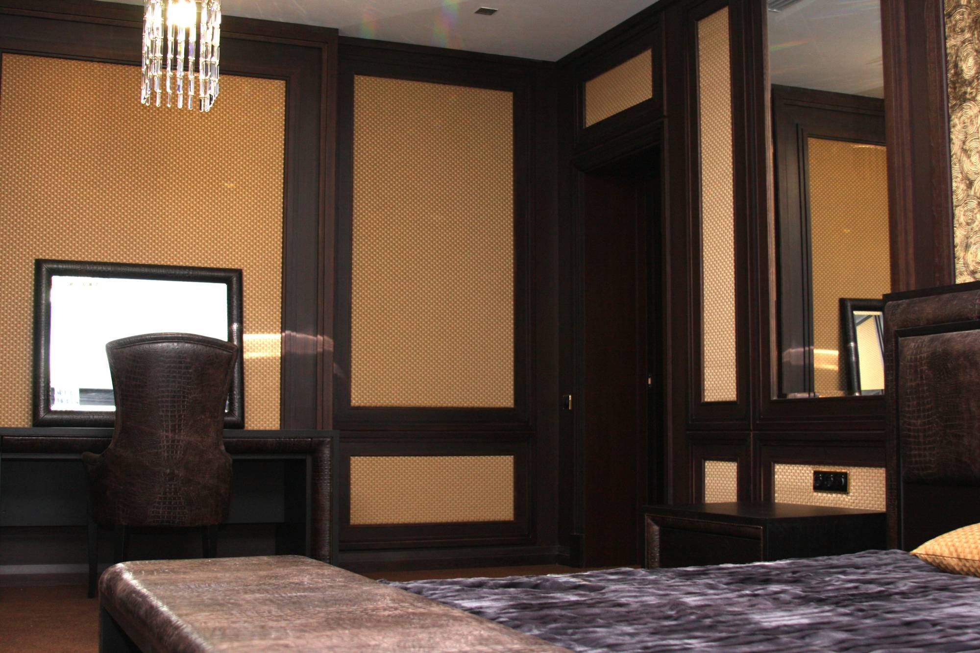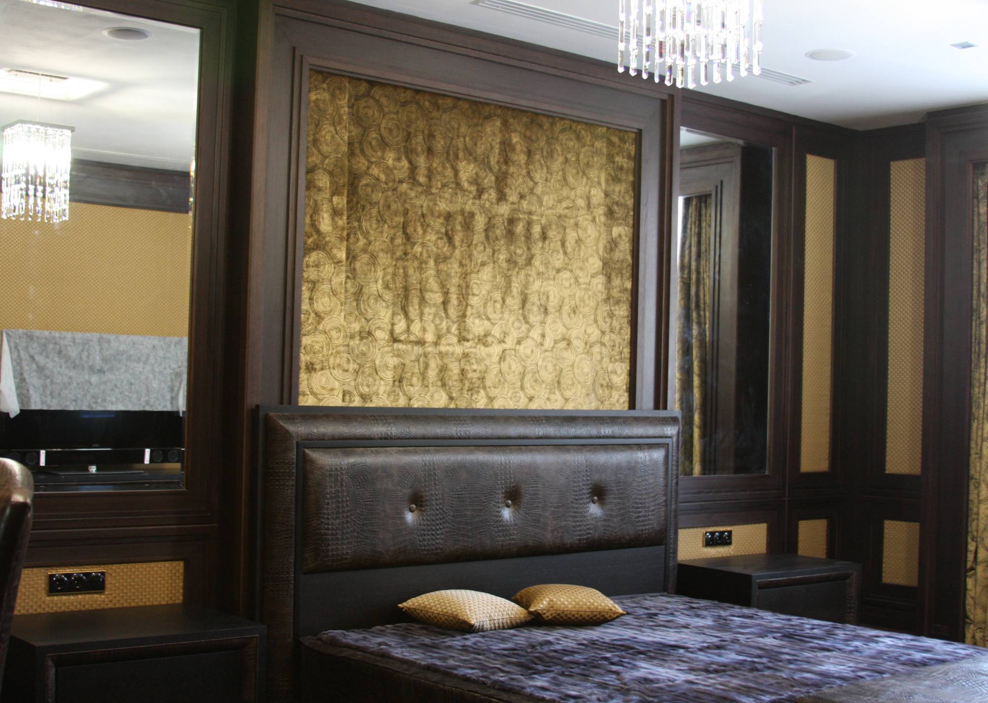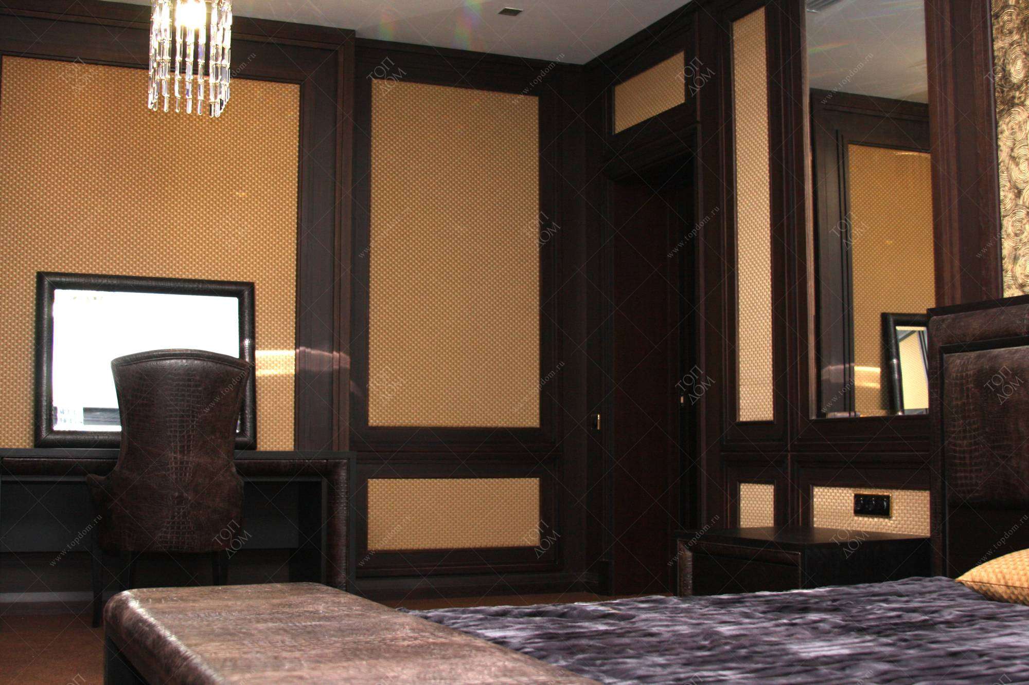 - в спальне кожей отделаны контуры туалетного столика и прикроватных тумб, изголовье кровати, рама зеркала;