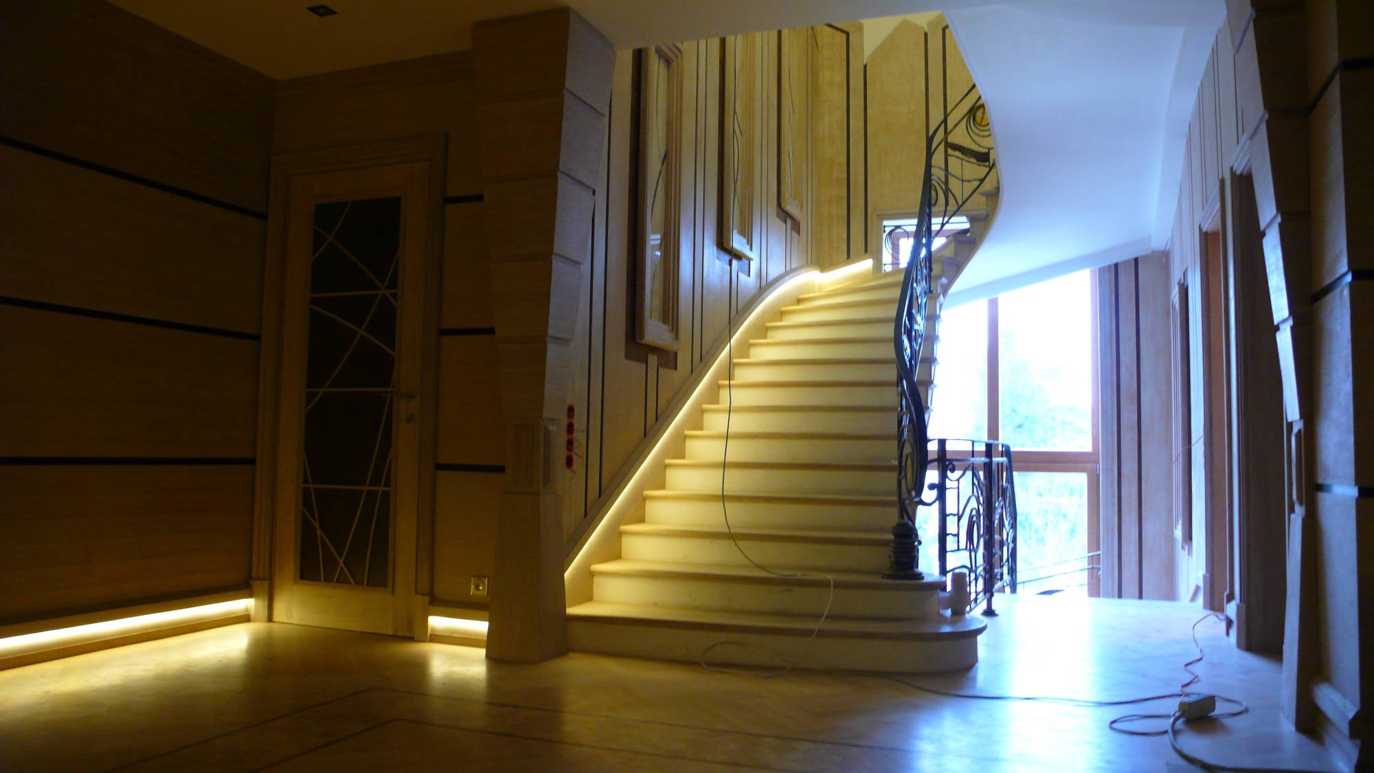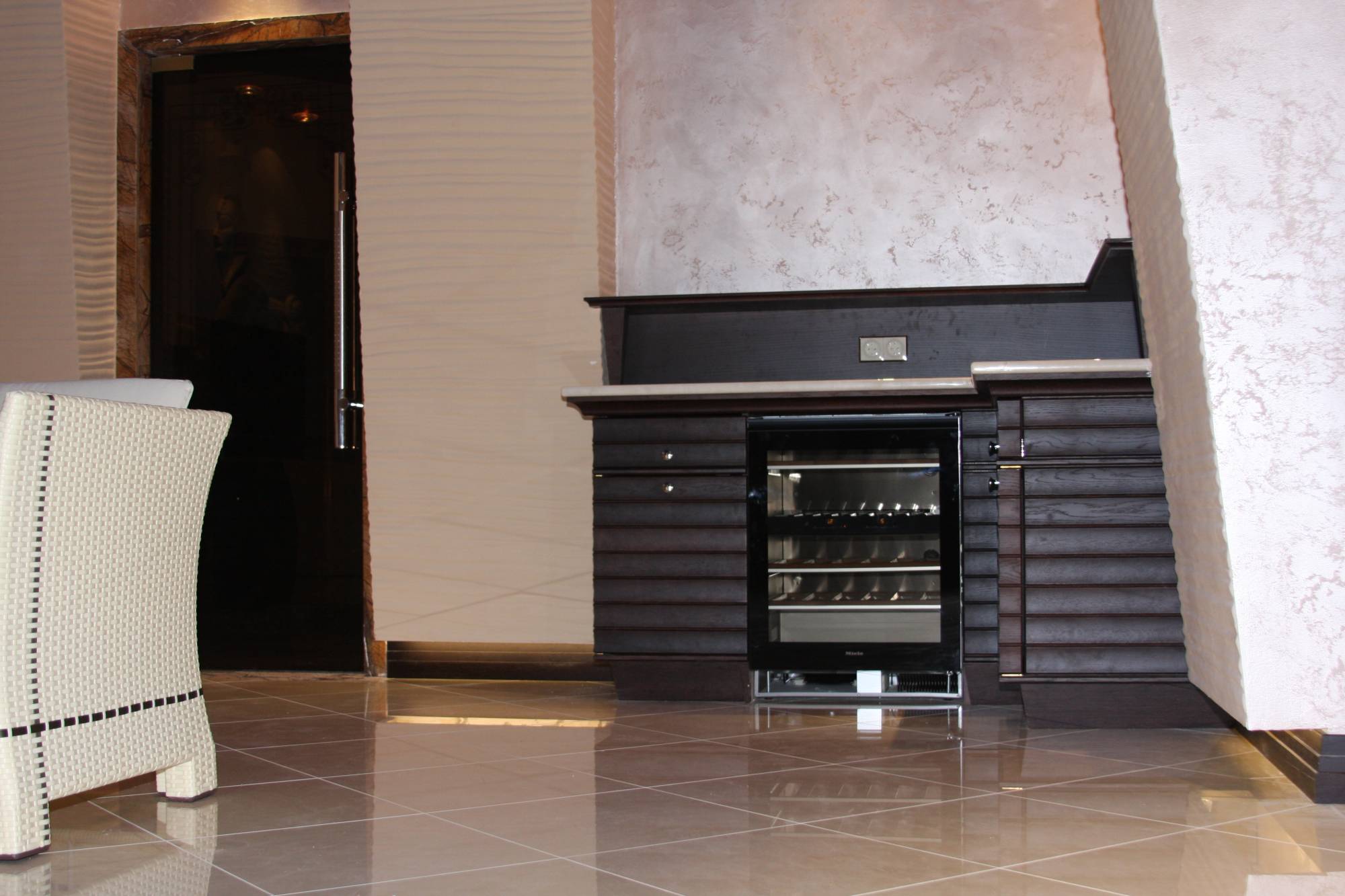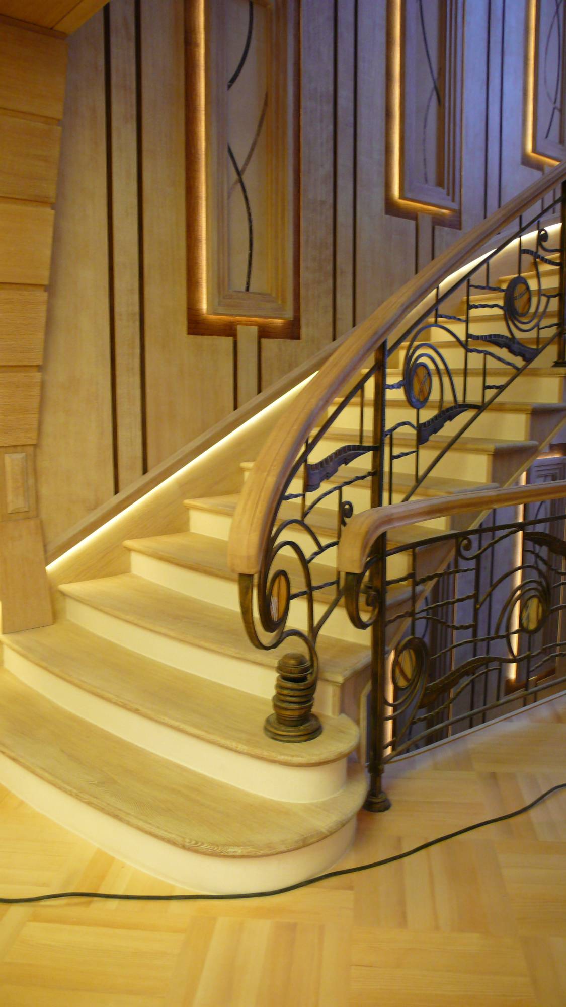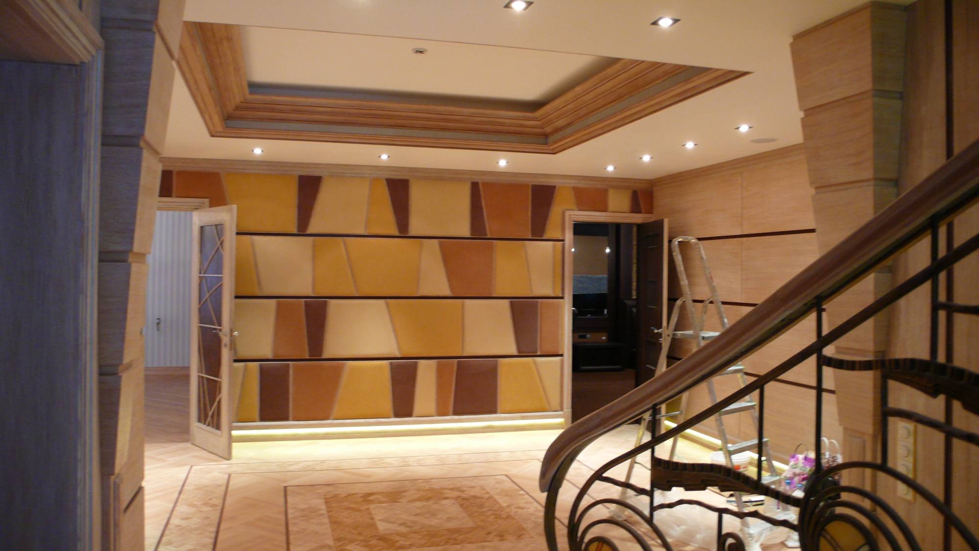 - кожей оформлены внутренние части ниш, выполненных на стене в зоне лестницы.
