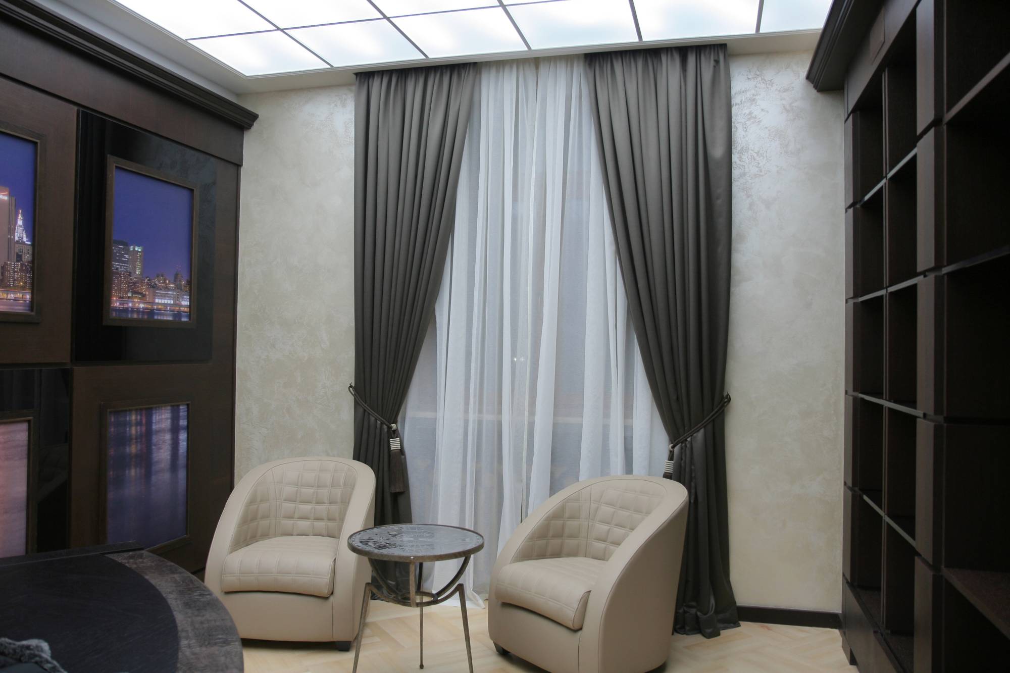 - однотонные предметы и плоскости – нейтральный фон, насыщенные черные и коричневые твердые поверхности, мягкая мебель синих, черных, бордовых и лиловых цветов;