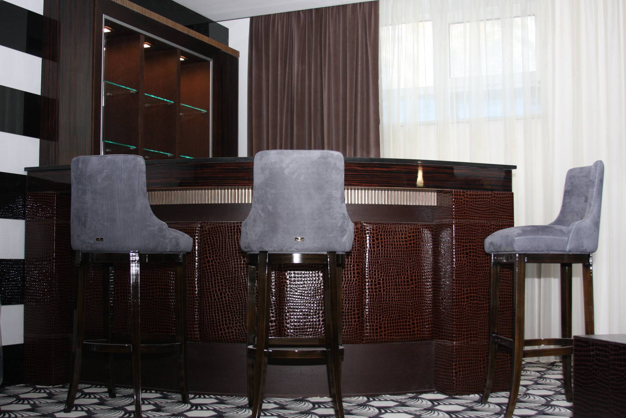 Арт-деко активно использует натуральную кожу не только в обивке мебели. Экстравагантность и шик обстановке придают отделанные кожей стены, пол, потолок, декорированные кожаными вставками аксессуары.