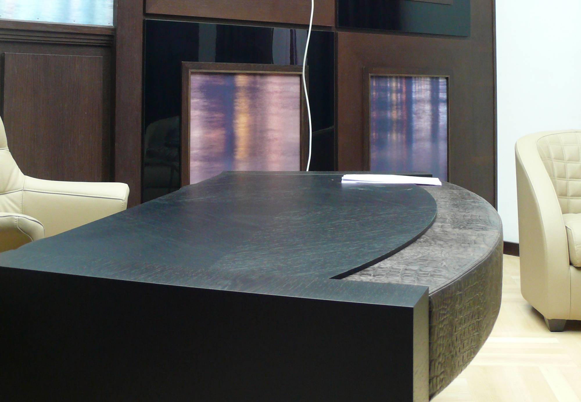 Оригинальные решения – оформленные кожей столешницы и ножки обеденного и письменного стола, комоды, зеркала, книжные полки. В работе используют только качественное сырье: патинированную или вощеную кожу со специальной влагостойкой пропиткой. Предметы интерьера могут быть полностью отделаны кожей или частично, т.к. она замечательно комбинируется c деревом, стеклом, хромом.