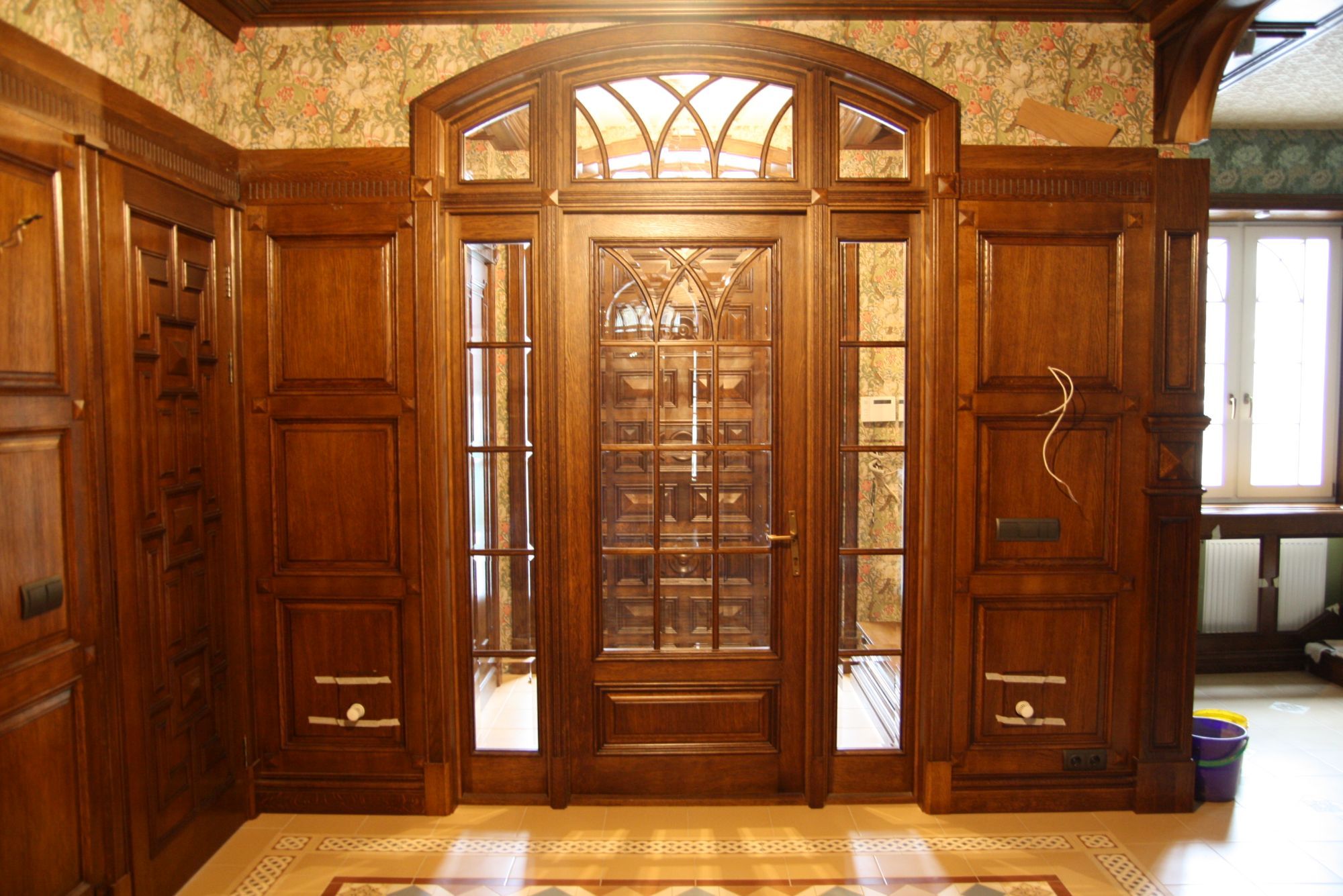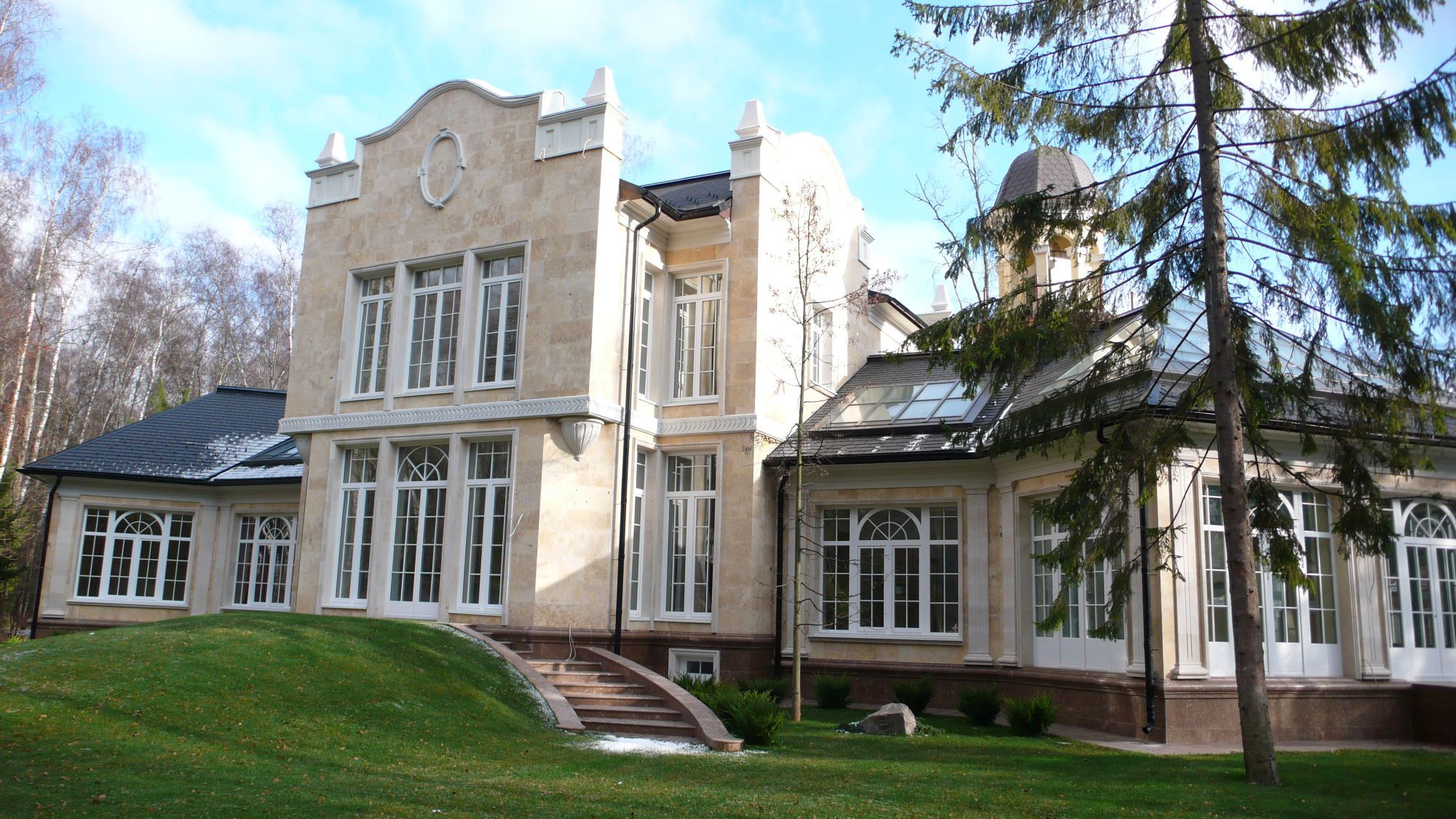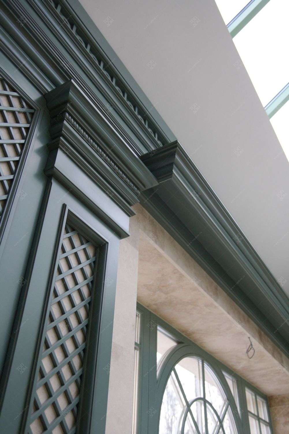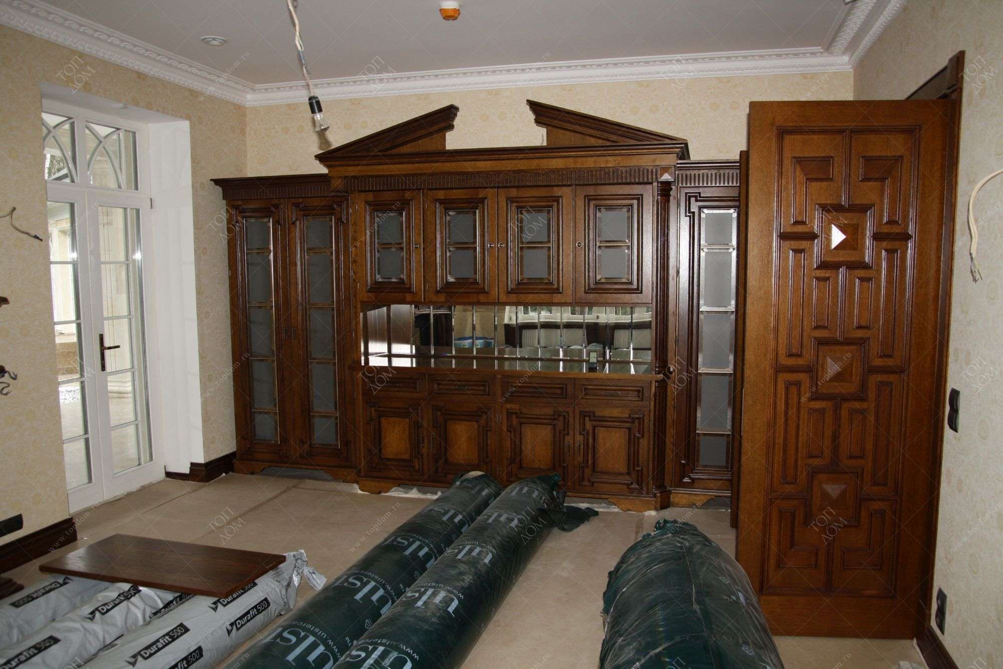 Во внутренней отделке частного дома мы реализовали эти преимущества, чтобы создать строгий классический дизайн интерьера. Здесь широко применяется темно-коричневая, светло-коричневая древесина, окрашенные поверхности белого, серо-голубого оттенка. Стены, дверные проемы, каминный портал, ниши с зеркалами отделаны природным деревом и декорированы резьбой, филенками, карнизами.