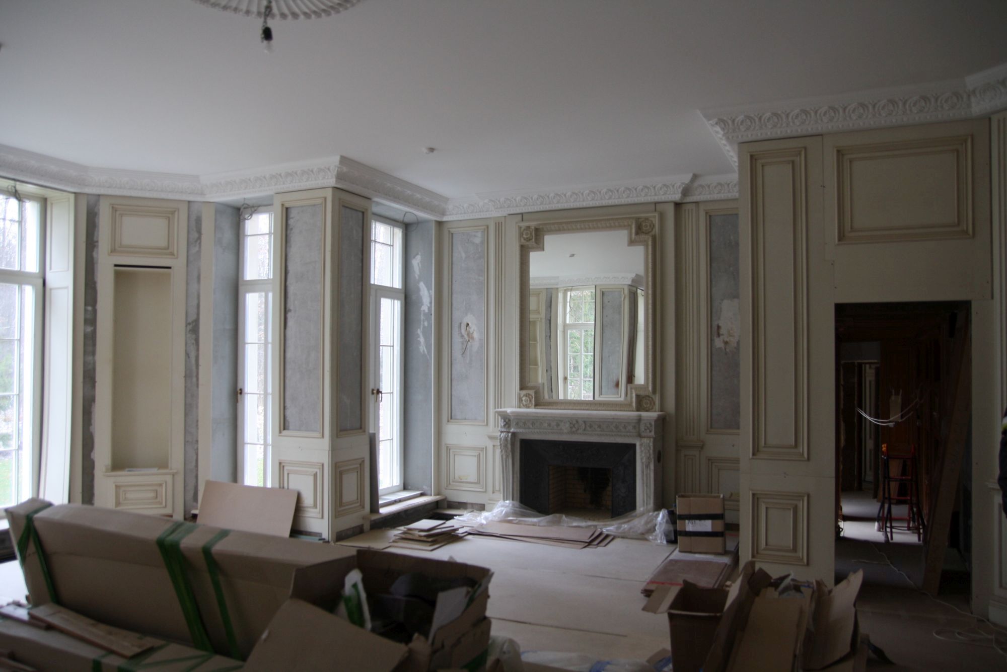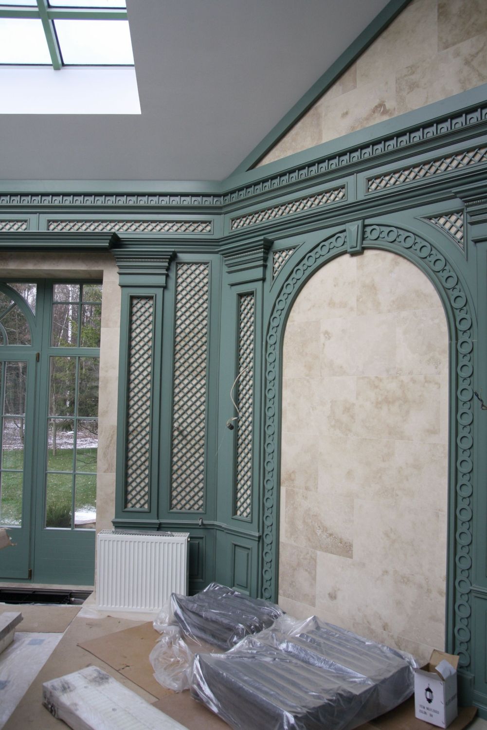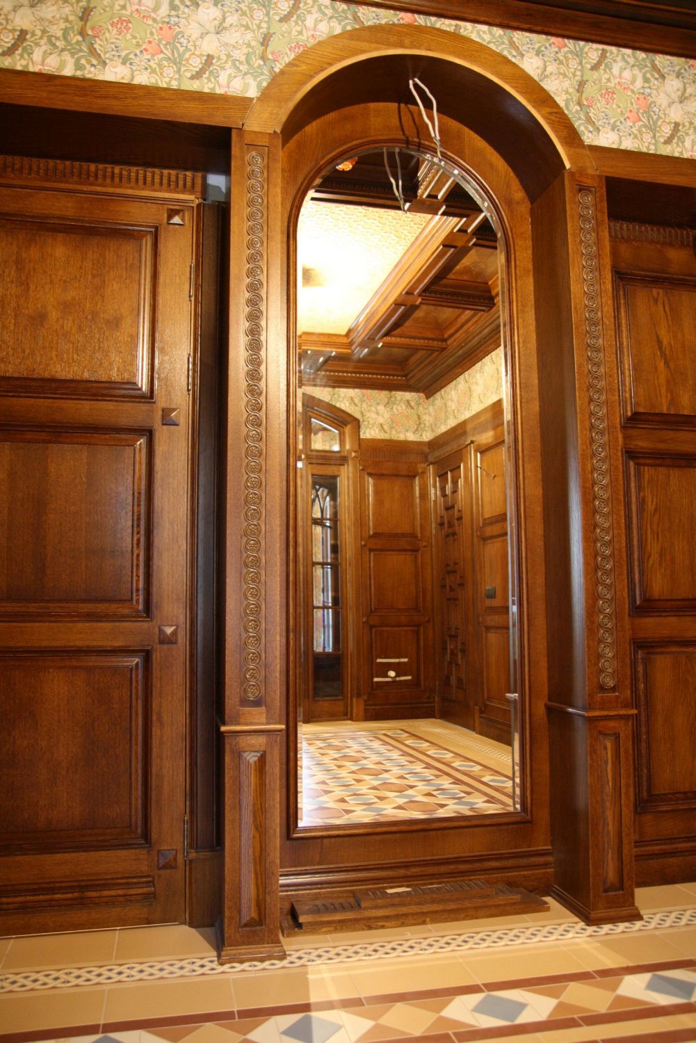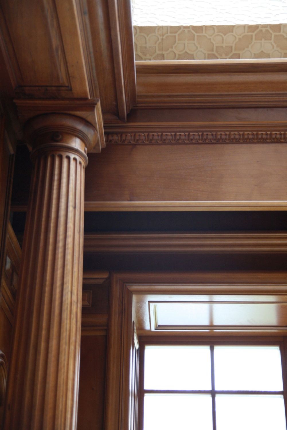 Во внутренней отделке частного дома мы реализовали эти преимущества, чтобы создать строгий классический дизайн интерьера. Здесь широко применяется темно-коричневая, светло-коричневая древесина, окрашенные поверхности белого, серо-голубого оттенка. Стены, дверные проемы, каминный портал, ниши с зеркалами отделаны природным деревом и декорированы резьбой, филенками, карнизами.