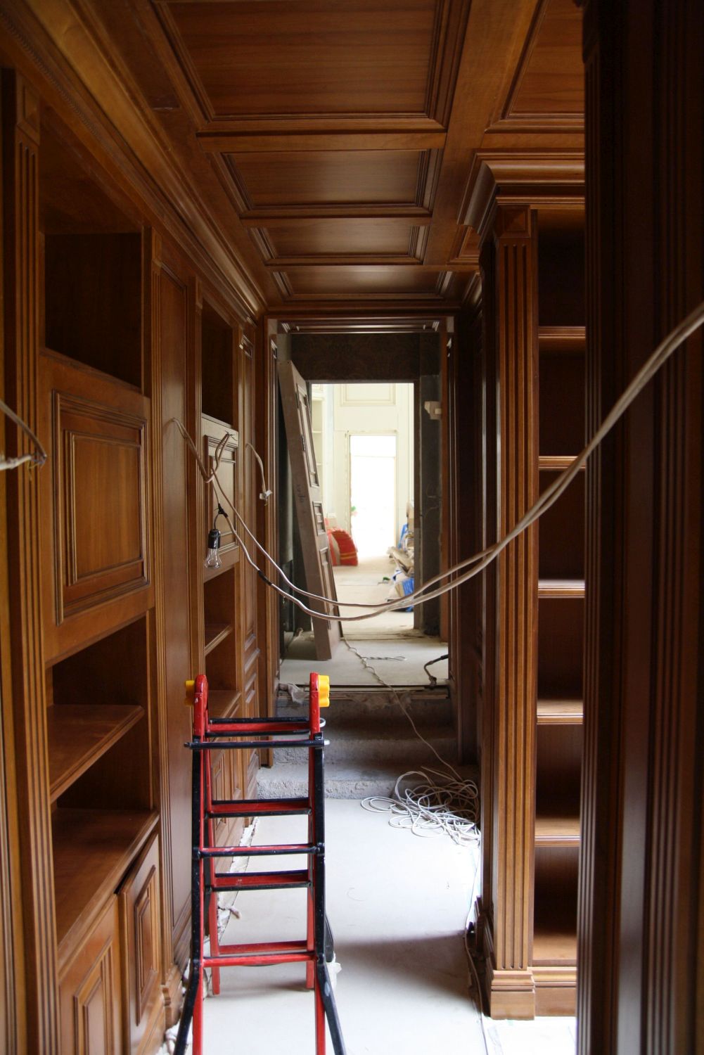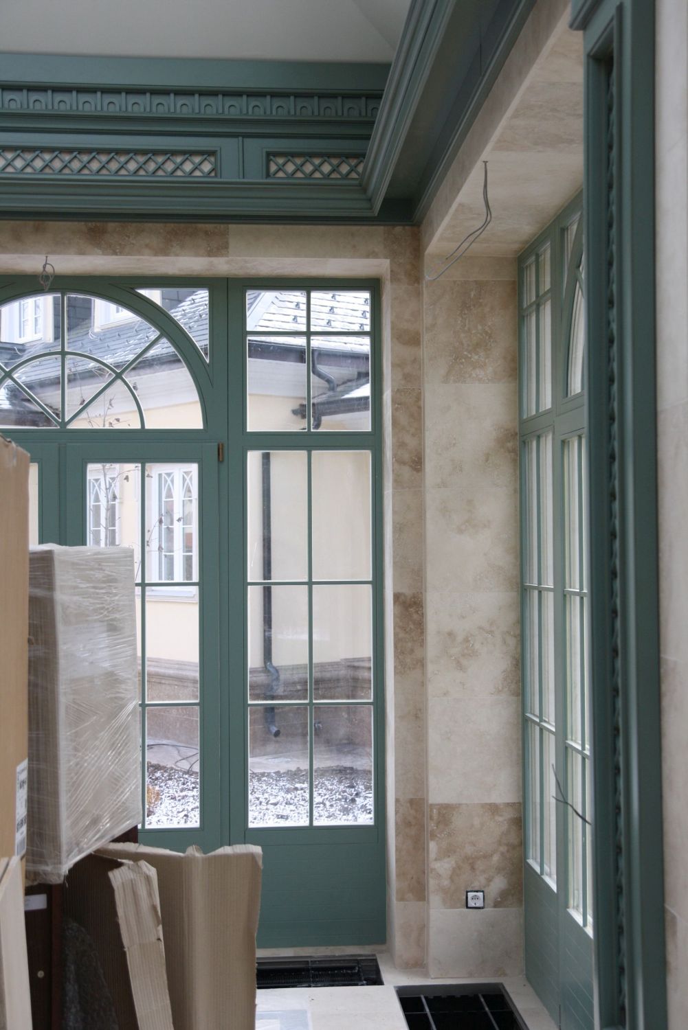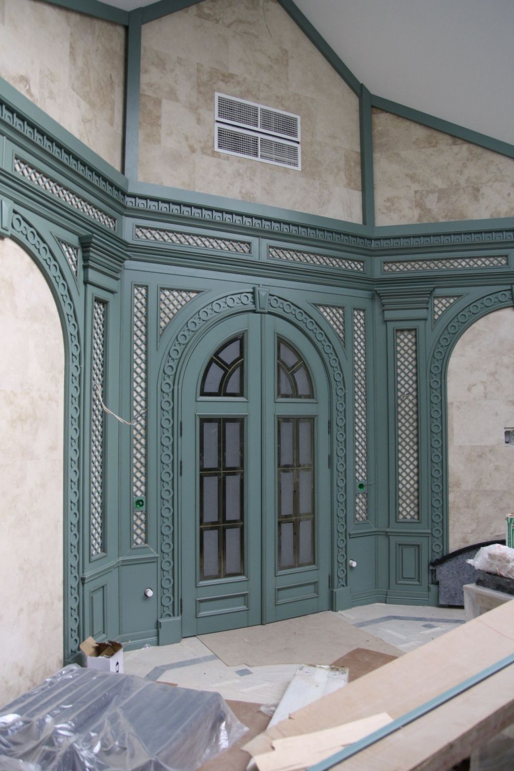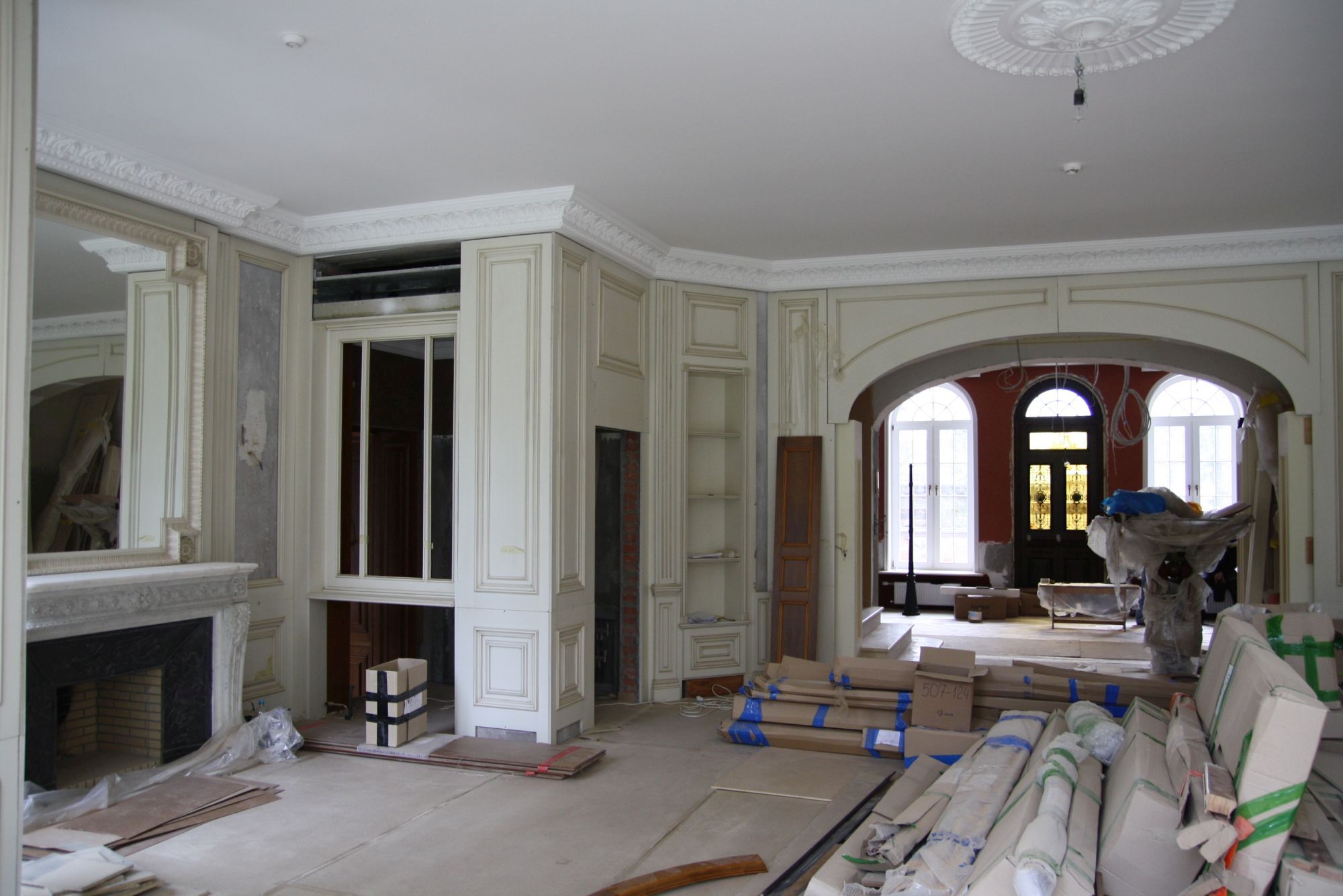 Во внутренней отделке частного дома мы реализовали эти преимущества, чтобы создать строгий классический дизайн интерьера. Здесь широко применяется темно-коричневая, светло-коричневая древесина, окрашенные поверхности белого, серо-голубого оттенка. Стены, дверные проемы, каминный портал, ниши с зеркалами отделаны природным деревом и декорированы резьбой, филенками, карнизами.