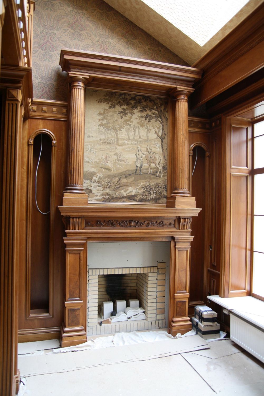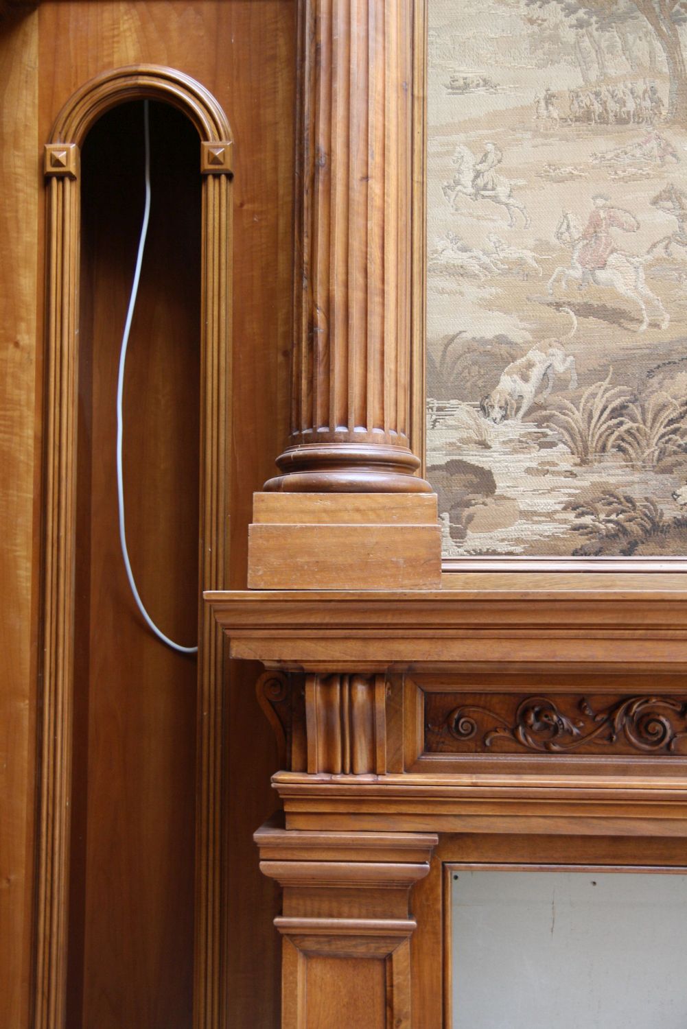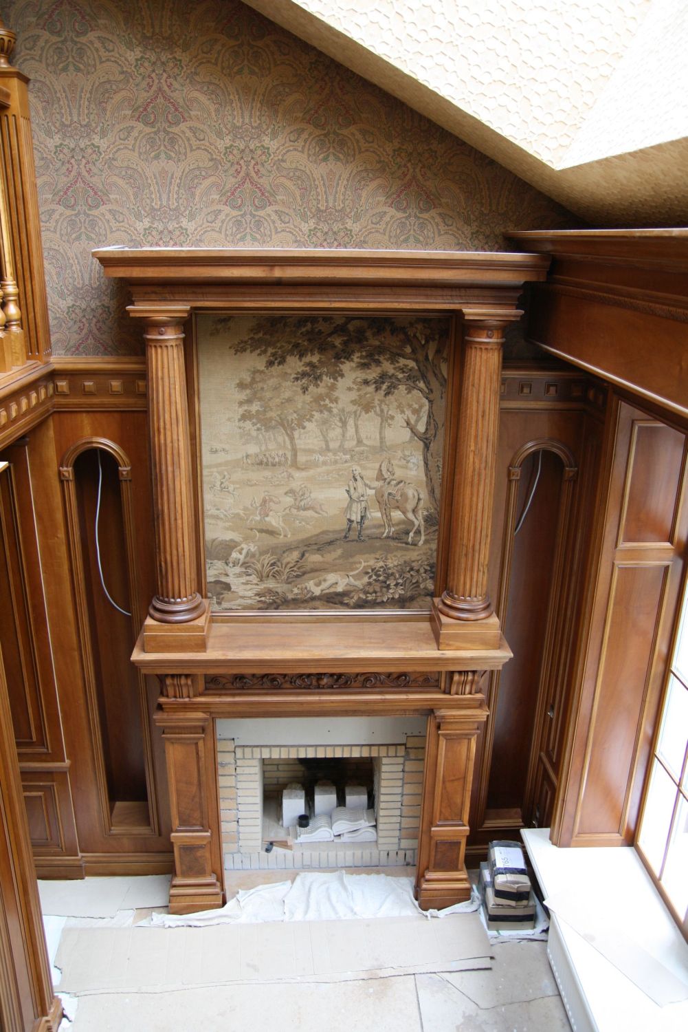 - над камином – серо-бежевые обои, перекликающиеся оттенками с гобеленом.
