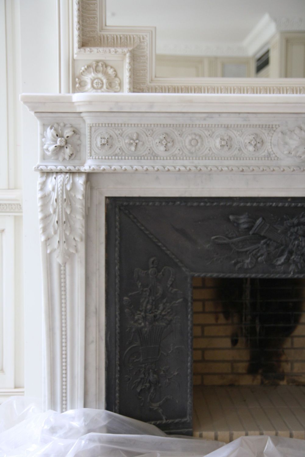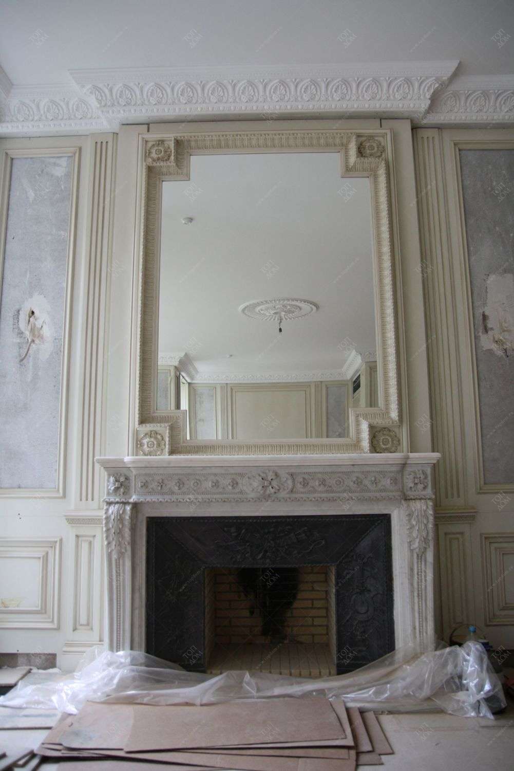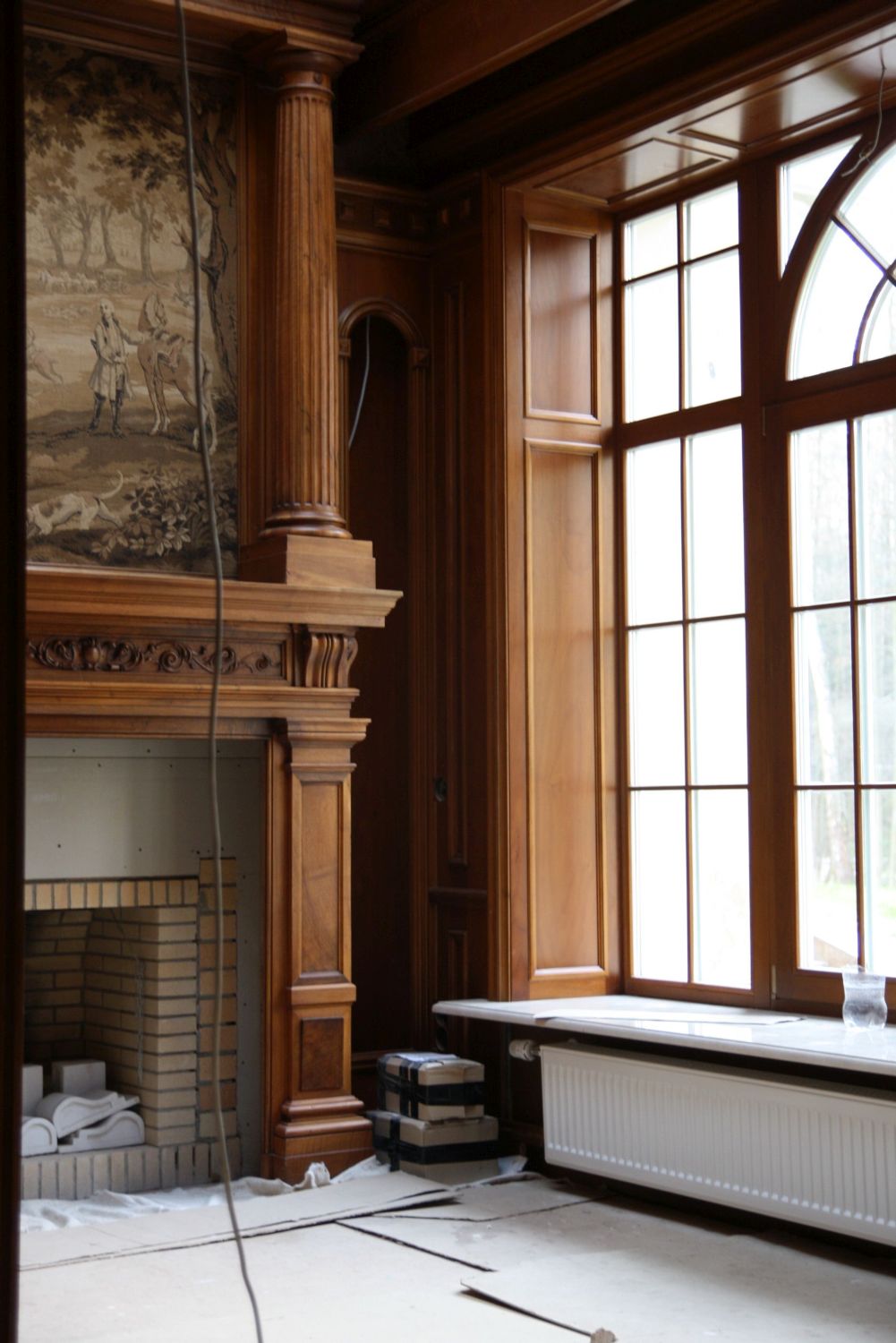 - над камином – серо-бежевые обои, перекликающиеся оттенками с гобеленом.