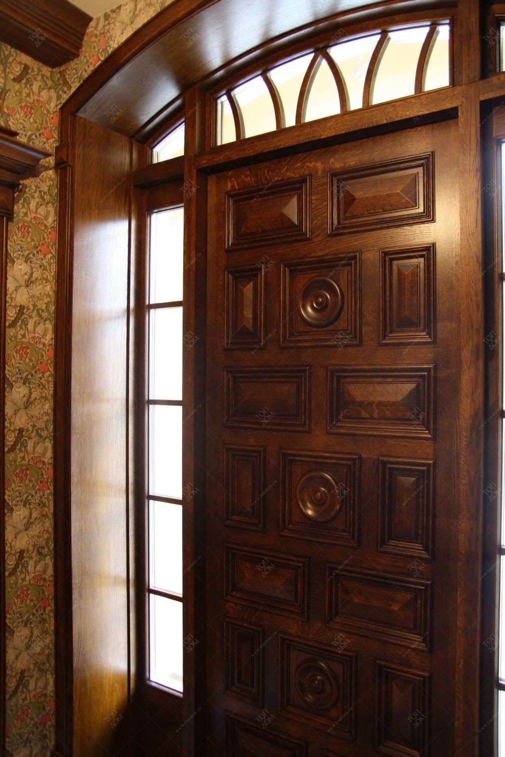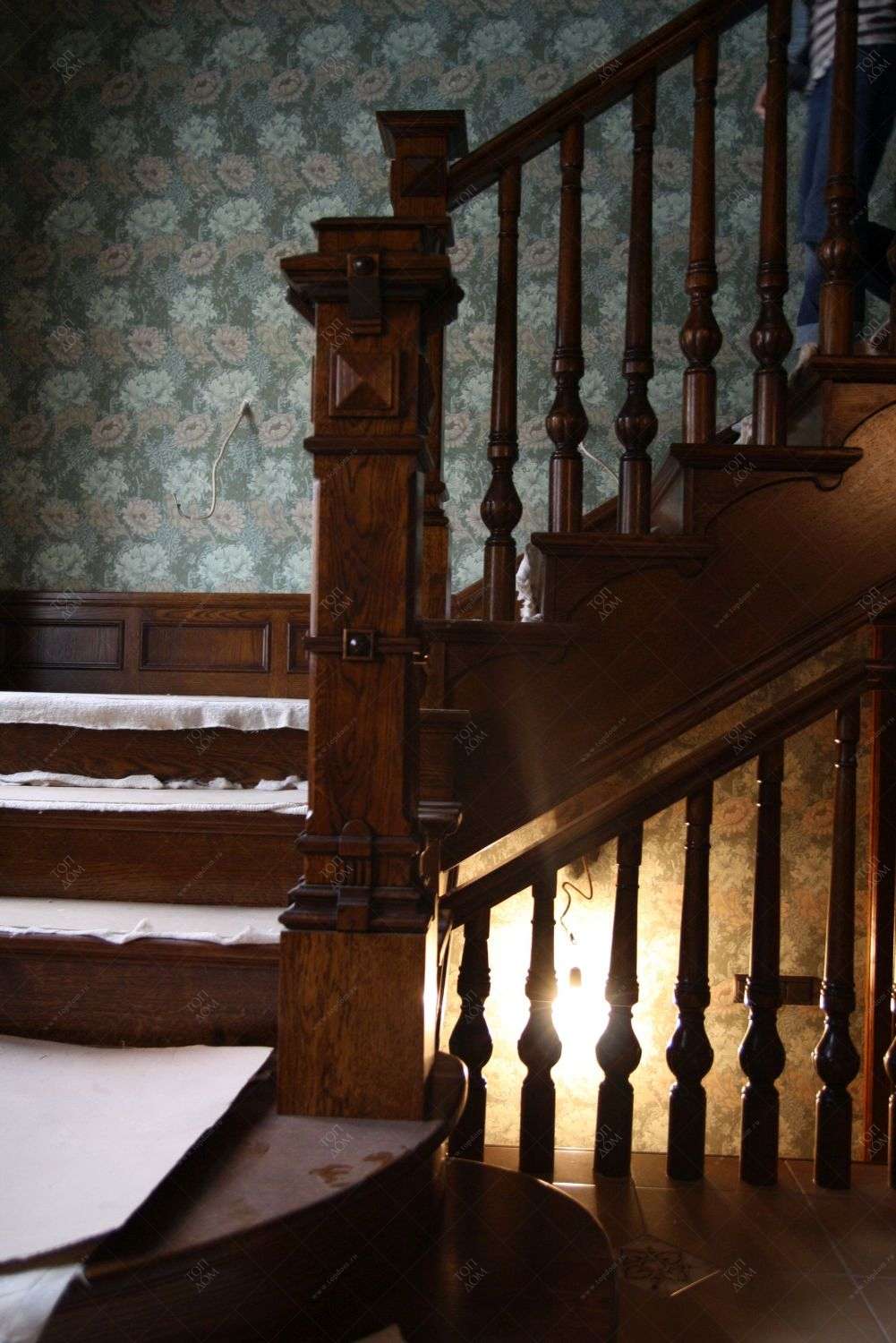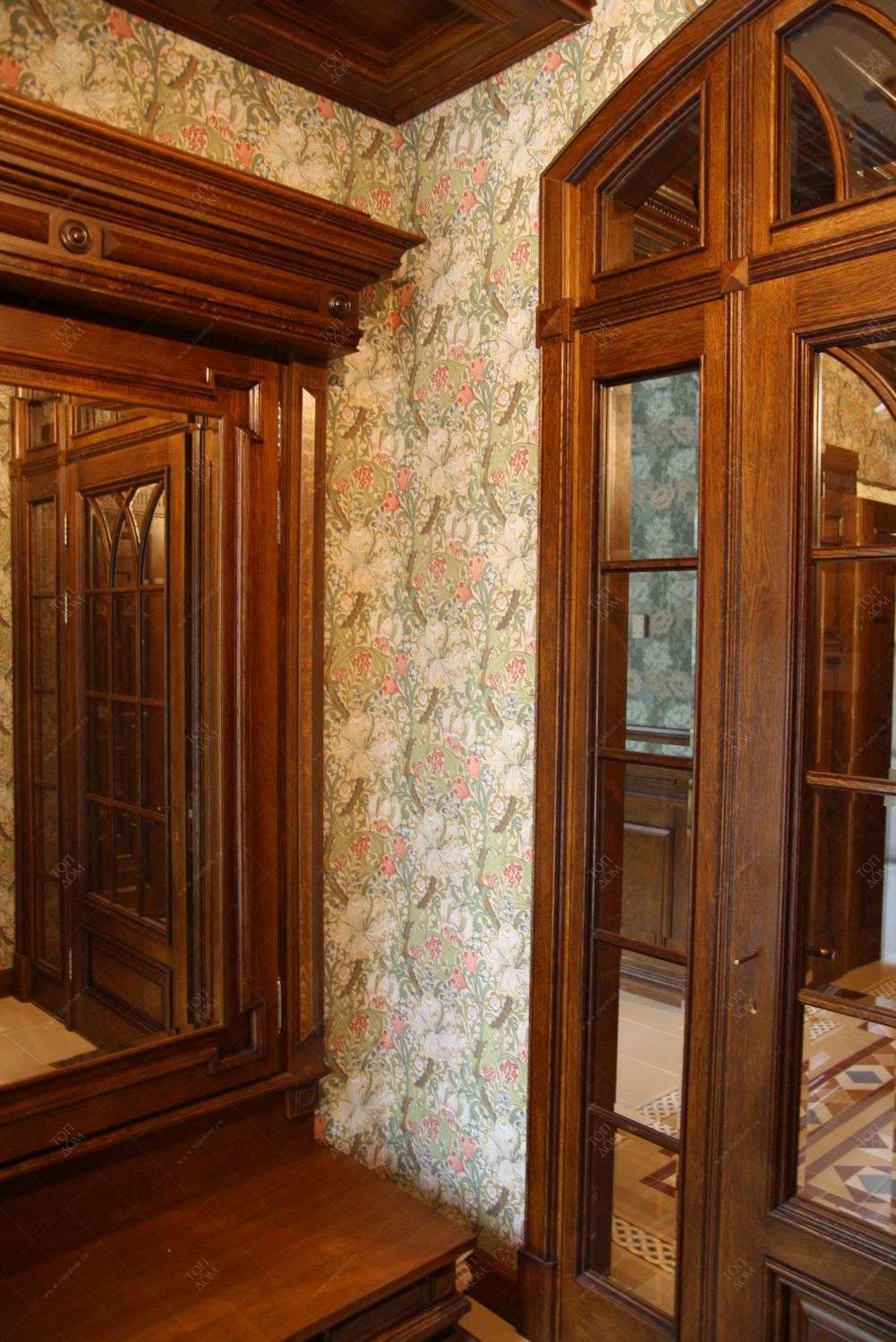 К примеру, в реализованном ремонте загородного дома коричневое дерево красиво сочетается с обоями растительного орнамента: