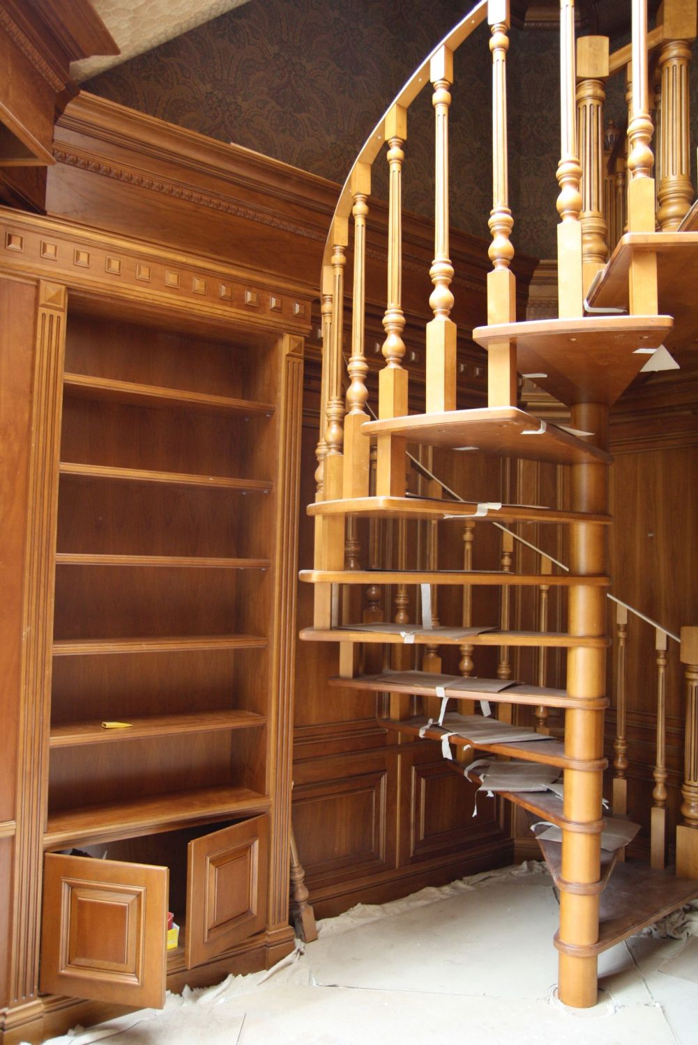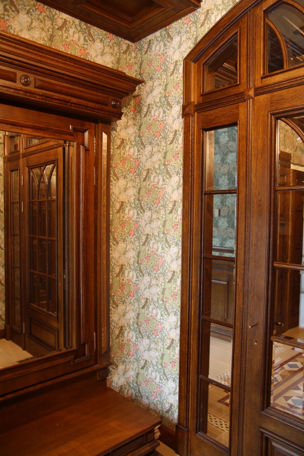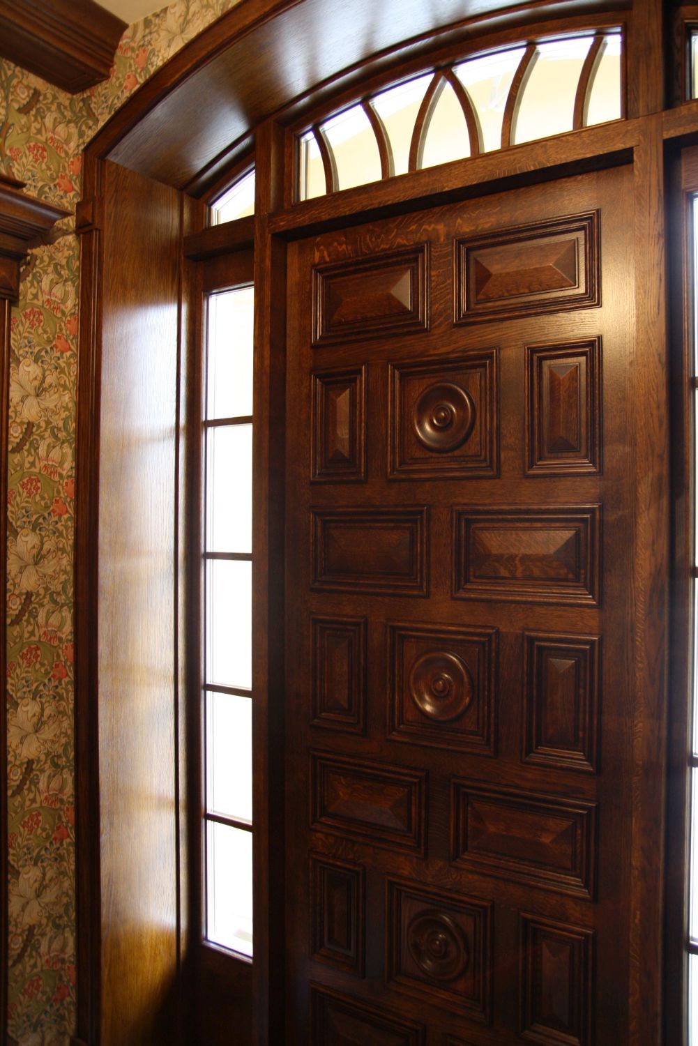 К примеру, в реализованном ремонте загородного дома коричневое дерево красиво сочетается с обоями растительного орнамента: